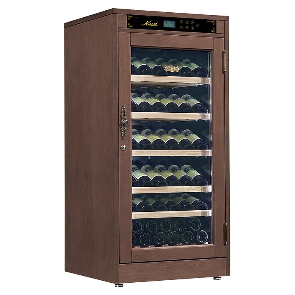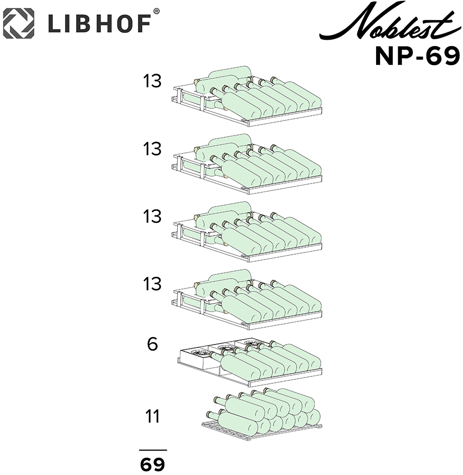 Винный шкаф Libhof Noblest NP-69 предназначен для хранения при оптимальных условиях бутилированного вина различных сортов в барах, ресторанах, специализированных магазинах, подсобных складских помещениях, а также в домашних условиях. Модель оснащена холодильной камерой с 4 демонстрационными полками, полкой с ванночкой и укороченной полкой, распашной дверью на внутренних петлях с замком, прозрачным обзорным стеклом и сенсорной панелью управления с дисплеем. Корпус выполнен из американского дуба, полки - из массива бука.