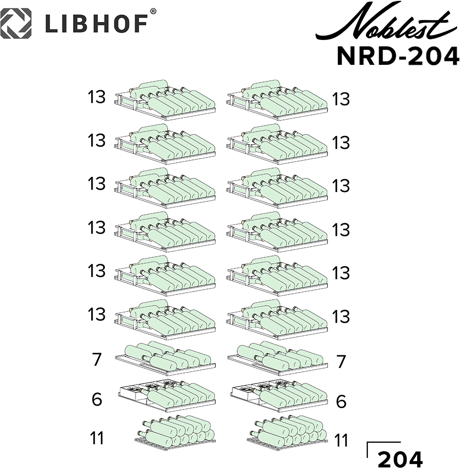Винный шкаф Libhof Noblest NRD-204 предназначен для хранения при оптимальных условиях бутилированного вина различных сортов в барах, ресторанах, специализированных магазинах, подсобных складских помещениях, а также в домашних условиях. Модель оснащена 2 холодильными камерами с 6 демонстрационными полками в каждой, 2 полками с ванночкой и 2 укороченными полками, распашными дверьми на внутренних петлях с замками, прозрачными обзорными стеклами и сенсорной панелью управления с дисплеем на каждой камере. Корпус выполнен из американского дуба, полки - из массива бука.