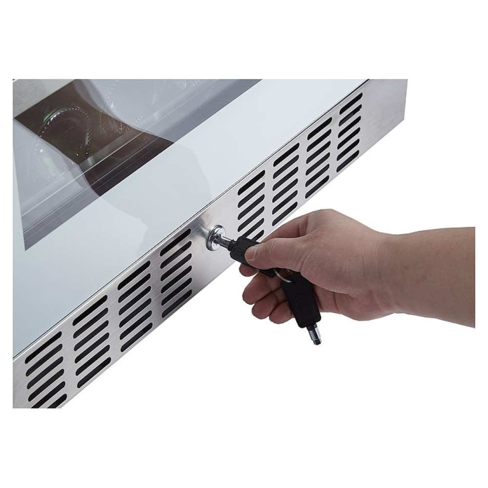 В комплект поставки входят 8 полок с направляющими для размещения бутылок, ключ от дверного замка и инструкция по эксплуатации.