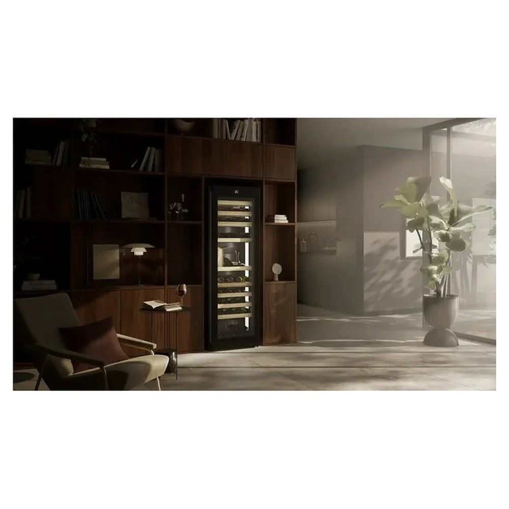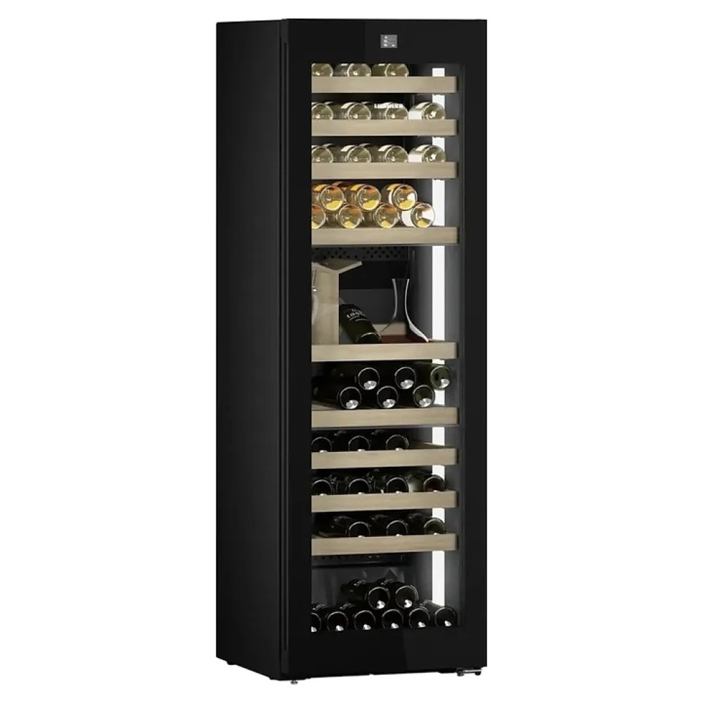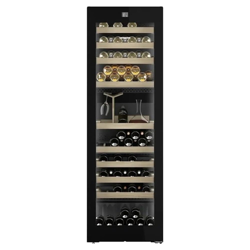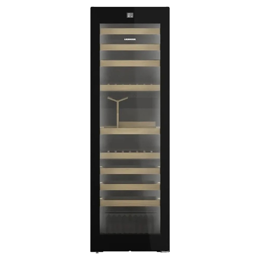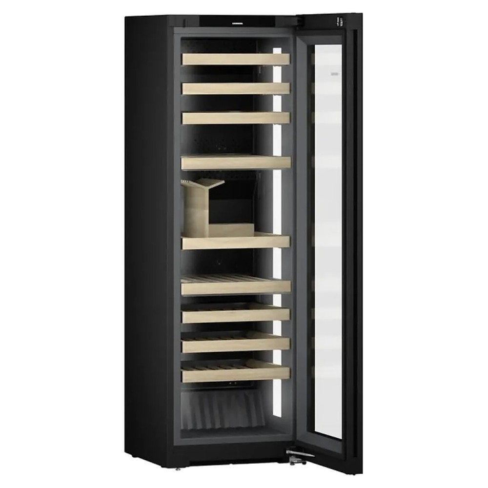 Винный шкаф Liebherr WPgbi 5283 серии Vinidor Selection предназначен для охлаждения и хранения при оптимальных условиях бутилированного вина различных сортов в барах, ресторанах, специализированных магазинах, подсобных складских помещениях, а также домашних условиях. Модель оснащена холодильной камерой с 2 независимыми температурными зонами, правосторонней распашной дверью на перенавешиваемых петлях с обзорным остеклением, кабелем питания с евровилкой, расположенным в верхней части фасада двери сенсорным цветным дисплеем управления и индикации. Боковины и сухая задняя панель выполнены из легированной стали с устойчивой к царапинам и отпечаткам пальцев сатинированной вертикальными штрихами поверхностью BlackSteel оттенка черная сталь, дверь с фасадом GlassBlack с полным фронтальным остеклением без винтового крепежа, полки и доска сомелье – из массива буковой древесины, упаковка – из гофрокартона, полимерной пленки и полистирола.