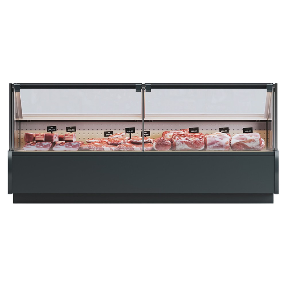Холодильная витрина MAGMA Beryl plug-in 2500 предназначена для демонстрации, продажи и кратковременного хранения мясной и рыбной гастрономии, сыров, молочной продукции, кондитерских изделий и другой продукции. Модель оснащена охлаждаемым бункером (запасником) и LED-освещением внутреннего объёма. Корпус и поддоны изготовлены из высококачественной нержавеющей стали, суперструктура - из полнотелого алюминиевого профиля, фронтальная панель - из закаленного ударопрочного стекла на гидроподъемниках, столешница - из нержавеющей стали повышенной прочности.