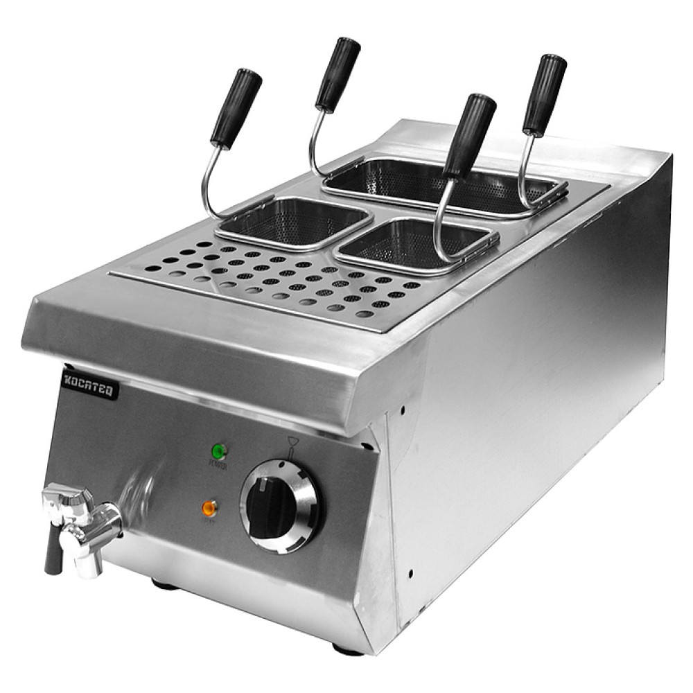 Макароноварка Kocateq 0M0CP1E класса Medium-Duty используется на предприятиях общественного питания и торговли для отваривания и размораживания кукурузы, фрикаделек, макаронных изделий, пельменей, вареников, овощей, фруктов и прочих продуктов. Модель оснащена механическим термостатом для регулировки температуры и защитным термостатом. Ванна выполнена из специальной стали толщиной 1,5 мм, декоративные ручки с накладками - из нержавеющей стали, поверхности, соприкасающиеся с продуктами, выполнены из нержавеющей стали AISI 304 толщиной 1 мм, дно и задняя стенка - из нержавеющей стали AISI 201 толщиной 1 мм.