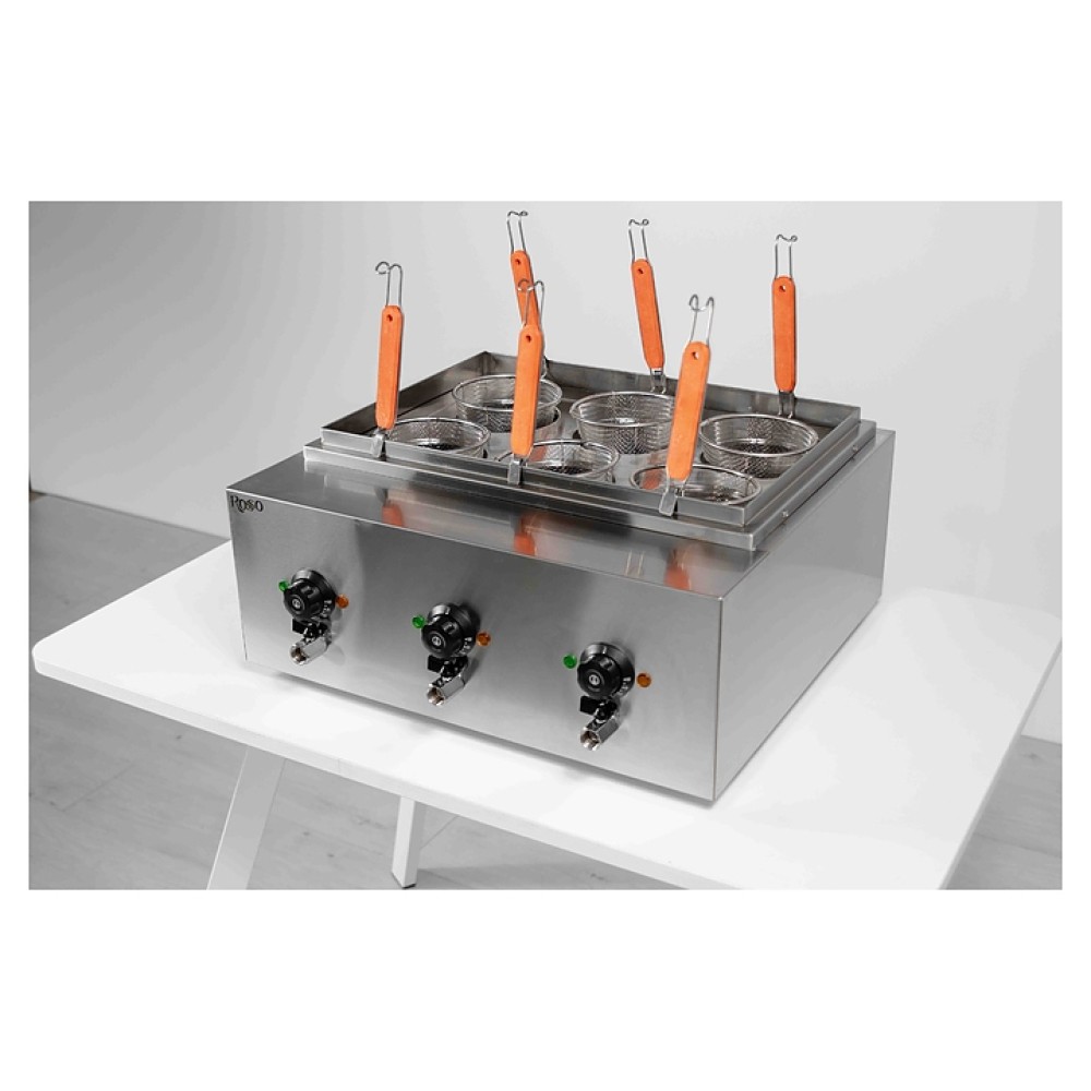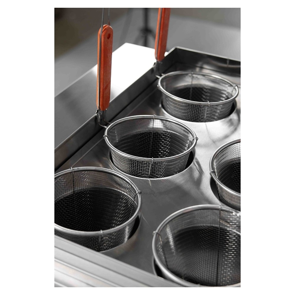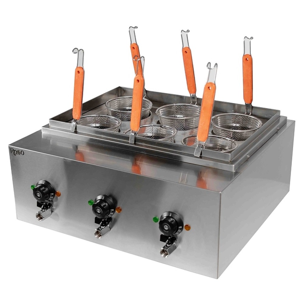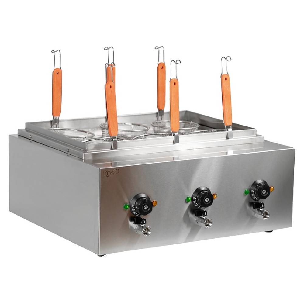 Макароноварка Rosso HEN-6A используется на предприятиях общественного питания и торговли для варки пельменей, вареников, макаронных изделий, кукурузы, фрикаделек и овощей. Заполнение аппарата водой производится вручную. Внутри аппарат разделен на секции, что предотвращает смешивание вкусов во время приготовления блюд. Корпус выполнен из нержавеющей стали.