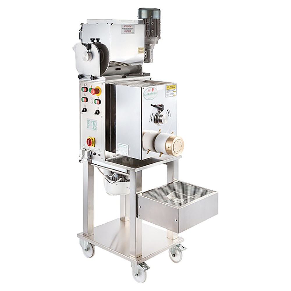 Машина для производства макаронных изделий La Monferrina P12 используется на предприятиях общественного питания. Модель оснащена вентилятором для принудительного охлаждения двигателя и редуктора. Корпус выполнен из анодированного алюминия, компоненты, контактирующие с тестом - из нержавеющей стали, фильера - из бронзы.