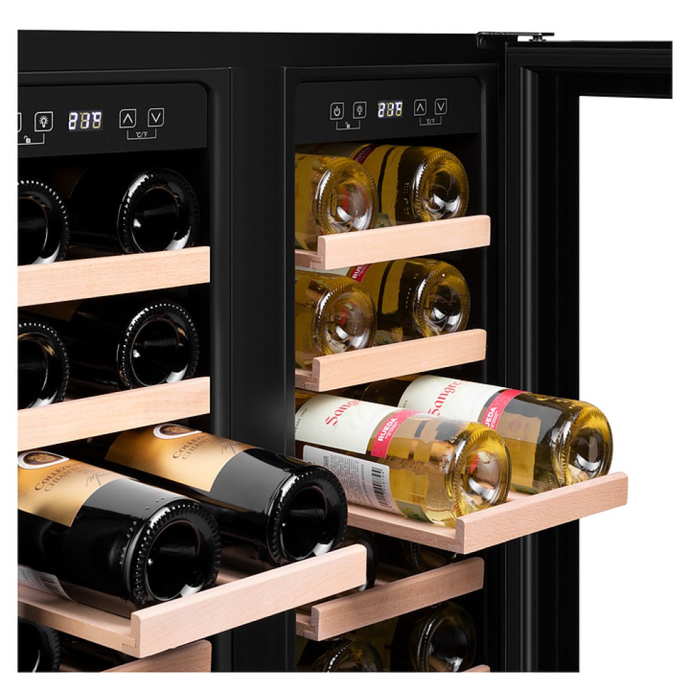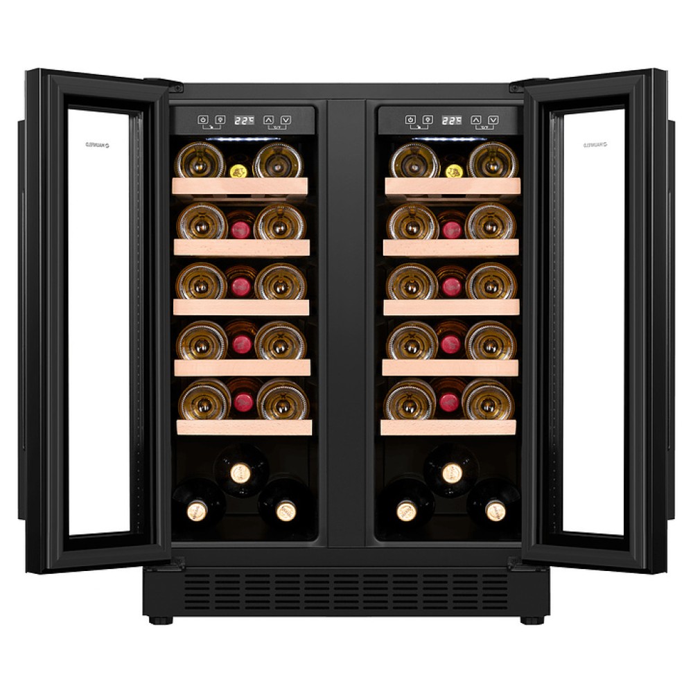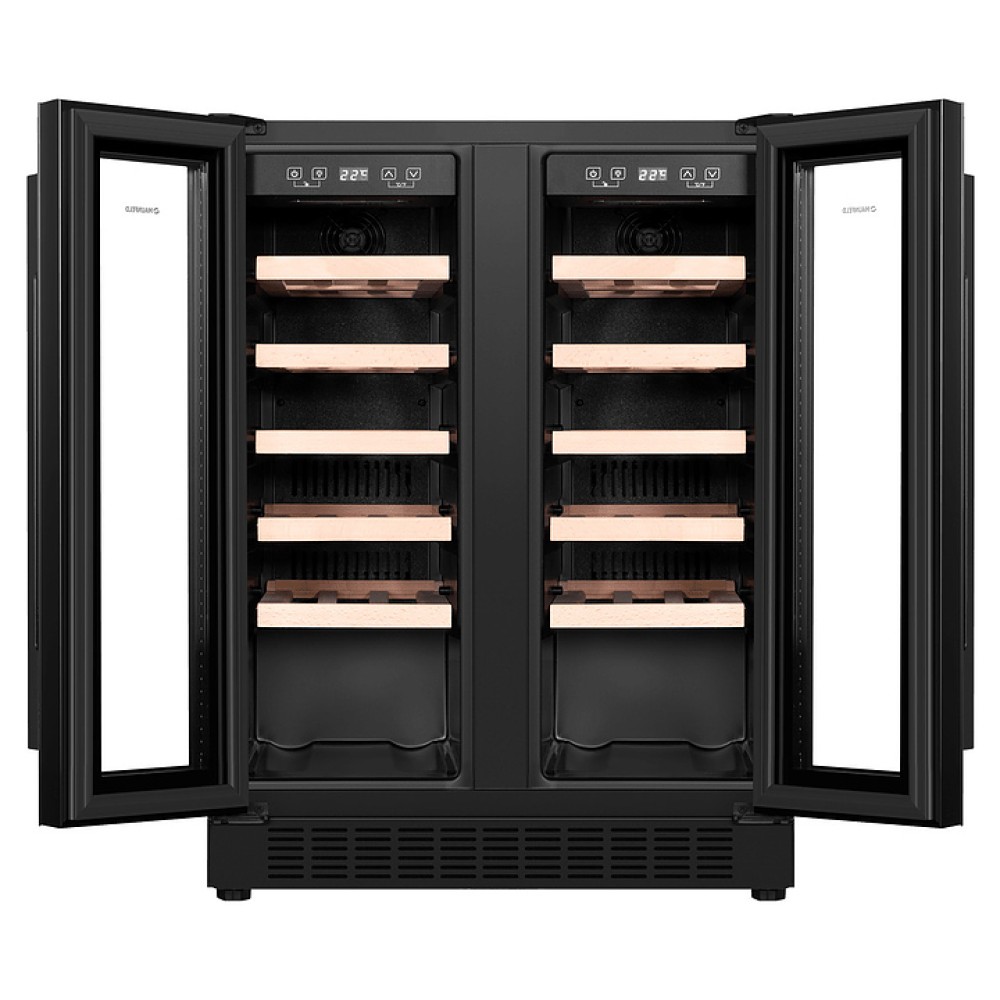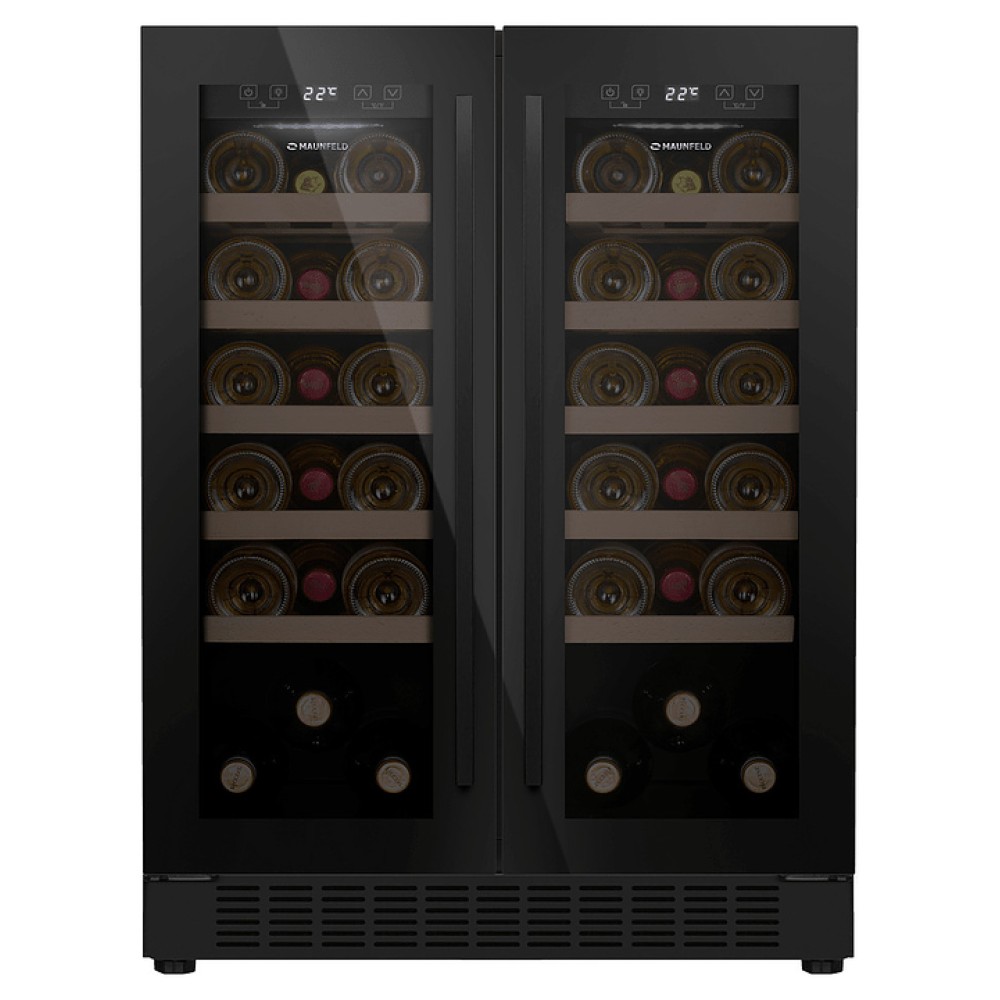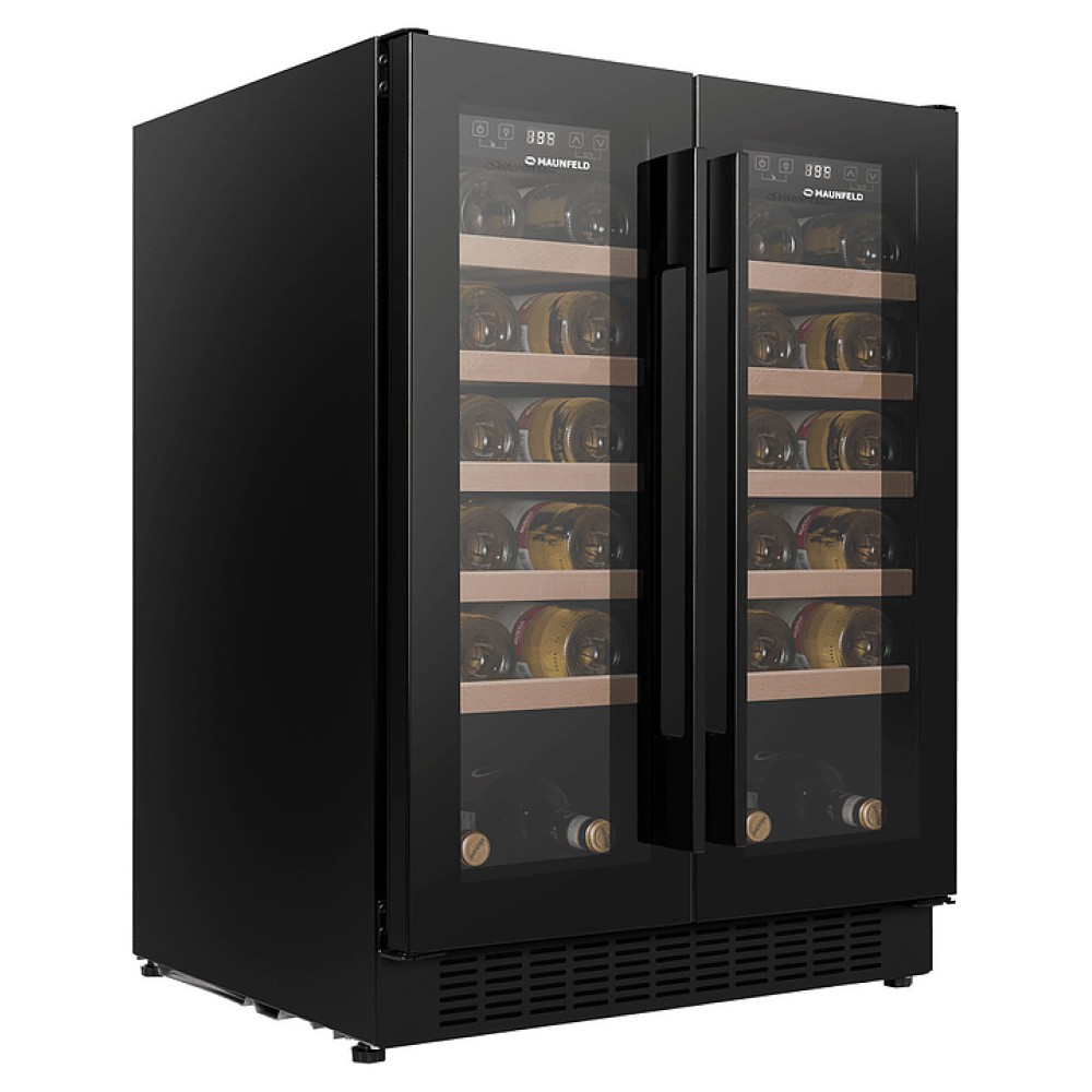 Винный шкаф Maunfeld MBWC-112S40 предназначен для хранения при оптимальных условиях и предпродажной демонстрации бутилированного вина различных сортов в барах, ресторанах, специализированных магазинах, подсобных складских помещениях, а также домашних условиях. Модель оснащена 2 холодильными камерами, каждая камера имеет распашную дверь с длинной уплощенной вертикальной рукояткой, расположенную внутри панель управления с функциональными сенсорными клавишами и светодиодным дисплеем с белой подсветкой индикации. Корпус выполнен из стали с антикоррозийным покрытием черного цвета, двери с полным фронтальным остеклением без винтового крепежа из прозрачного стекла с дымчатой тонировкой, внутренняя облицовка камер черного цвета, полки – из массива буковой древесины.