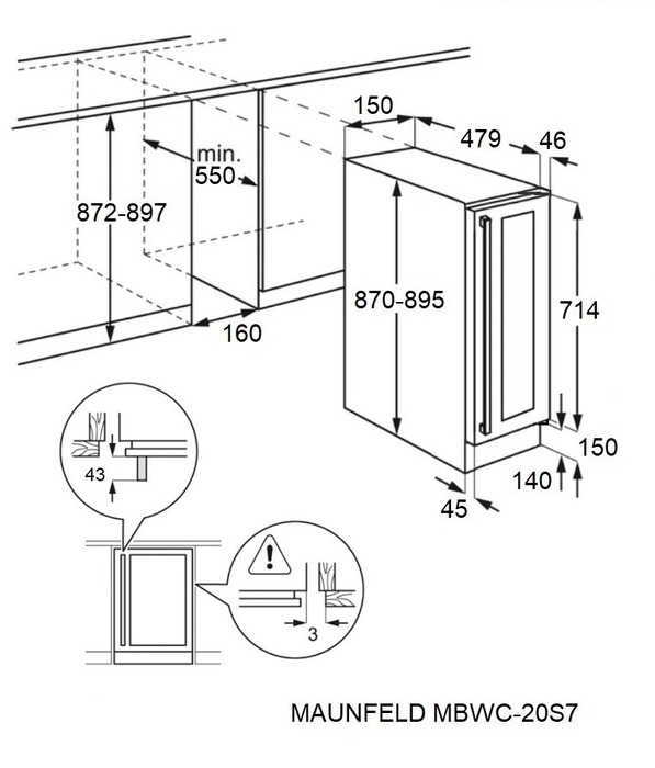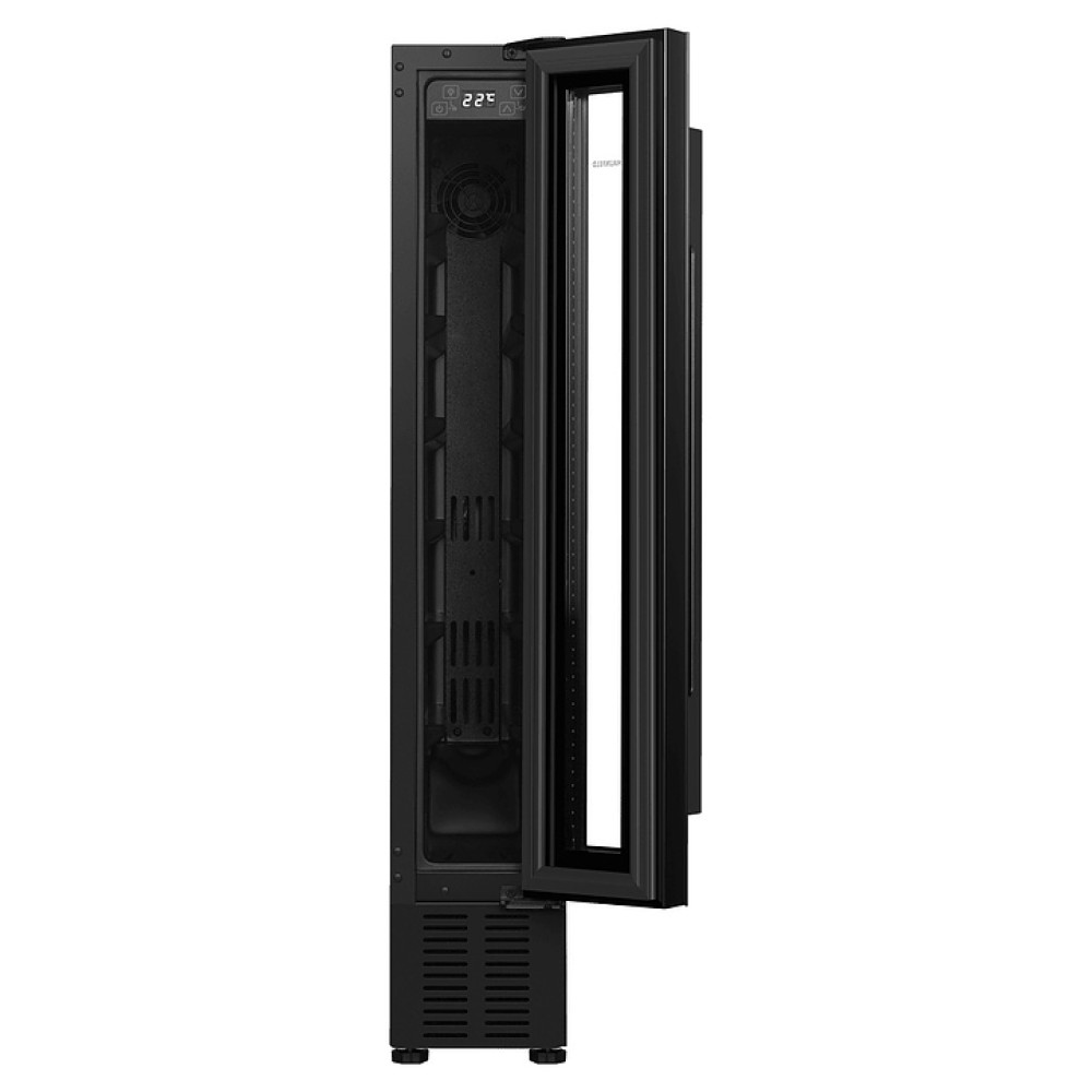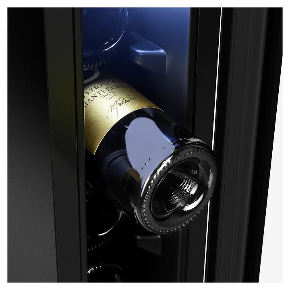 Винный шкаф Maunfeld MBWC-20S7 предназначен для хранения при оптимальных условиях и предпродажной демонстрации бутилированного вина различных сортов в барах, ресторанах, специализированных магазинах, подсобных складских помещениях, а также домашних условиях. Модель оснащена холодильной камерой с правосторонней распашной дверью, длинной уплощенной вертикальной рукояткой, 7 уровнями интегрированных направляющих для бутылок, расположенной внутри камеры панелью управления с функциональными сенсорными клавишами и светодиодным дисплеем с белой подсветкой индикации. Корпус выполнен из стали с антикоррозийным покрытием черного цвета, дверь с полным фронтальным остеклением без винтового крепежа из прозрачного стекла с дымчатой тонировкой, внутренняя облицовка камеры черного цвета.