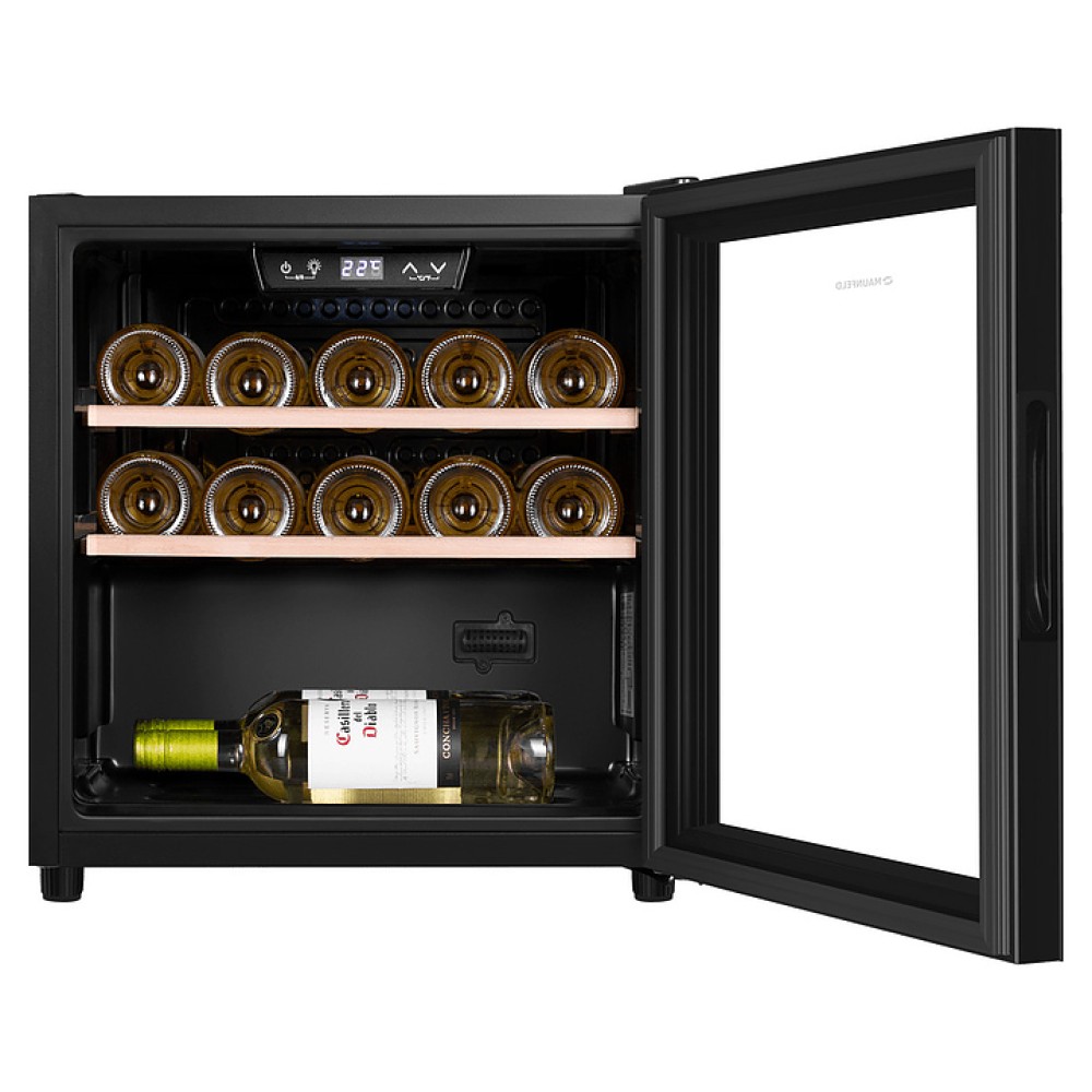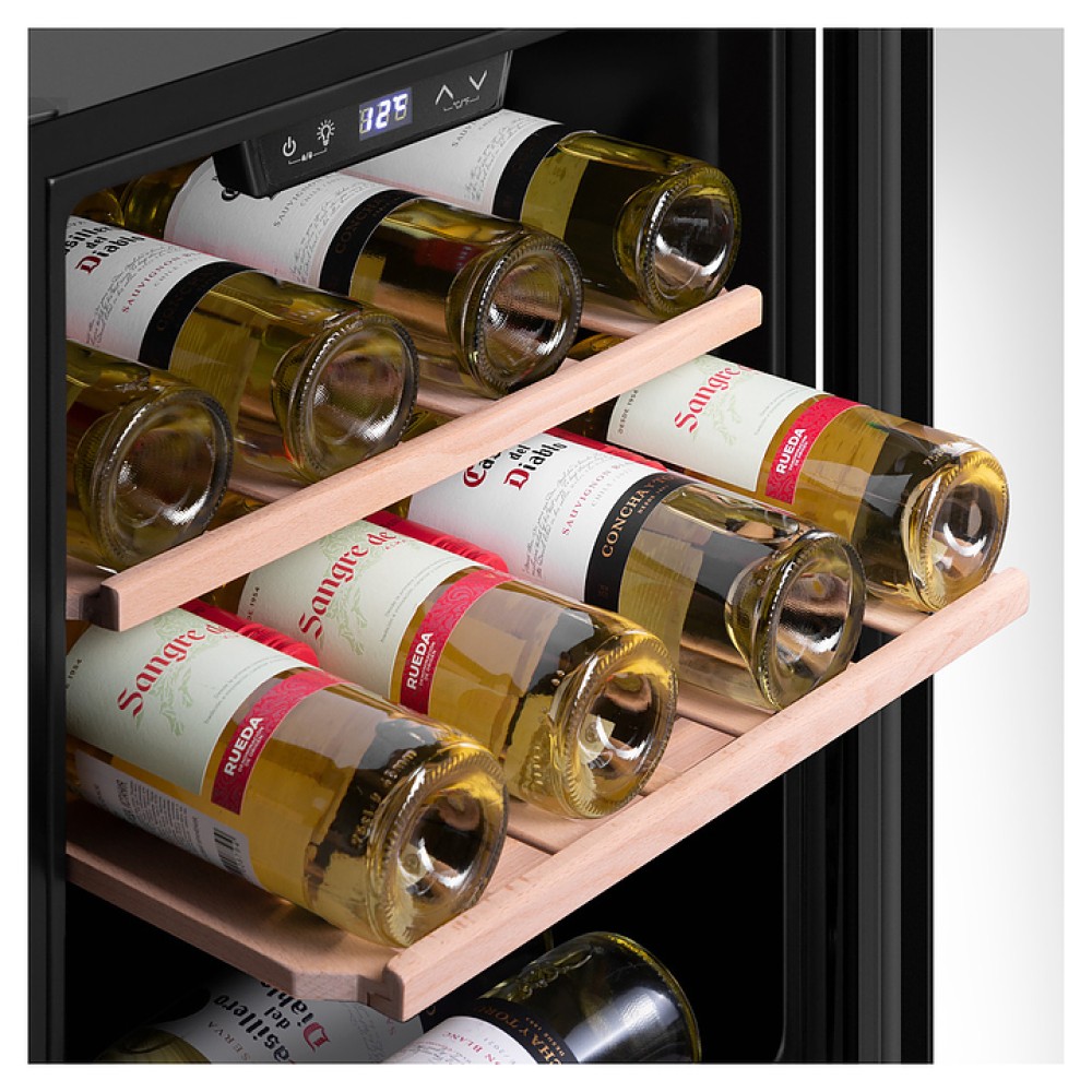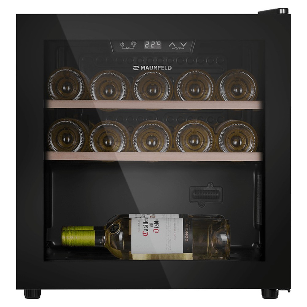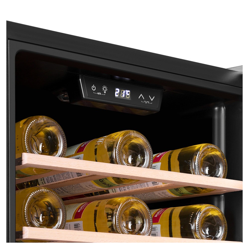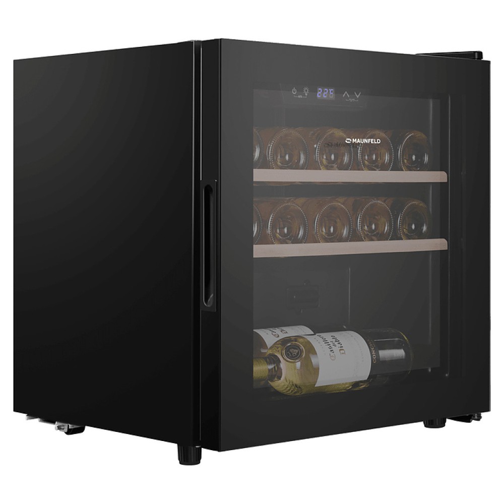Винный шкаф Maunfeld MFWC-40S14 предназначен для хранения при оптимальных условиях и предпродажной демонстрации бутилированного вина различных сортов в барах, ресторанах, специализированных магазинах, подсобных складских помещениях, а также домашних условиях. Модель оснащена холодильной камерой с правосторонней распашной дверью, расположенной внутри камеры панелью управления с функциональными сенсорными клавишами и светодиодным дисплеем с белой подсветкой индикации. Корпус выполнен из стали с антикоррозийным покрытием черного цвета, дверь с полным фронтальным остеклением без винтового крепежа из прозрачного стекла с дымчатой тонировкой, внутренняя облицовка камеры черного цвета, полки – из массива буковой древесины.