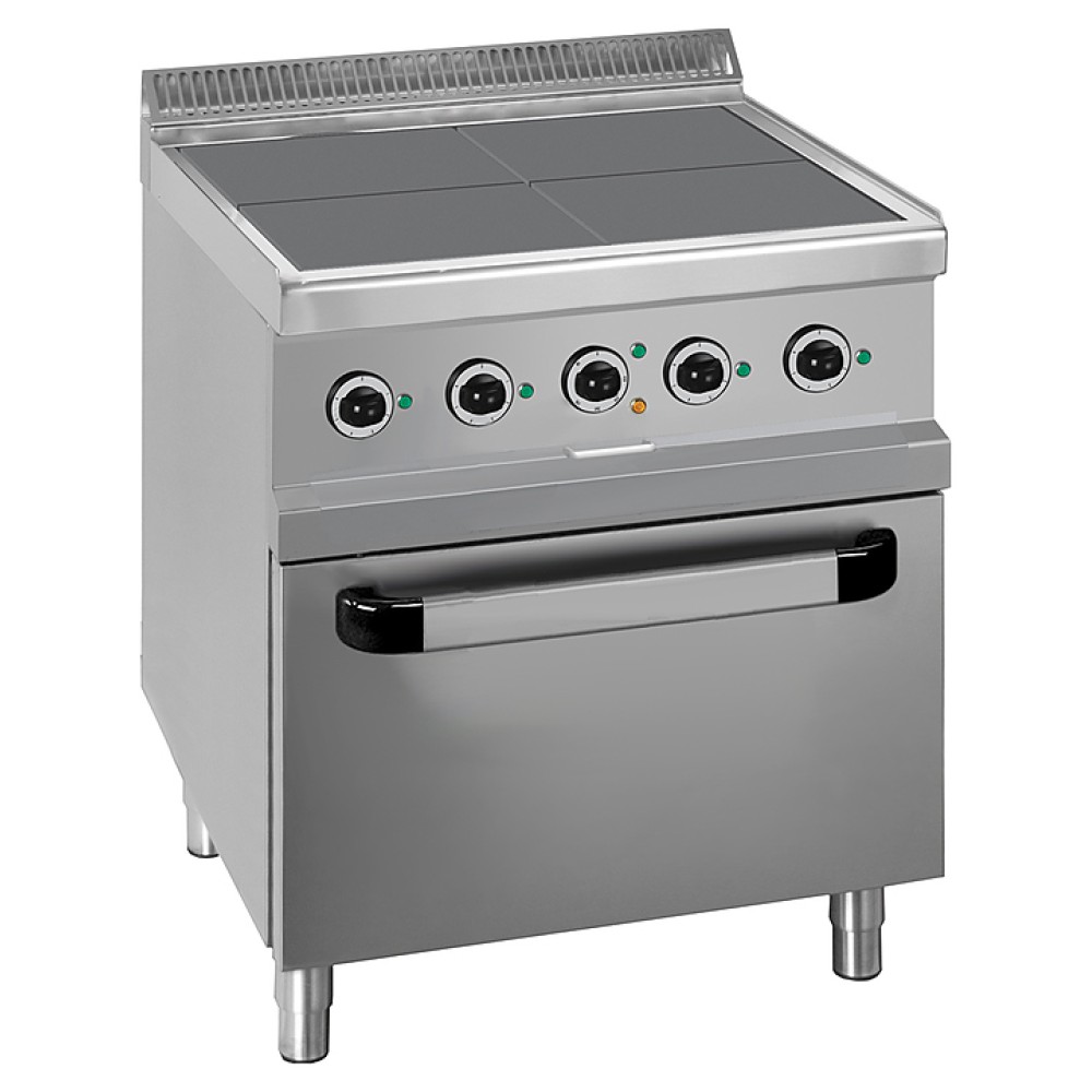 Электрическая плита MBM MG7E4FP77 принадлежит к тепловой линии MAGISTRA 700 и используется для варки, жарения и тушения блюд в наплитной посуде, а также для выпекания различных изделий в духовом шкафу.