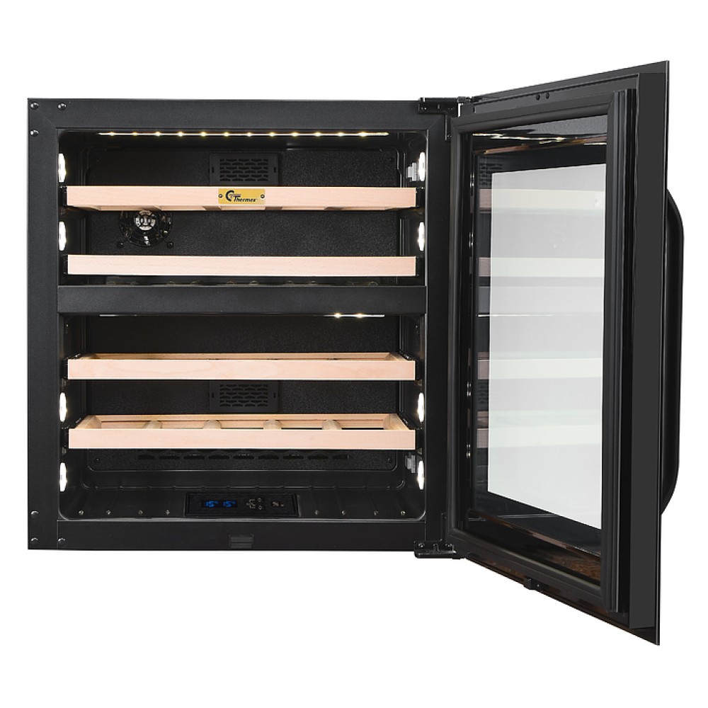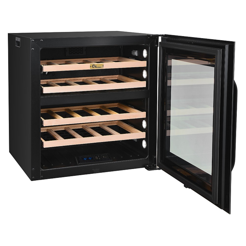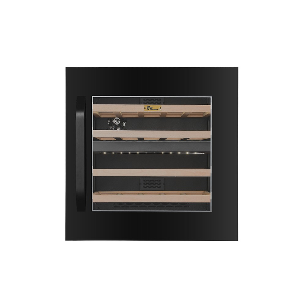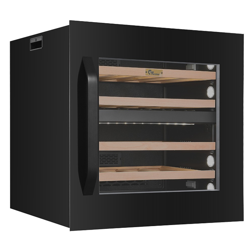 Винный шкаф MC Wine W35B предназначен для кратковременного хранения вина при определенном уровне влажности и температуры в ресторанах, специализированных магазинах, отелях, подсобных складских помещениях, в частных домах или квартирах и подготовки вина к подаче на стол. Модель оснащена сенсорной панелью управления, циферблатом, мягкой светодиодной подсветкой и 4 полками с телескопическими направляющими. Дверь выполнена из черного стекла с двухслойным серым стеклом LOW-E, полки - из массива бука.
