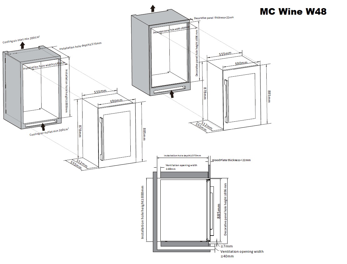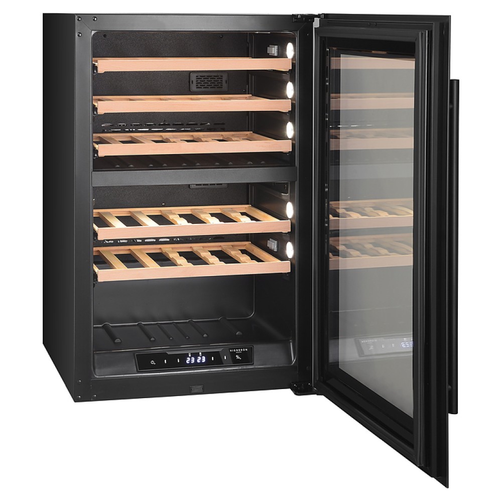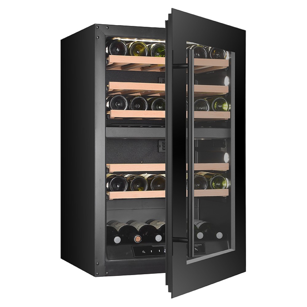 Винный шкаф MC Wine W48DB предназначен для кратковременного хранения вина при определенном уровне влажности и температуры в ресторанах, специализированных магазинах, отелях, подсобных складских помещениях, в частных домах или квартирах и подготовки вина к подаче на стол. Модель оснащена сенсорным цифровым дисплеем с циферблатом и подсветкой голубого цвета, светодиодным индикатором температуры, белой светодиодной лентой и черной трубчатой ручкой. Дверь выполнена из двухслойного стекла LOW-E с защитой от УФ-лучей, рамка двери - из черного стекла, полки - из бука.