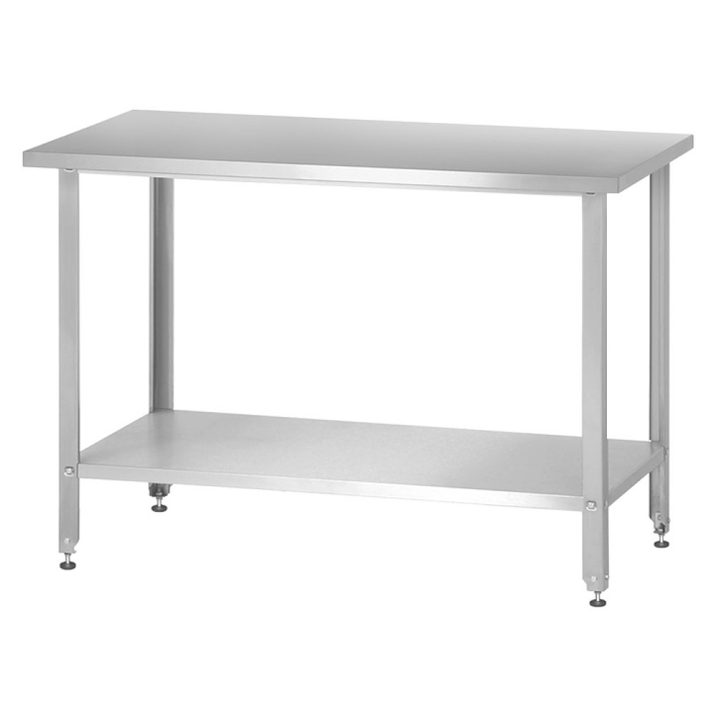 Производственный стол Mecon Norma СПРн предназначен для разделывания и обработки пищевых продуктов, а также в качестве вспомогательной поверхности для кухонного оборудования на предприятиях пищевой промышленности, общественного питания и торговли. Модель оснащена усиленной сплошной полкой и регулируемыми по высоте полиамидными опорами со стальными подпятниками. Каркас выполнен из уголка оцинкованной стали с дополнительными подгибами и базирующими пуклевками, столешница - из шлифованной пищевой нержавеющей стали AISI 430 с усилением подложкой из ЛДСП, полка - из нержавеющей стали AISI 430.