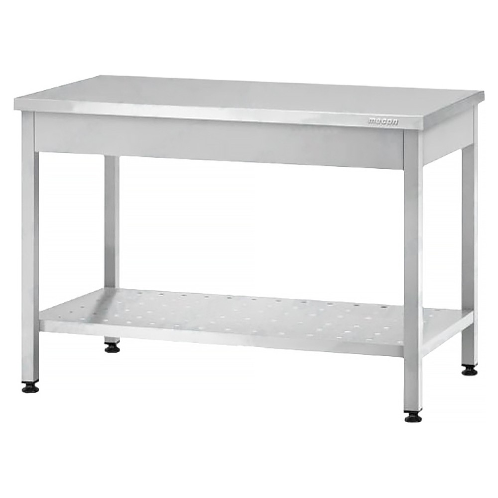 Производственный стол Mecon Profi Ral СПРп предназначен для разделывания и обработки пищевых продуктов, а также в качестве вспомогательной поверхности для кухонного оборудования на предприятиях пищевой промышленности, общественного питания и торговли. Модель имеет разборный каркас с болтовым соединением, оснащена перфорированной полкой и регулируемыми по высоте опорами. Каркас выполнен из профильной стальной трубы 40х40 мм с полимерно-порошковым покрытием, столешница - из пищевой нержавеющей стали AISI 304 с усилением подложкой из ЛДСП, полка и лицевые панели по периметру - из стали с полимерно-порошковым покрытием.