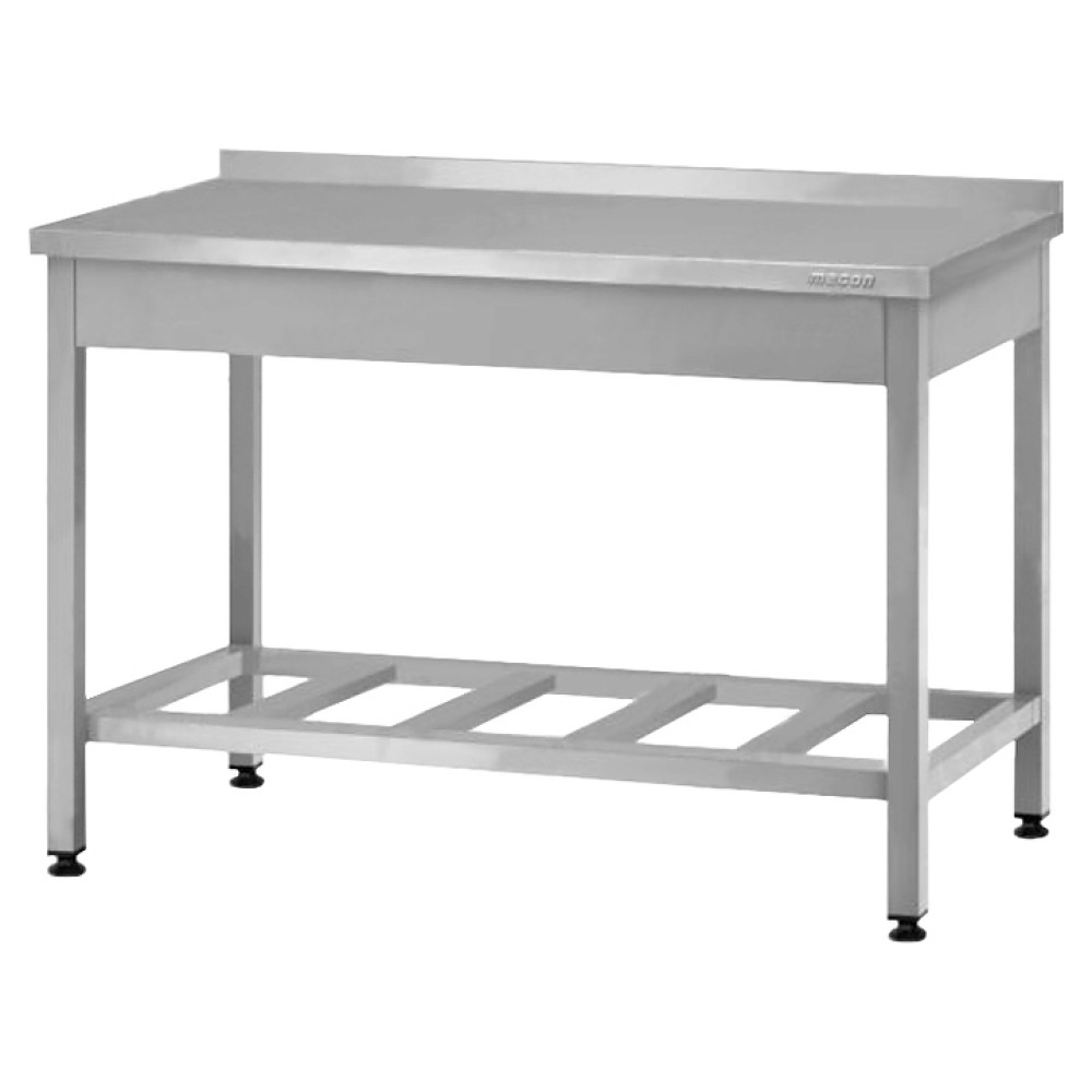Производственный стол Mecon Profi Ral СПРп предназначен для разделывания и обработки пищевых продуктов, а также в качестве вспомогательной поверхности для кухонного оборудования на предприятиях пищевой промышленности, общественного питания и торговли. Модель имеет разборный каркас с болтовым соединением, оснащена полкой-решеткой и регулируемыми по высоте опорами. Каркас выполнен из профильной стальной трубы 40х40 мм с полимерно-порошковым покрытием, столешница - из пищевой нержавеющей стали AISI 304 с усилением подложкой из ЛДСП, полка и лицевые панели по периметру - из стали с полимерно-порошковым покрытием.