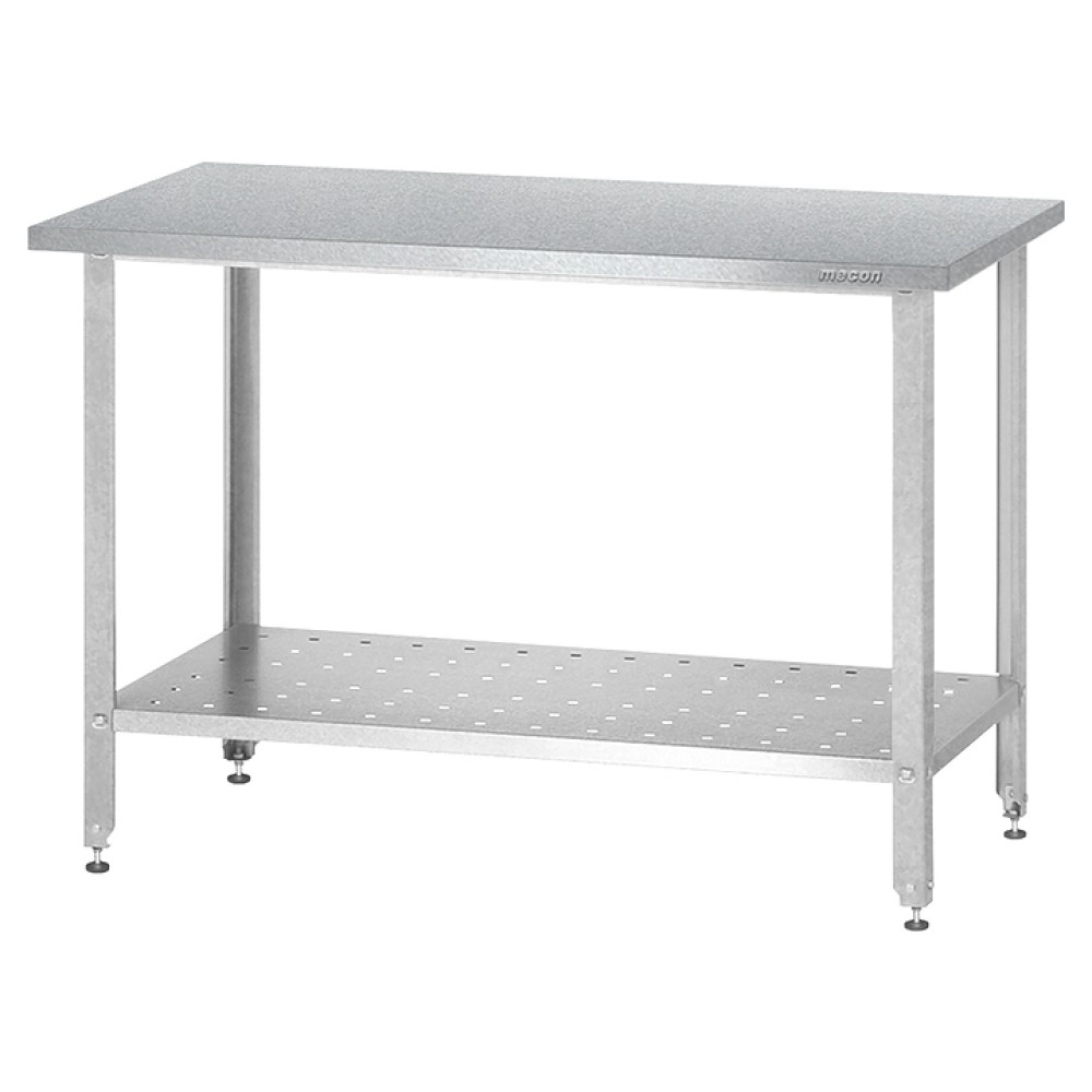 Производственный стол Mecon Retail СПРр предназначен для разделывания и обработки пищевых продуктов, а также в качестве вспомогательной поверхности для кухонного оборудования на предприятиях пищевой промышленности, общественного питания и торговли. Модель имеет разборный каркас, оснащена усиленной перфорированной полкой и регулируемыми по высоте опорами. Ножки выполнены из гнутого углового профиля оцинкованной стали с дополнительными подгибами и базирующими пуклевками, столешница - из оцинкованной стали с усилением подложкой из ДСП, полка - из оцинкованной стали.