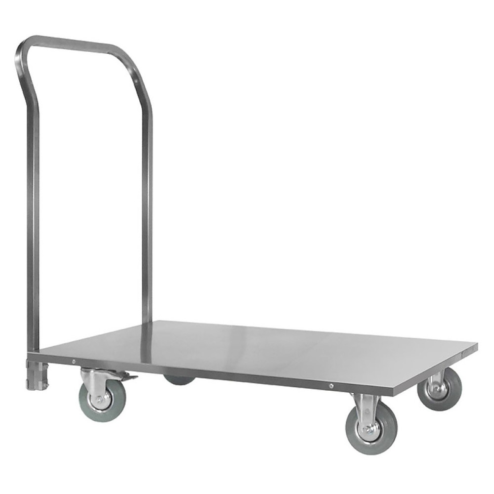 Производственная тележка Mecon Profi Ral ТПГп предназначена для перемещения крупногабаритных тяжелых предметов и продуктов на предприятиях общественного питания и торговли. Модель оснащена разборной усиленной конструкцией, каркасом из профильной трубы, клепочным креплением платформы, 2 неповоротными колесами и 2 поворотными с тормозом. Каркас выполнен из стали с полимерно-порошковым покрытием, платформа - из нержавеющей стали, колеса - из резины.