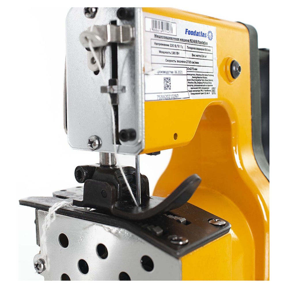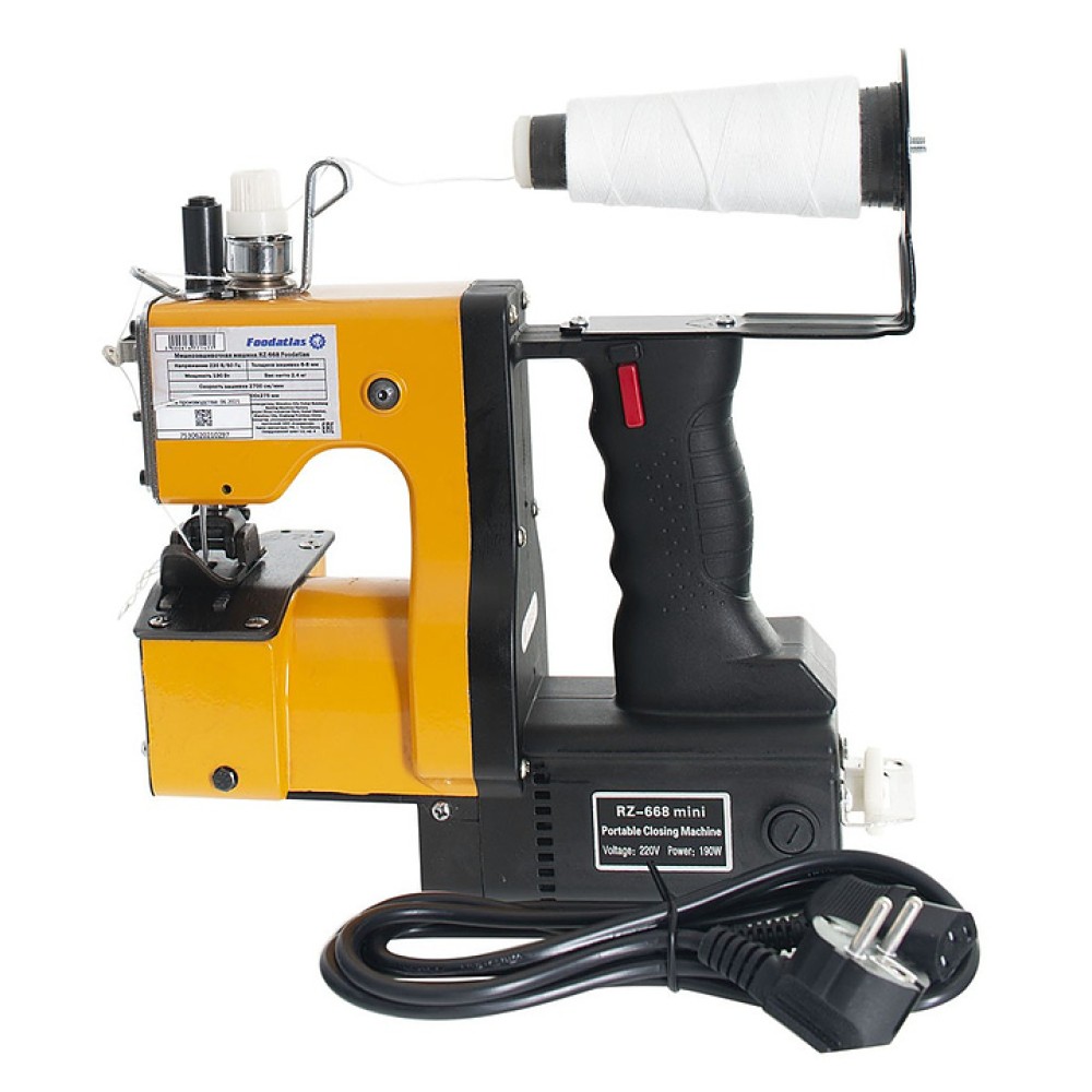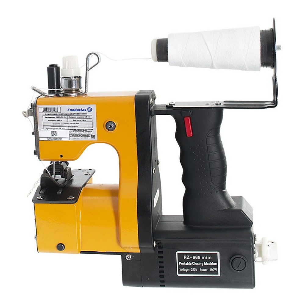 Мешкозашивочная машина Foodatlas RZ-668 используется на предприятиях общественного питания и торговли для прошивания полипропиленовых, полиэтиленовых, джутовых, тканевых и бумажных мешков. Модель оснащена системой обрезки нити, эргономичной рукоятью с удобным расположением кнопки запуска, имеет дополнительные крепления для подвеса, при помощи которых машинку можно подвесить. Также модель оборудована внешним переносным элементом питания (аккумулятором), который соединен с основным корпусом при помощи гибкого кабеля, аккумулятор крепится к поясному ремню оператора, что снижает нагрузку на его руку. Копрус выполнен из стали и покрыт порошковой краской.