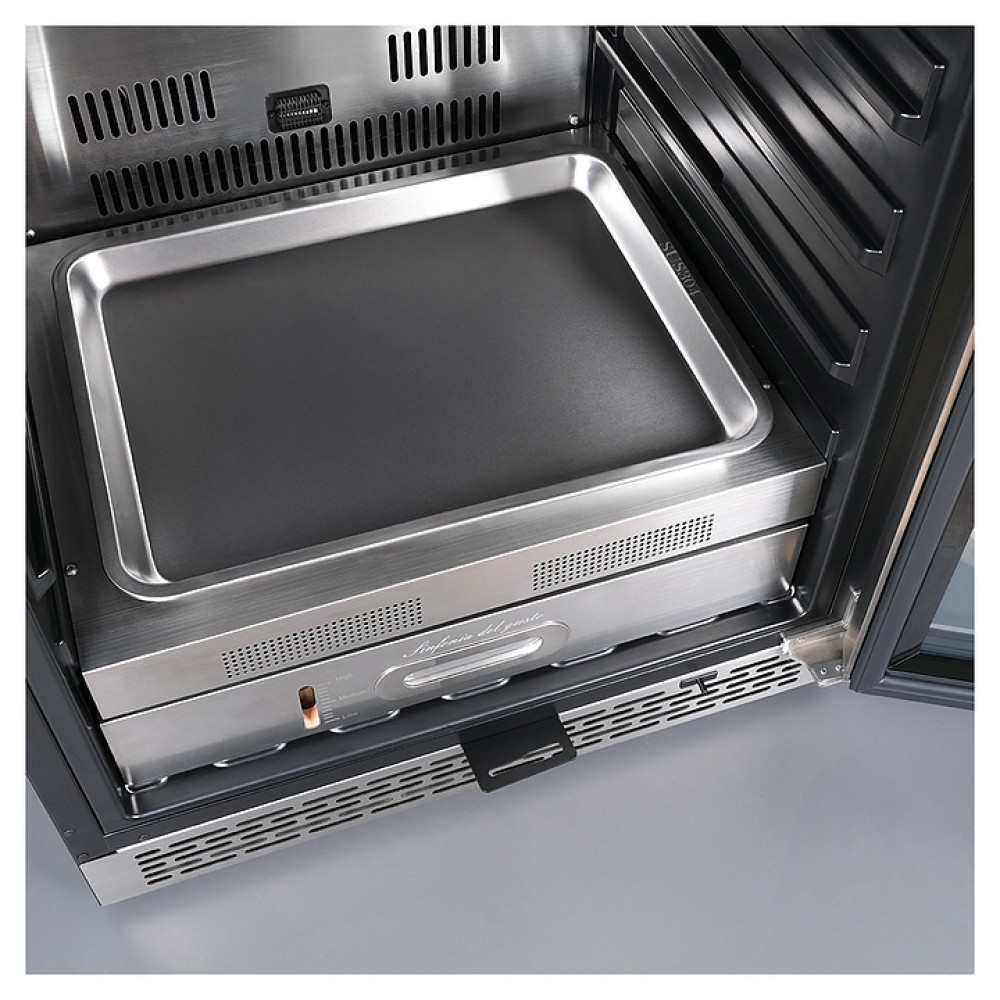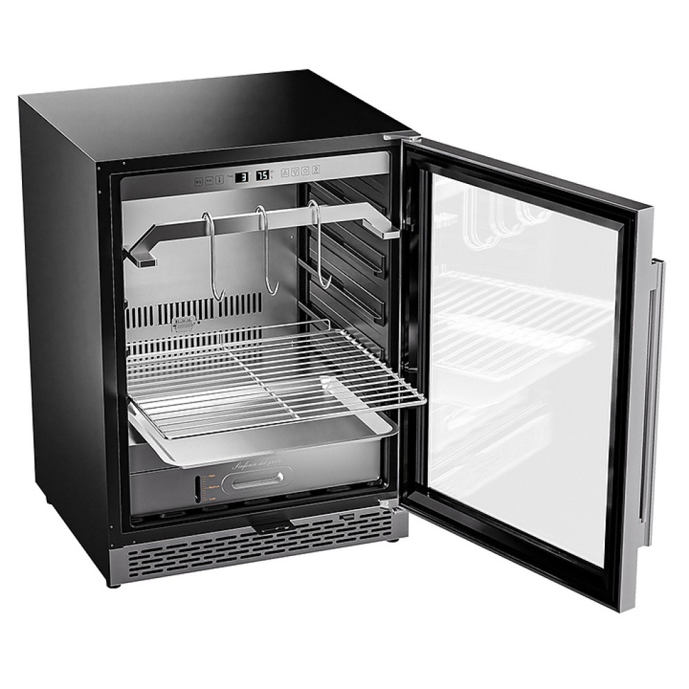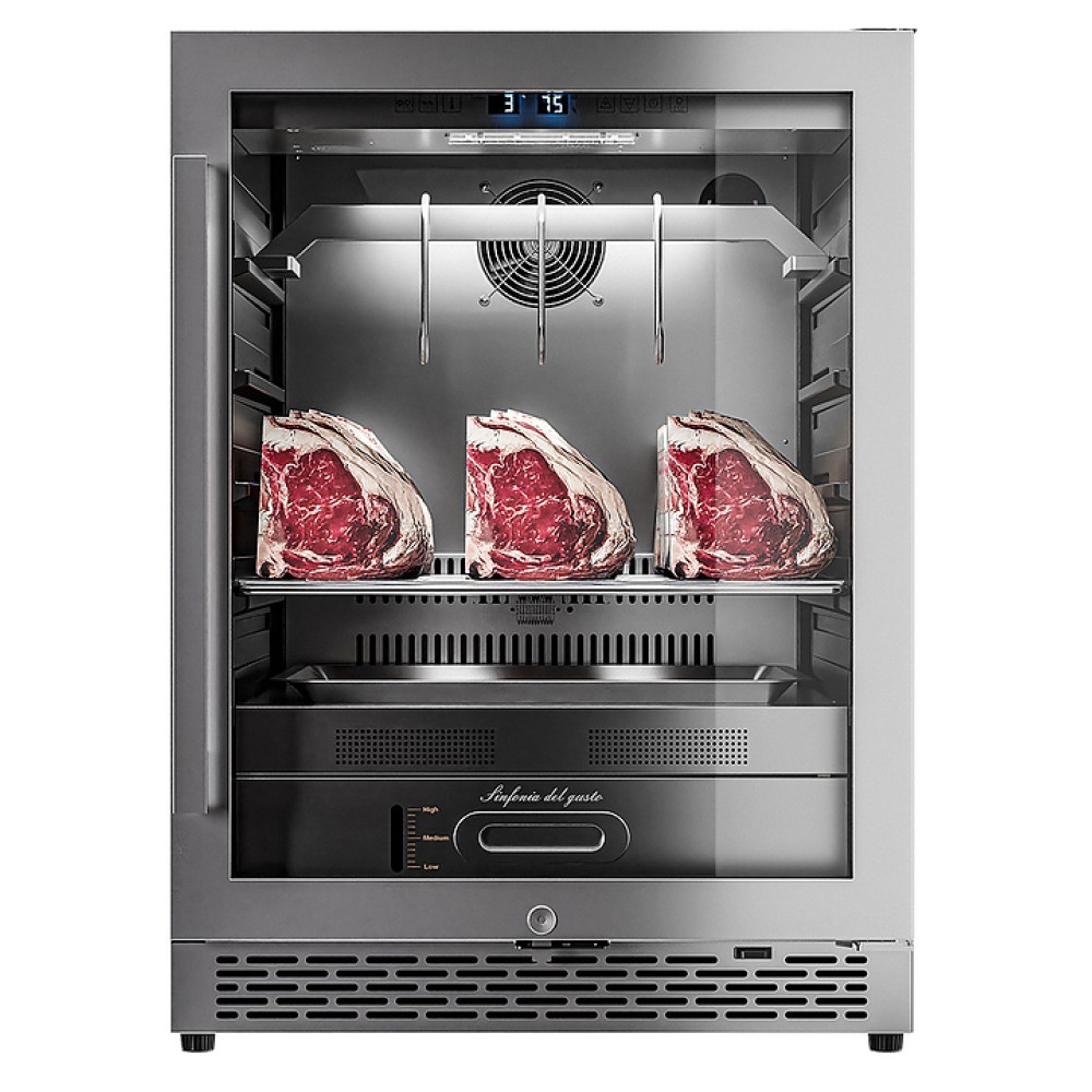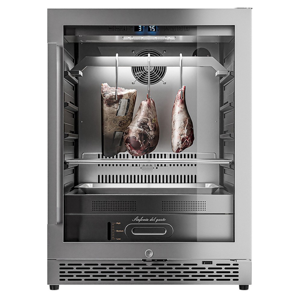 Шкаф MEYVEL MM-45SR предназначен для охлаждения и вызревания мяса, птицы, колбасы, рыбы, ветчины, сыра и салями на предприятиях общественного питания и в домашних услових. Модель обеспечивает условия, способствующие разрушению волокон мяса под воздействием ферментативных реакций и холодного воздуха, что приводит к улучшению текстуры и вкуса. Шкаф оснащен сенсорным управлением, демонстрационным освещением, ручкой и регулируемыми ножками. Угольный фильтр очищает воздух внутри шкафа от посторонних запахов. Корпус и ручка выполнены из стали, рамка двери - из бесшовной нержавеющей стали, дверца - из тройного стекла с УФ-фильтром, решетки - из хромированного металла.
