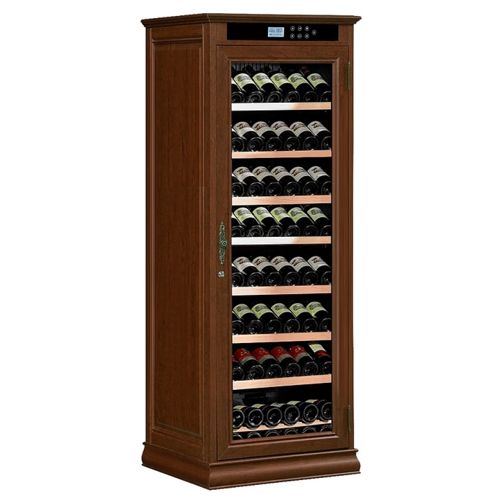 Винный шкаф MEYVEL MV102-WD1-C (Nut) серии Classic предназначен для хранения при оптимальных условиях бутилированного вина различных сортов в барах, ресторанах, специализированных магазинах, подсобных складских помещениях, гостиницах, а также домашних условиях. Модель оснащена монотемпературной холодильной камерой, распашной дверью на внешних петлях, прозрачным обзорным остеклением, кабелем питания с вилкой, внешней сенсорной панелью управления и жидкокристаллическим дисплеем индикации с подсветкой. Корпус имеет покрытие под дерево с поверхностью оттенка орех, фурнитура – из металла бронзового оттенка с патиной, полки – из массива древесины.