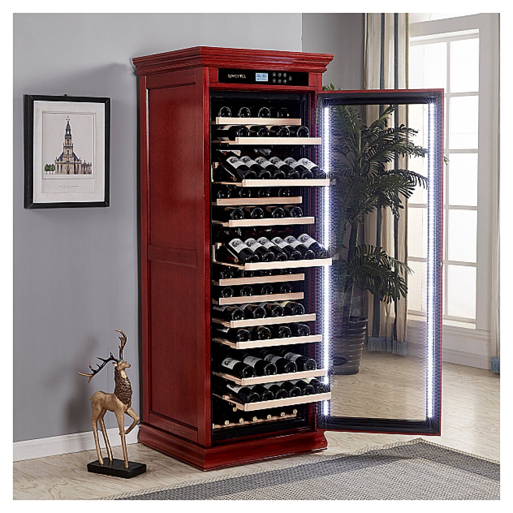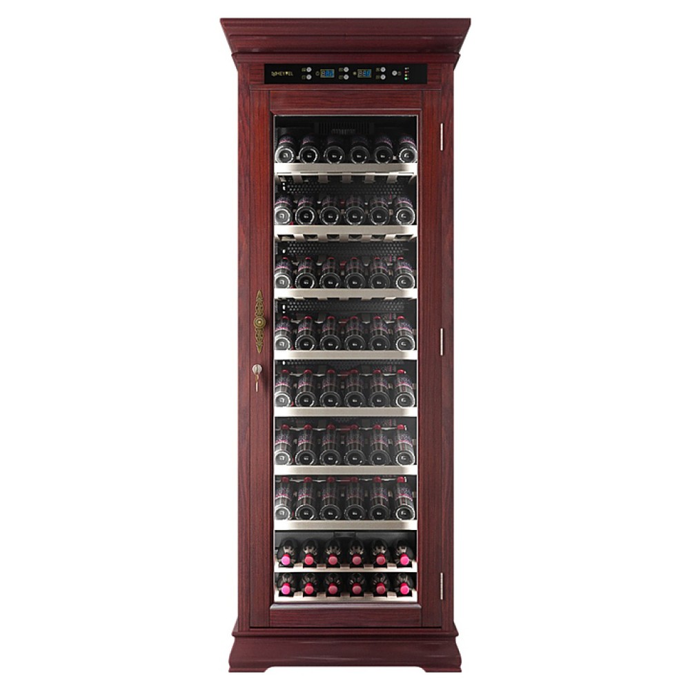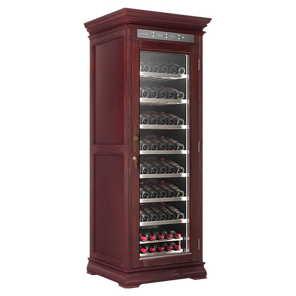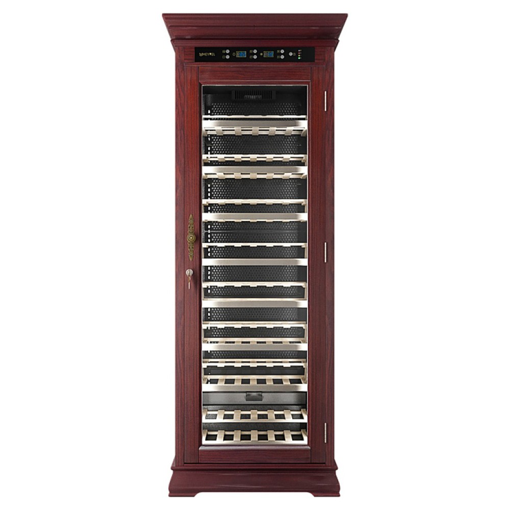 Винный шкаф MEYVEL MV108-WM1-C предназначен для демонстрации, хранения и создания оптимальных условий для сохранения всех вкусовых свойств вина в бутылках на предприятиях общественного питания, торговли, в барах, ресторанах, специализированных магазинах, частных домах или квартирах. Модель оснащена сенсорной панелью управления, электронным термостатом и светодиодной подсветкой. Корпус выполнен из обшитой красным американским дубом стали, дверь - из деревянной рамы и двойного стекла с защитой от ультрафиолетовых лучей, полки - из массива бука, ручка двери - из стали.