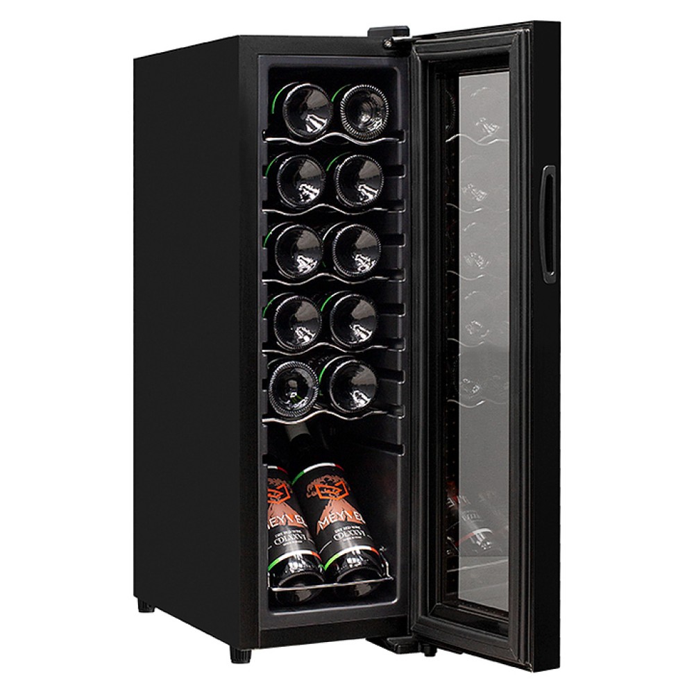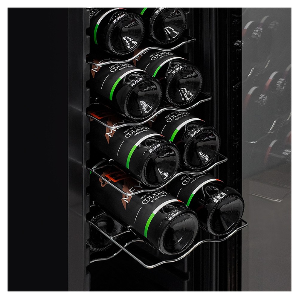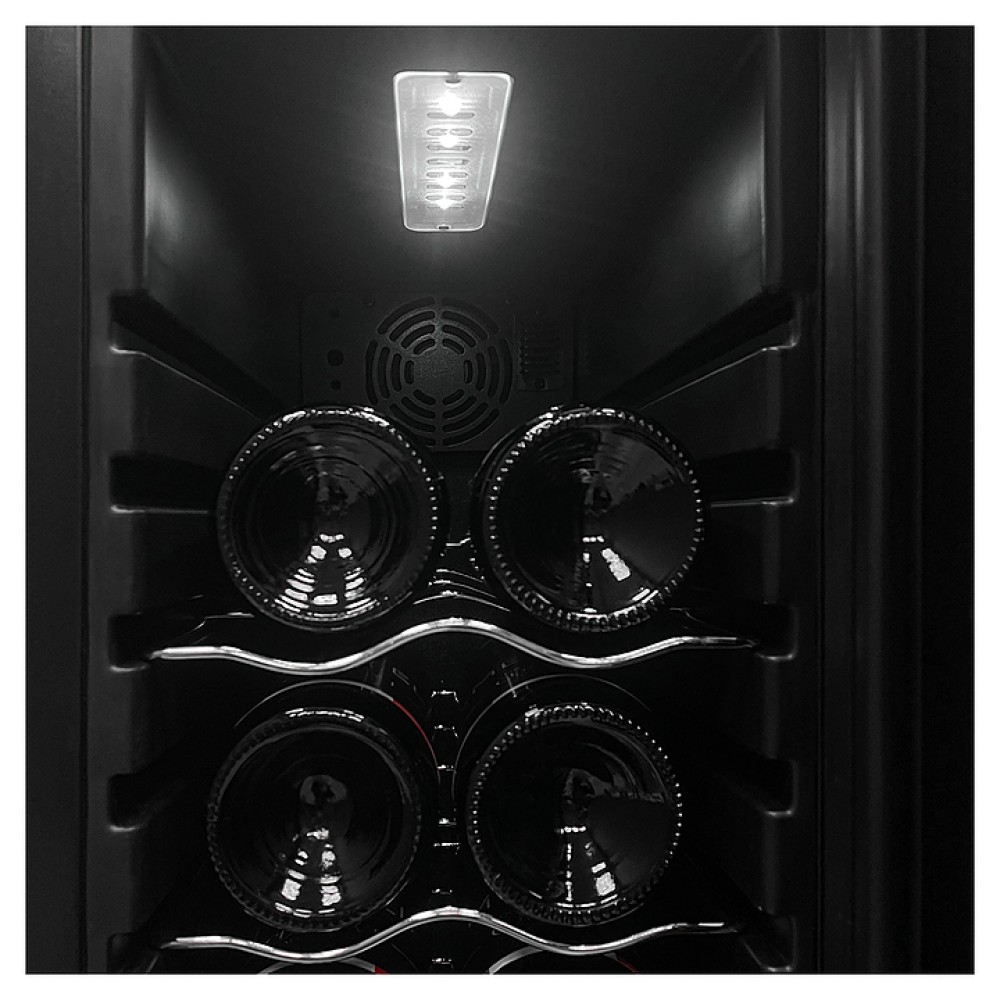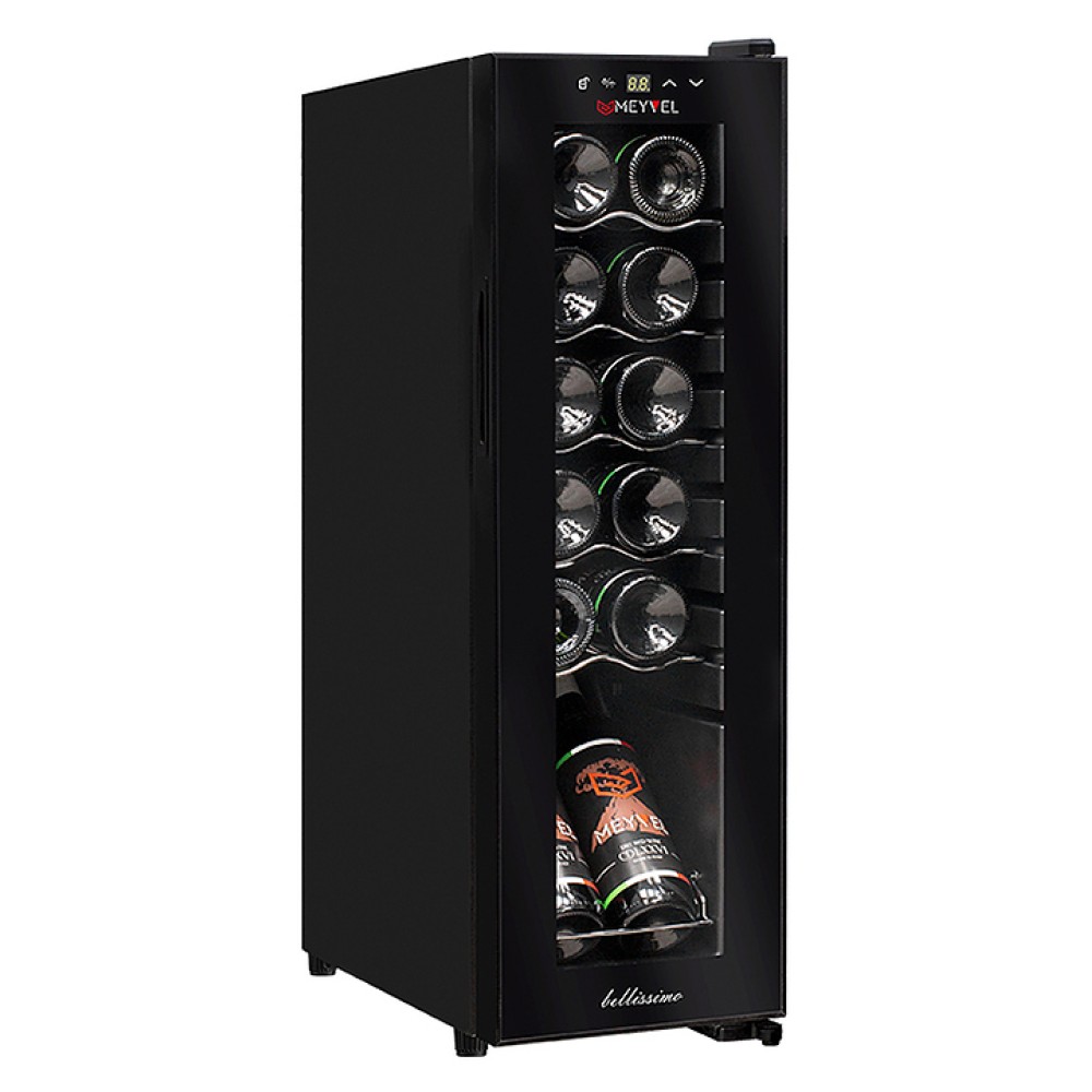 Винный шкаф MEYVEL MV12-CBD1 предназначен для демонстрации, хранения и создания оптимальных условий для сохранения всех вкусовых свойств вина в бутылках на предприятиях общественного питания, торговли, в барах, ресторанах, специализированных магазинах, частных домах или квартирах. Модель оснащена сенсорной панелью управления, электронным термостатом и светодиодной подсветкой белого цвета. Корпус выполнен из окрашенной в черный цвет стали, дверь - из пластиковой рамы и двойного стекла с защитой от ультрафиолетовых лучей, полки - из хромированного металла.