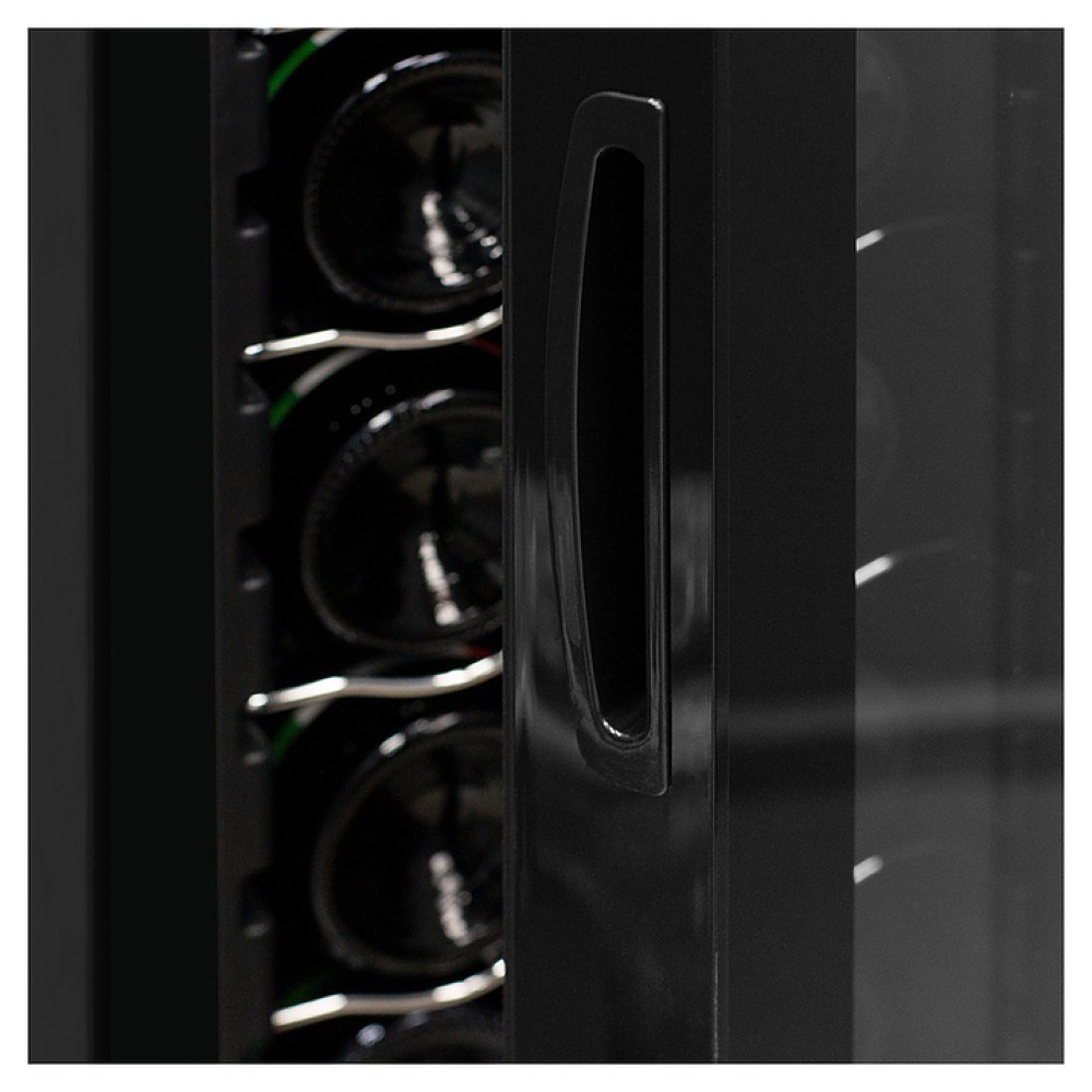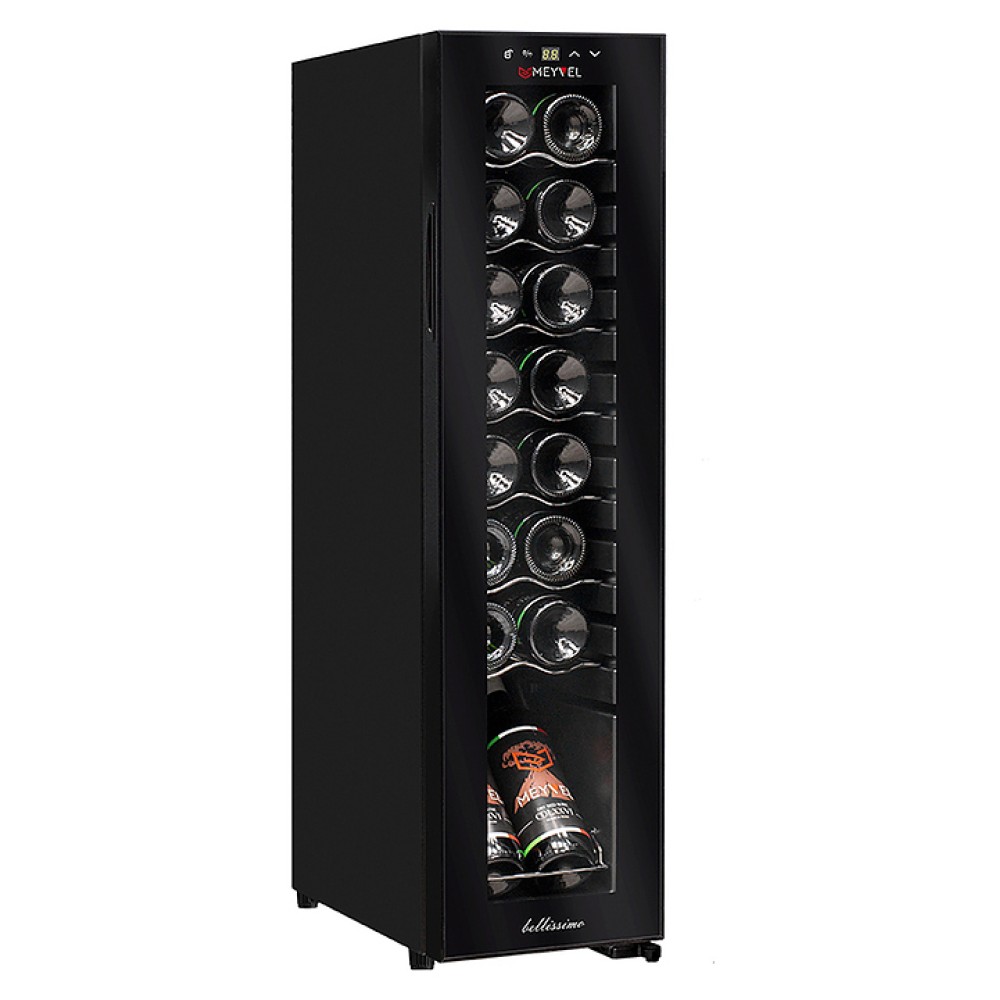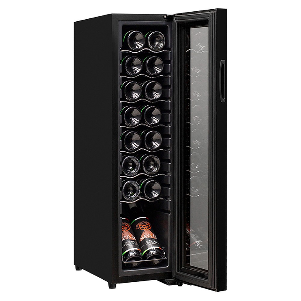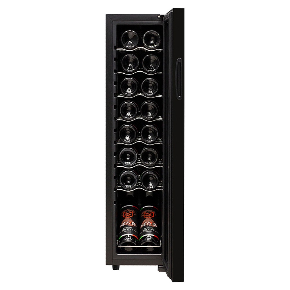 Винный шкаф MEYVEL MV16-CBD1 предназначен для демонстрации, хранения и создания оптимальных условий для сохранения всех вкусовых свойств вина в бутылках на предприятиях общественного питания, торговли, в барах, ресторанах, специализированных магазинах, частных домах или квартирах. Модель оснащена сенсорной панелью управления, электронным термостатом и светодиодной подсветкой белого цвета. Корпус выполнен из окрашенной в черный цвет стали, дверь - из пластиковой рамы и двойного стекла с защитой от ультрафиолетовых лучей, полки - из хромированного металла.