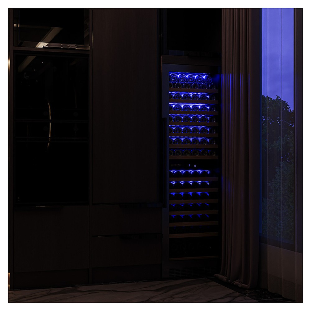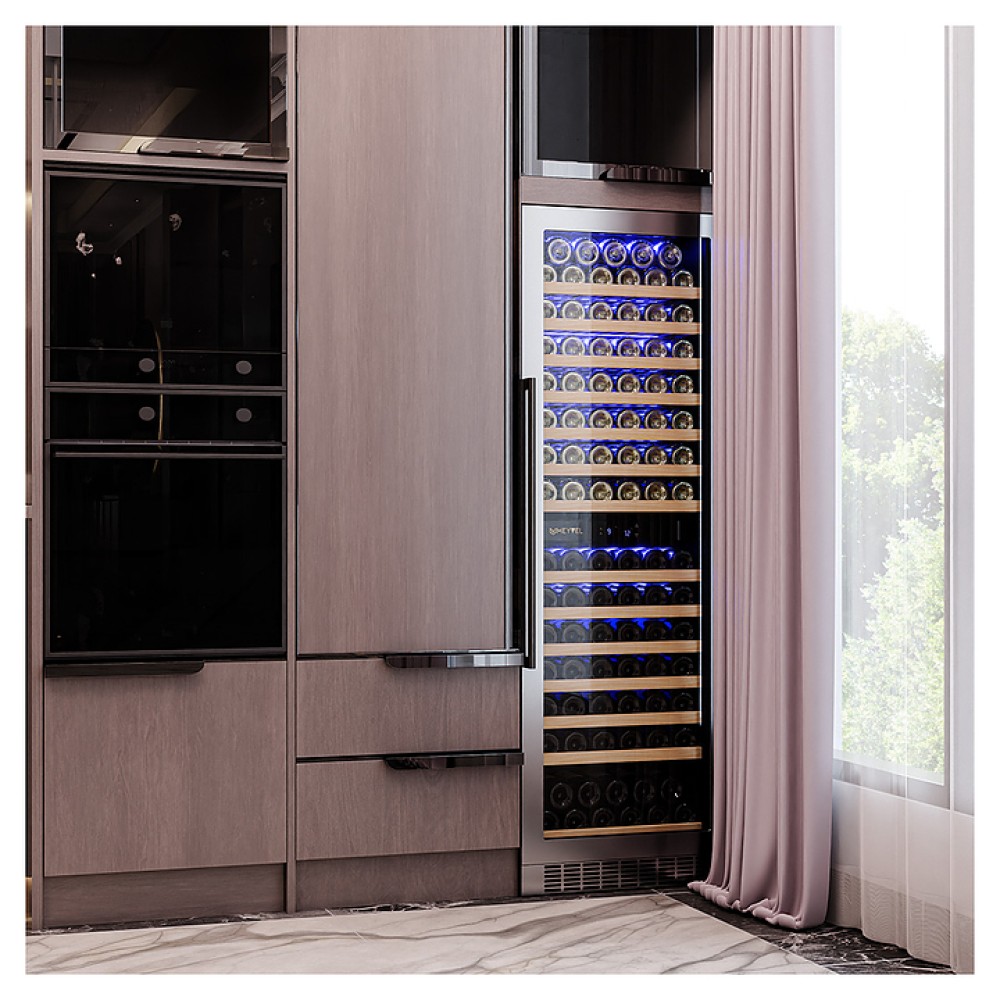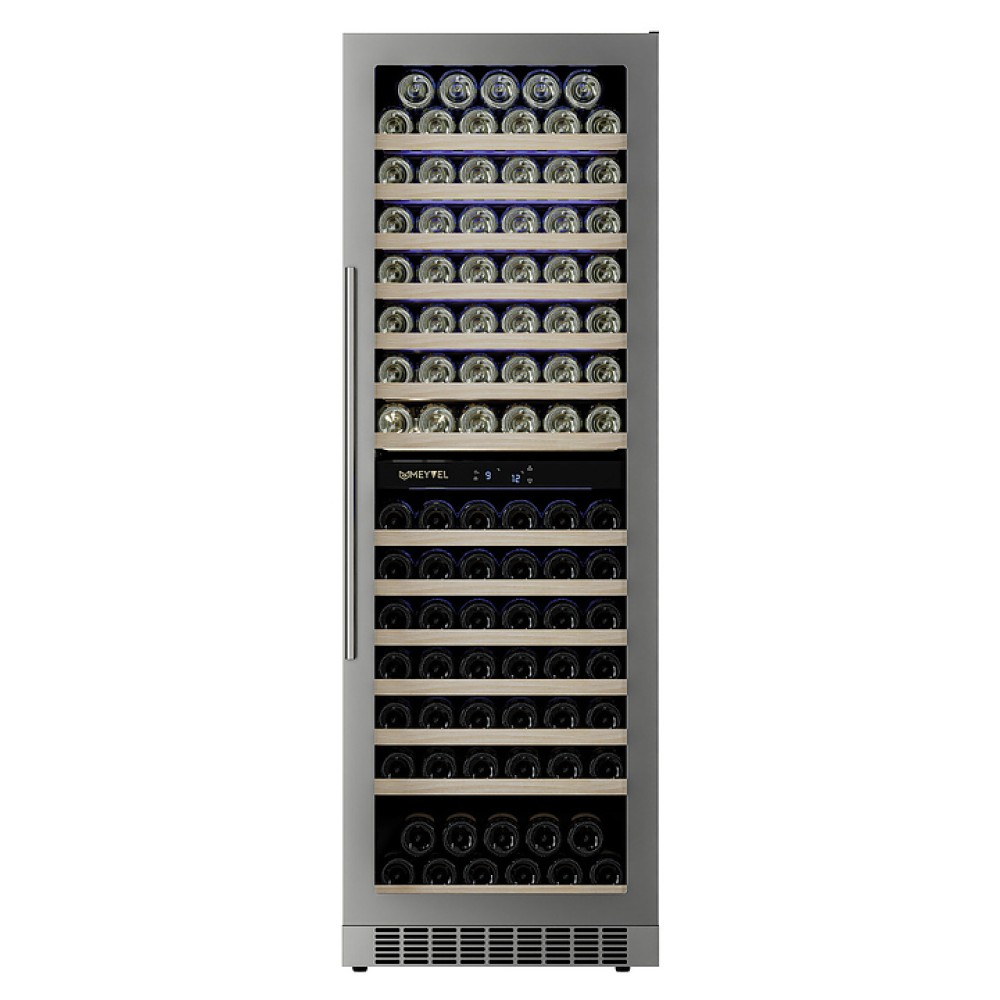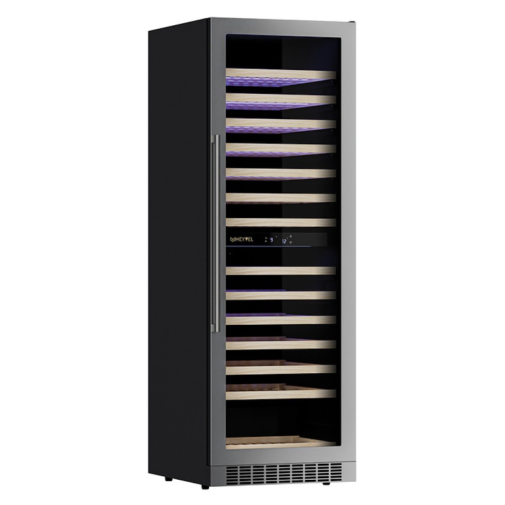 Винный шкаф MEYVEL MV163-KST2 предназначен для демонстрации, хранения и создания оптимальных условий для сохранения всех вкусовых свойств вина в бутылках на предприятиях общественного питания, торговли, в барах, ресторанах, специализированных магазинах, частных домах или квартирах. Модель оснащена сенсорной панелью управления, электронным термостатом и синей внутренней светодиодной подсветкой. Корпус и ручка выполнены из стали, дверь - из стальной рамы и двойного стекла с защитой от ультрафиолетовых лучей, полки - из массива бука.