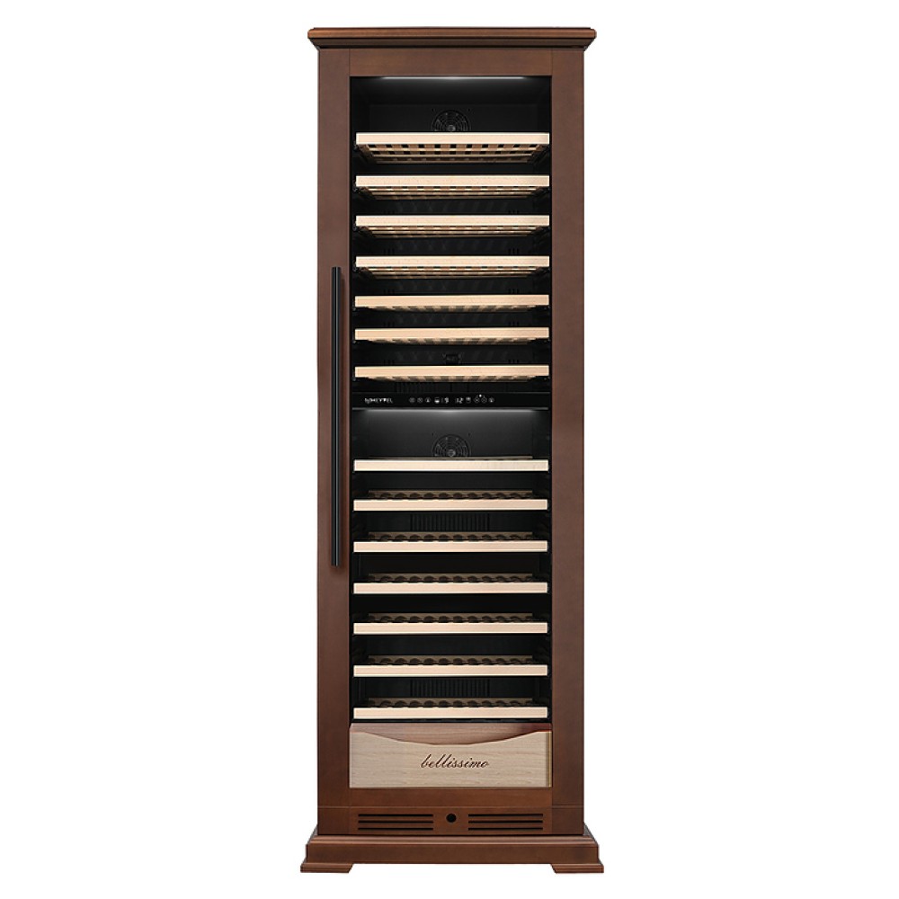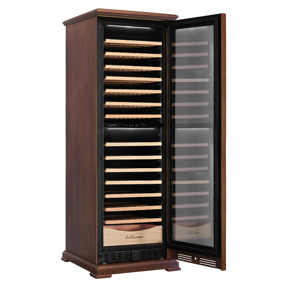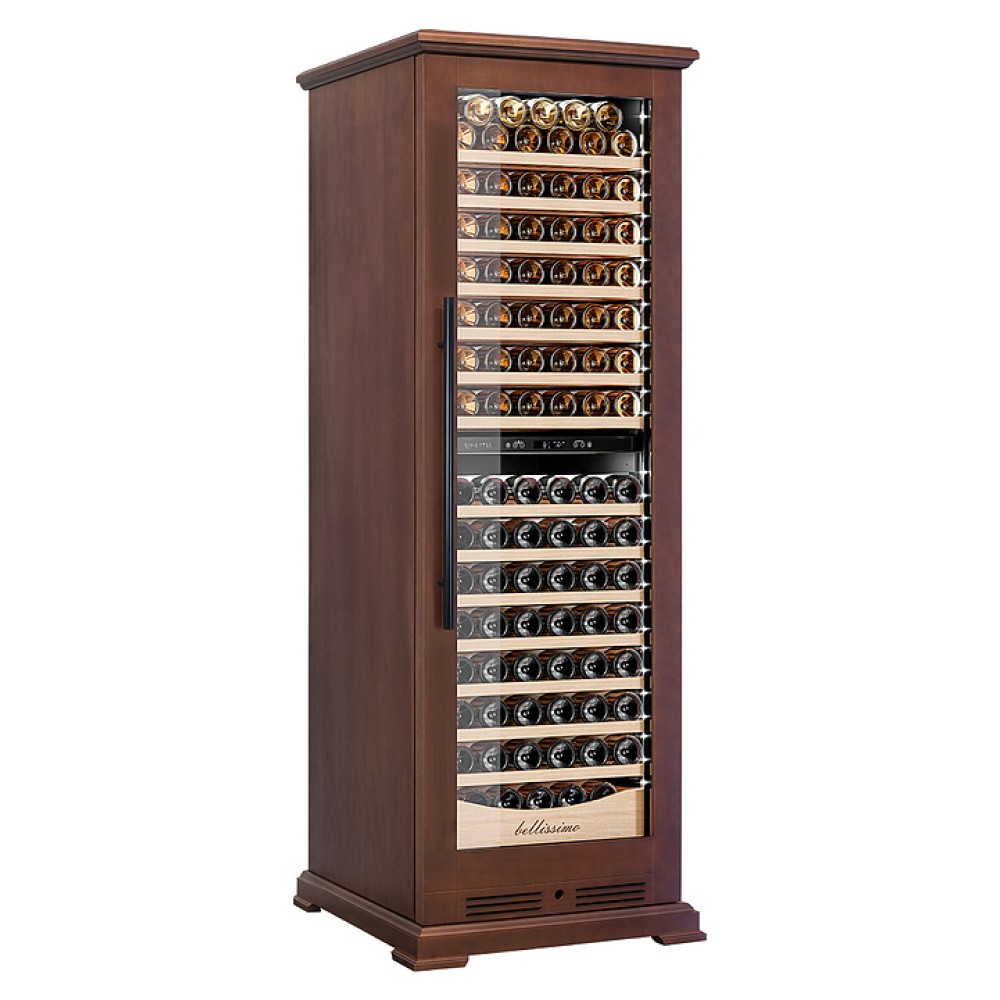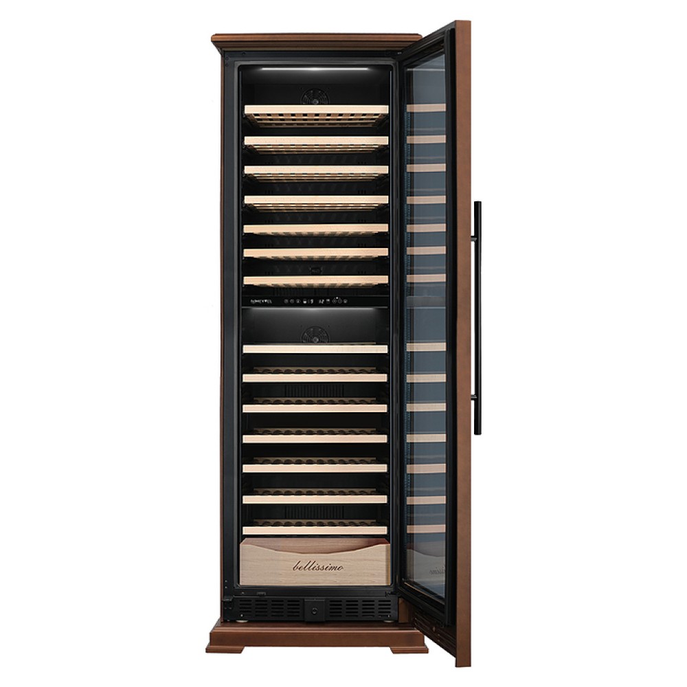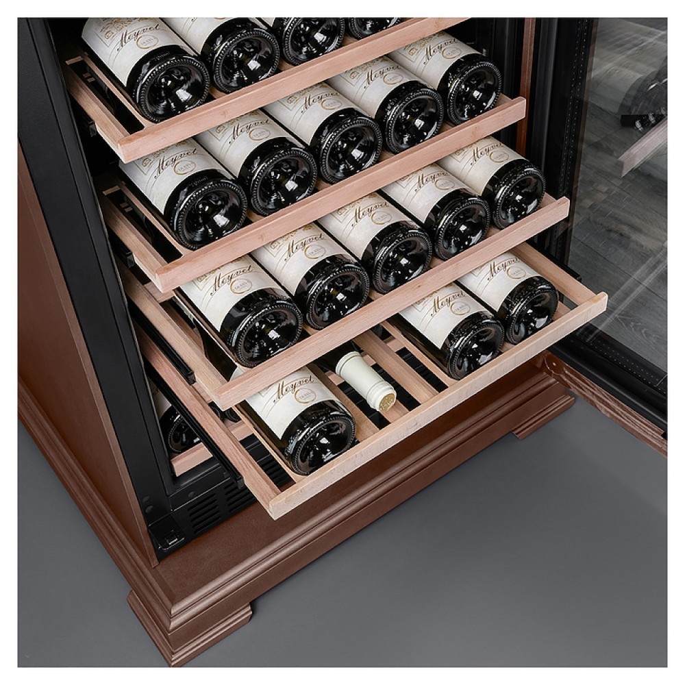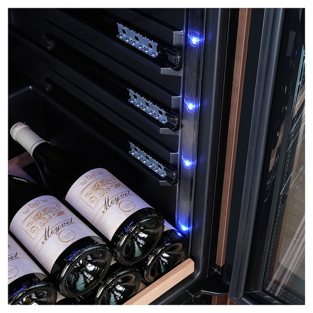 Винный шкаф MEYVEL MV163PRO-KBT2 предназначен для демонстрации, хранения и создания оптимальных условий для сохранения всех вкусовых свойств вина в бутылках на предприятиях общественного питания, торговли, в барах, ресторанах, специализированных магазинах, частных домах или квартирах. Модель оснащена интуитивно-понятной сенсорной панелью управления, электронным термостатом и внутренней светодиодной подсветкой. Корпус выполнен из стали с обшивкой из натурального шпона бука, дверь - из тройного стекла с УФ защитой, полки - из массива бука.