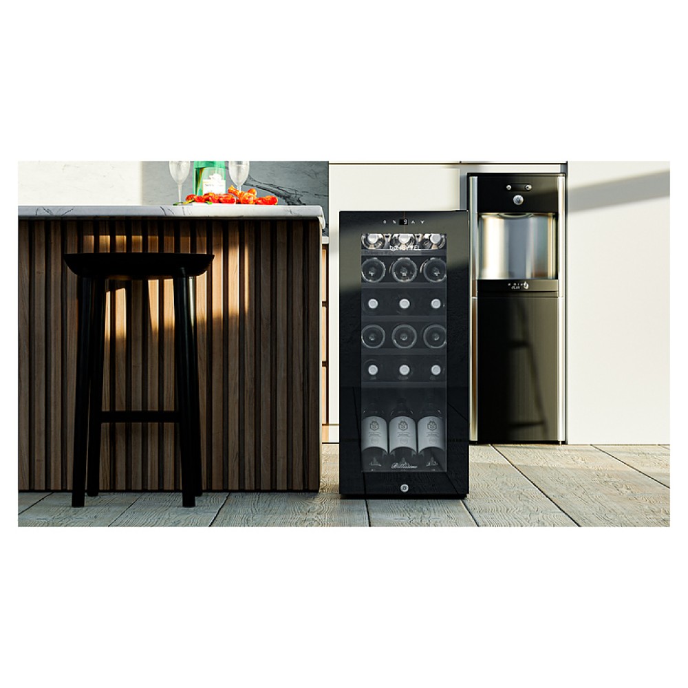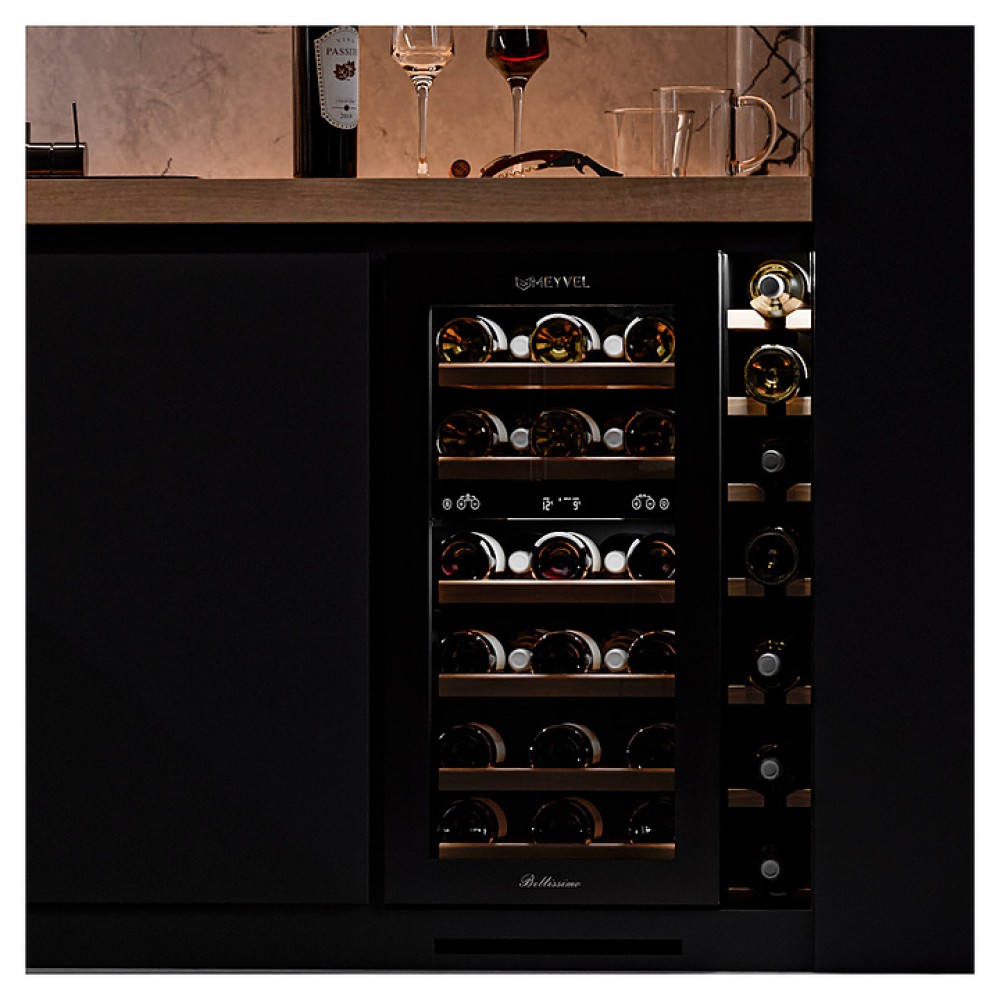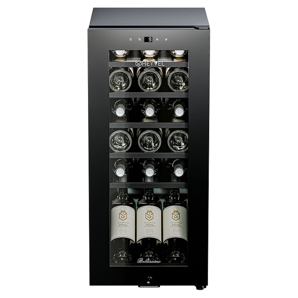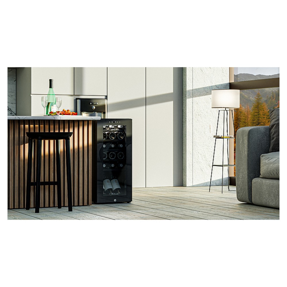 Винный шкаф MEYVEL MV18-KBF1 предназначен для хранения при оптимальных условиях бутилированного вина различных сортов в барах, ресторанах, специализированных магазинах, подсобных складских помещениях, гостиницах, а также домашних условиях. Модель оснащена монотемпературной холодильной камерой, распашной дверью на внешних петлях, прозрачным обзорным остеклением, кабелем питания с вилкой, внешней сенсорной панелью управления и цифровым светодиодным дисплеем с белой подсветкой индикации. Корпус выполнен из стали с черным покрытием, полки – из массива древесины с металлической окантовкой фронта.