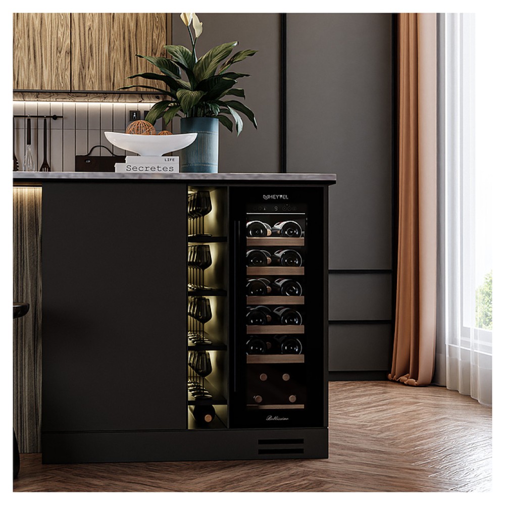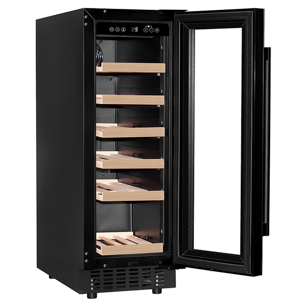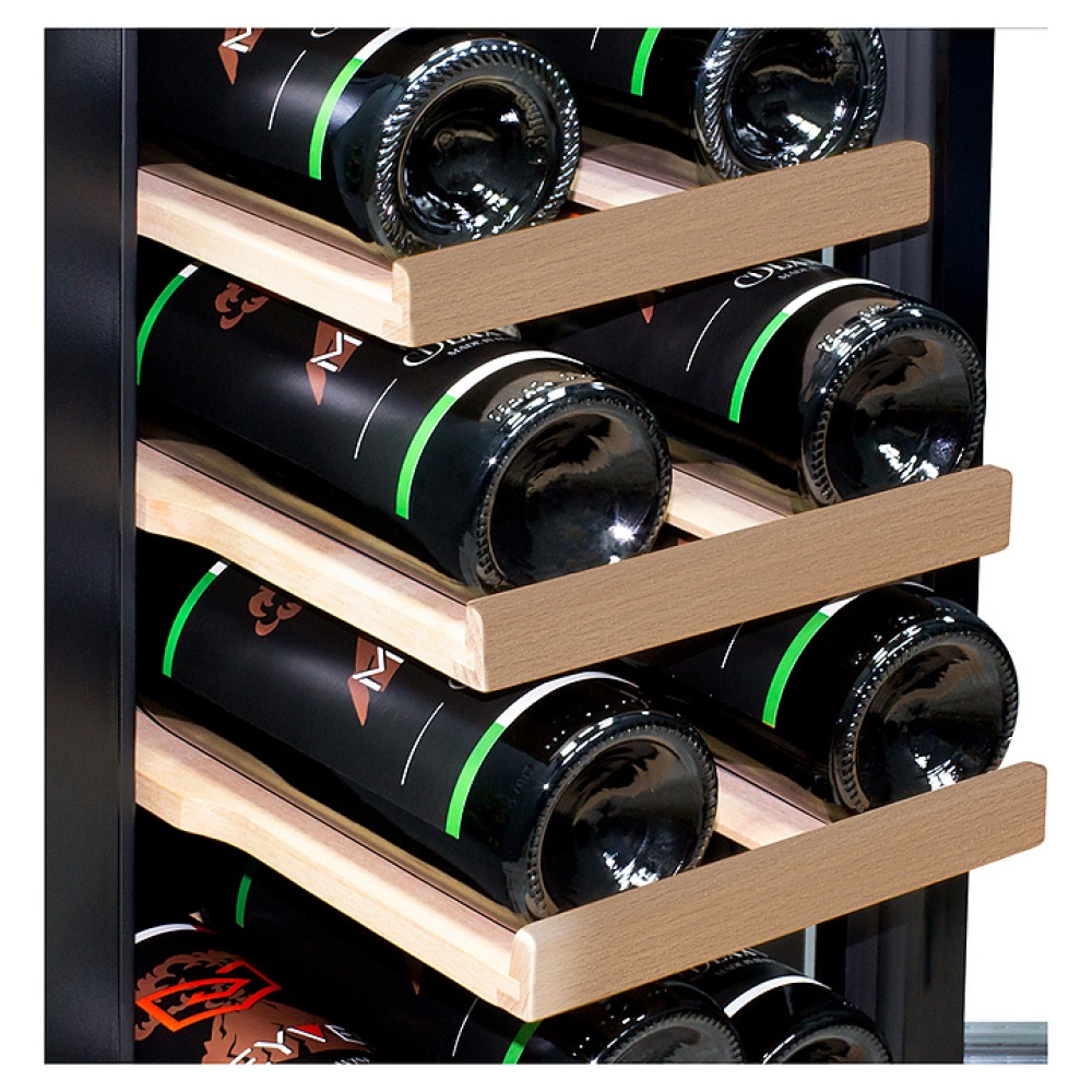 Винный шкаф MEYVEL MV19-KBT1 предназначен для демонстрации, хранения и создания оптимальных условий для сохранения всех вкусовых свойств вина в бутылках на предприятиях общественного питания, торговли, в барах, ресторанах, специализированных магазинах, частных домах или квартирах. Модель оснащена сенсорной панелью управления, электронным термостатом и внутренней светодиодной подсветкой. Корпус и дверная ручка выполнены из окрашенной в черный цвет стали, дверь - из тройного стекла с УФ защитой с черной рамкой, полки - из массива бука.