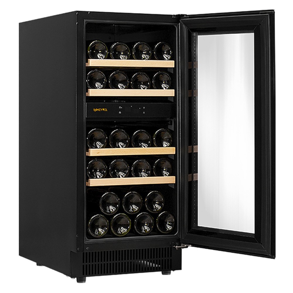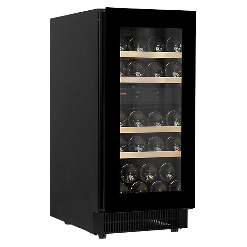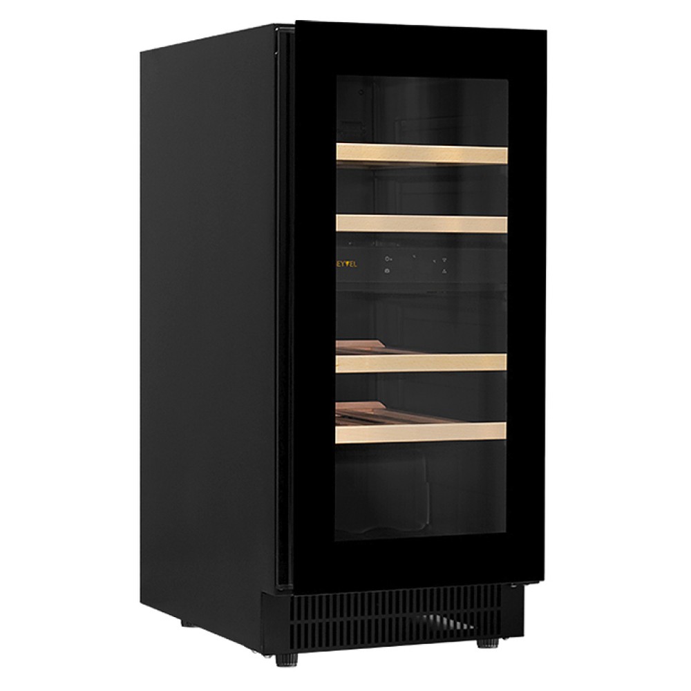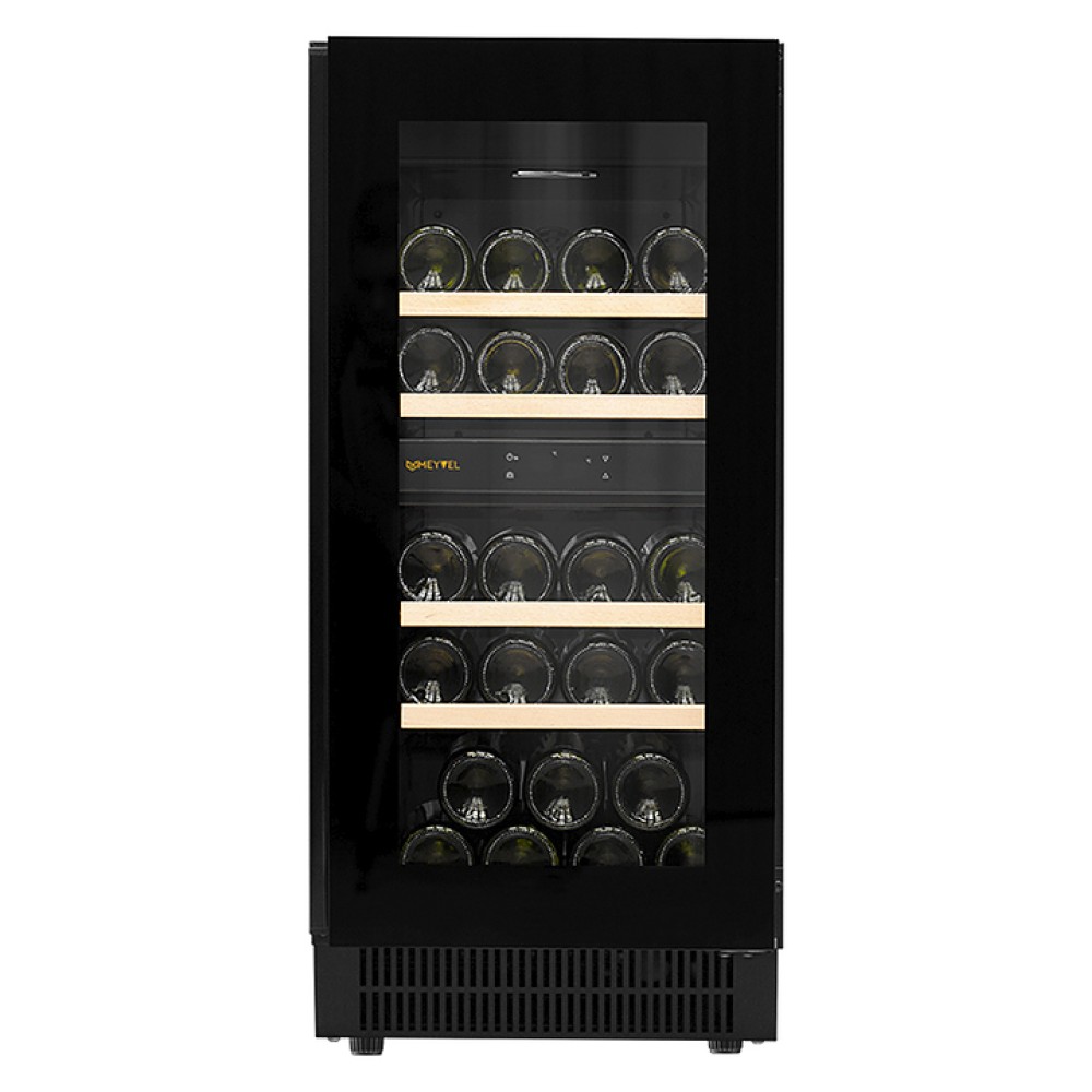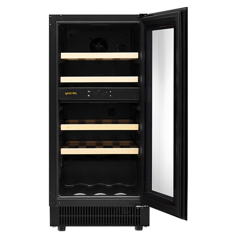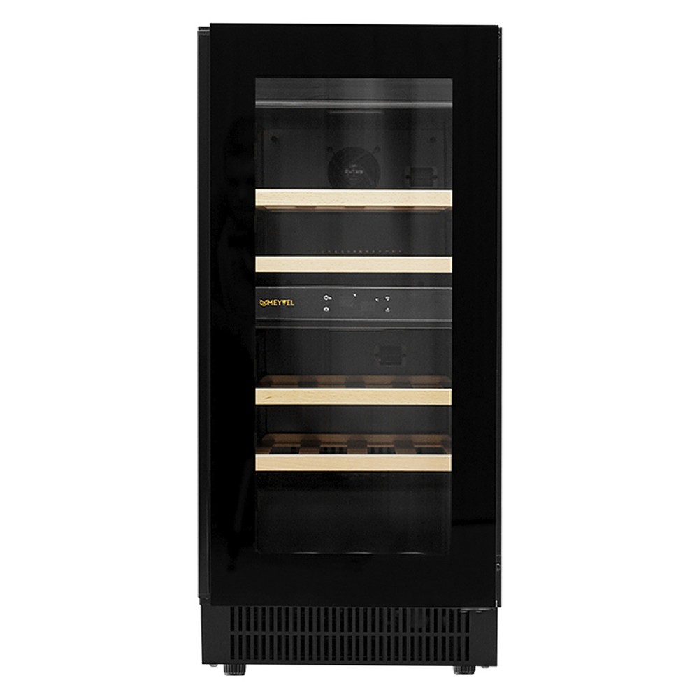 Винный шкаф MEYVEL MV28-KBT2 предназначен для демонстрации, хранения и создания оптимальных условий для сохранения всех вкусовых свойств вина в бутылках на предприятиях общественного питания, торговли, в барах, ресторанах, специализированных магазинах, частных домах или квартирах. Модель оснащена сенсорной панелью управления, электронным термостатом и внутренней синей светодиодной подсветкой. Корпус и дверная ручка выполнены из окрашенной в черный цвет стали, дверь - из двойного стекла с УФ защитой с черной рамкой, полки - из массива бука.