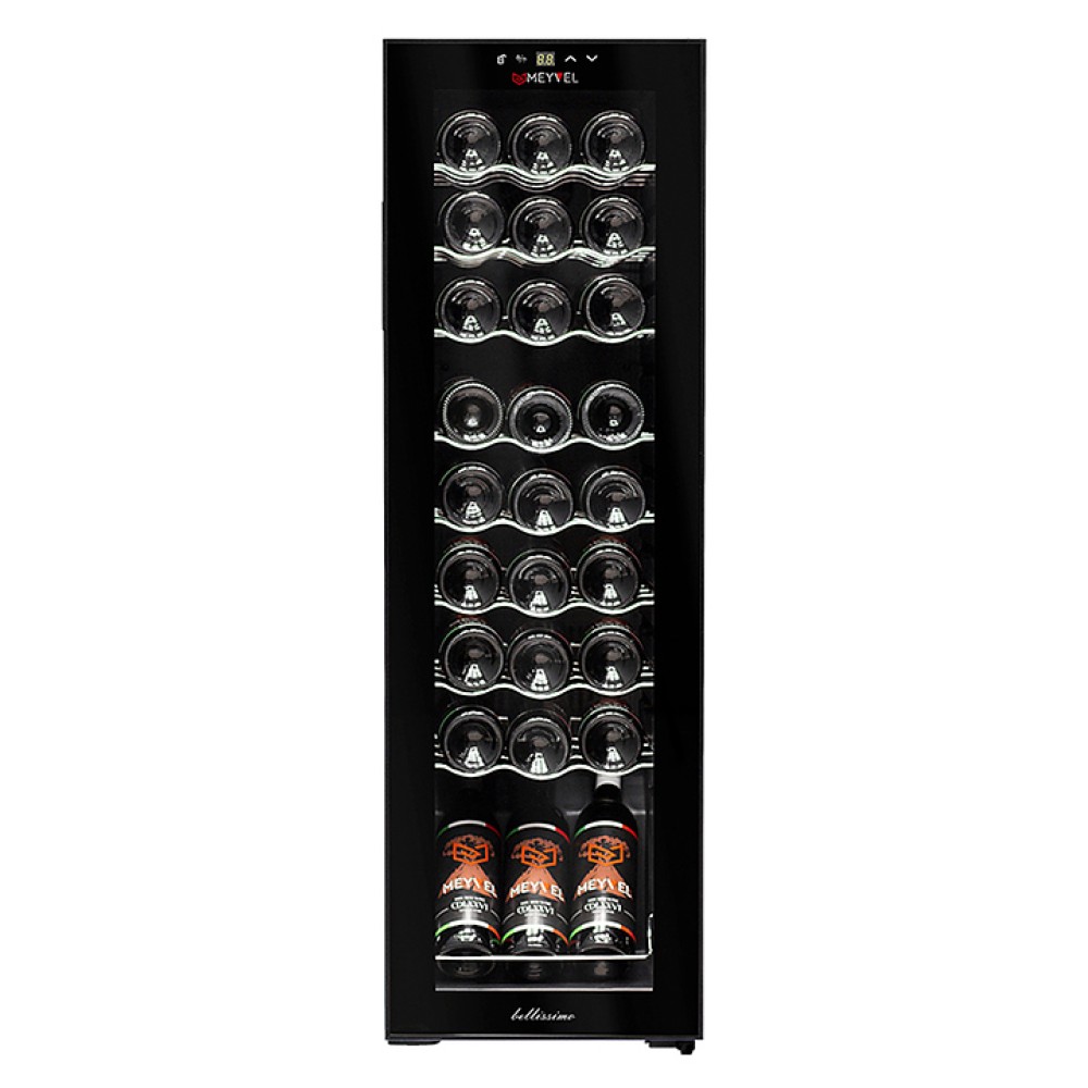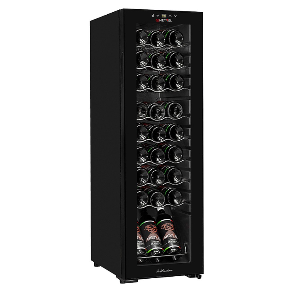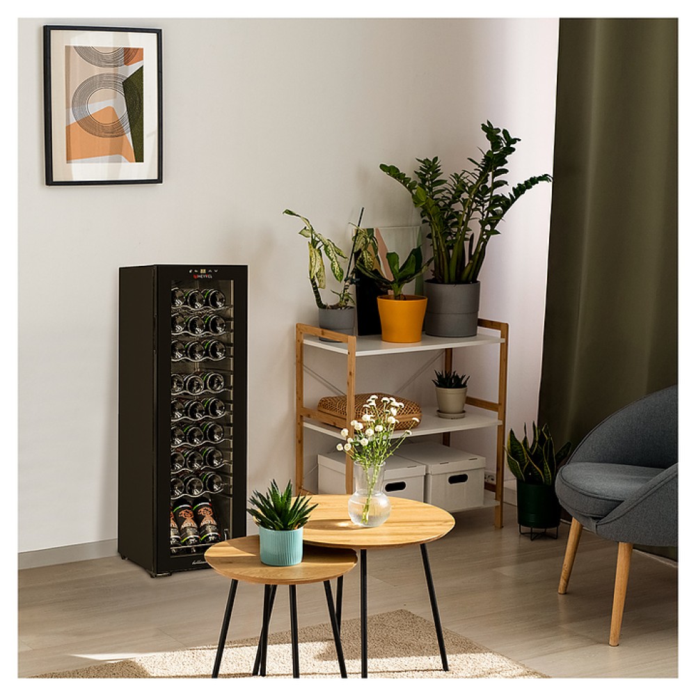 Винный шкаф MEYVEL MV27-CBD1 предназначен для демонстрации, хранения и создания оптимальных условий для сохранения всех вкусовых свойств вина в бутылках на предприятиях общественного питания, торговли, в барах, ресторанах, специализированных магазинах, частных домах или квартирах. Модель оснащена сенсорной панелью управления, электронным термостатом и светодиодной подсветкой белого цвета. Корпус выполнен из окрашенной в черный цвет стали, дверь - из пластиковой рамы и двойного стекла с защитой от ультрафиолетовых лучей, полки - из хромированного металла.