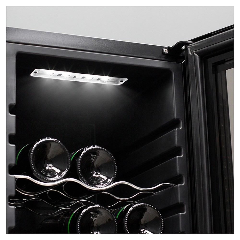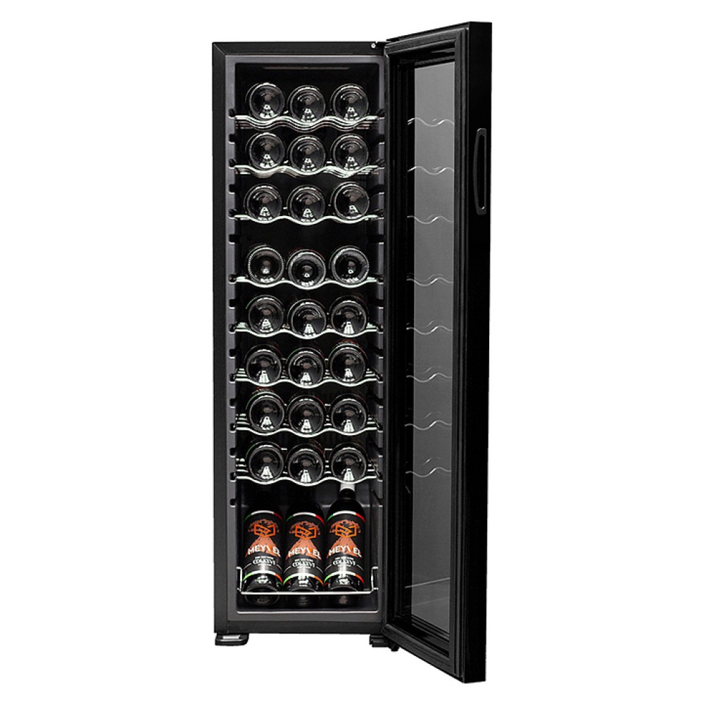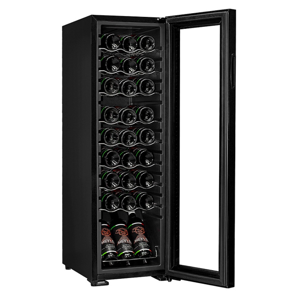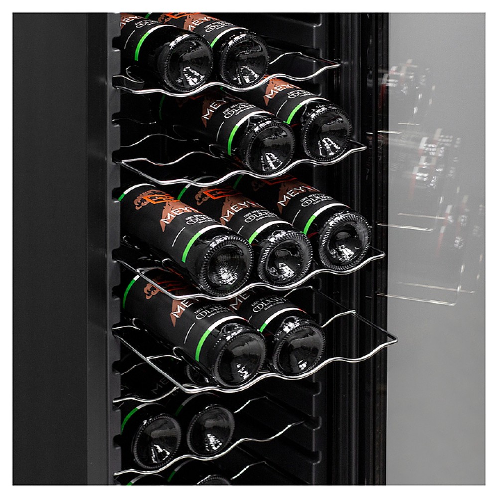 Винный шкаф MEYVEL MV27-CBD1 предназначен для демонстрации, хранения и создания оптимальных условий для сохранения всех вкусовых свойств вина в бутылках на предприятиях общественного питания, торговли, в барах, ресторанах, специализированных магазинах, частных домах или квартирах. Модель оснащена сенсорной панелью управления, электронным термостатом и светодиодной подсветкой белого цвета. Корпус выполнен из окрашенной в черный цвет стали, дверь - из пластиковой рамы и двойного стекла с защитой от ультрафиолетовых лучей, полки - из хромированного металла.