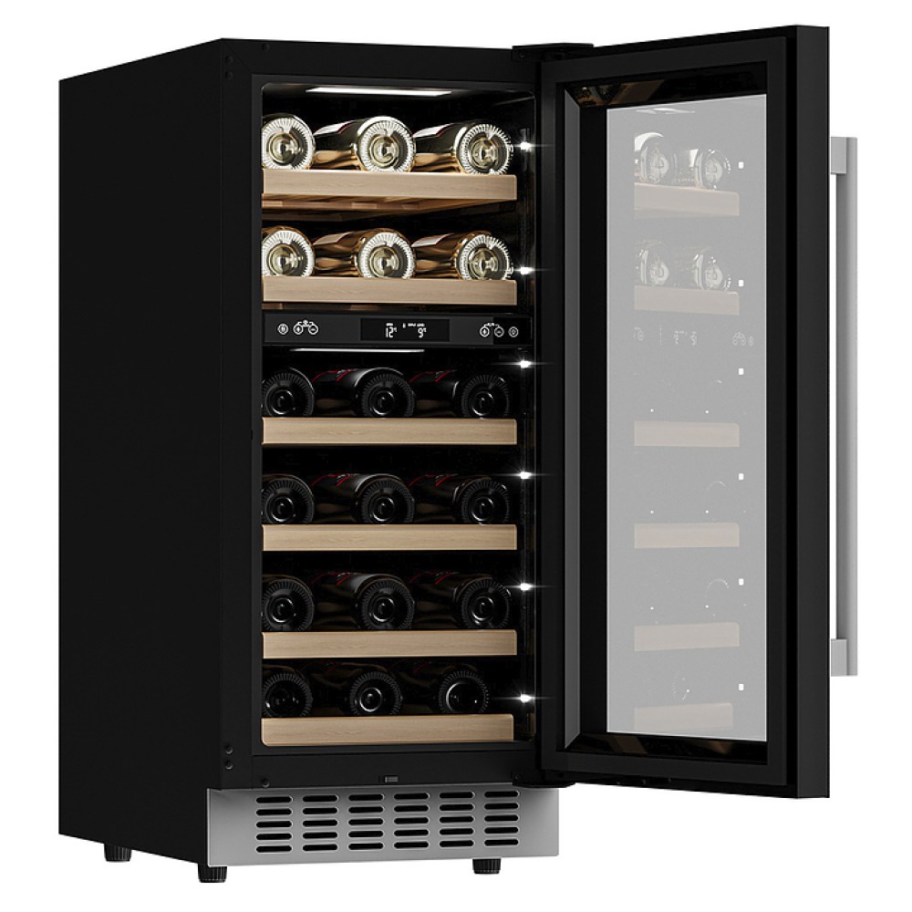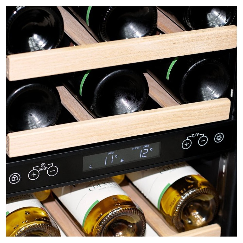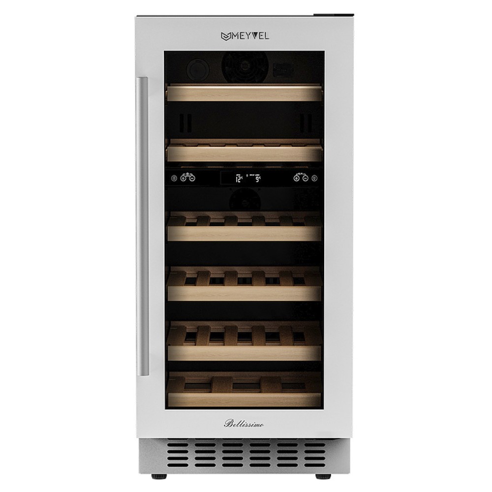Винный шкаф MEYVEL MV28-KWT2 предназначен для демонстрации, хранения и создания оптимальных условий для сохранения всех вкусовых свойств вина в бутылках на предприятиях общественного питания, торговли, в барах, ресторанах, специализированных магазинах, частных домах или квартирах. Модель оснащена сенсорной панелью управления, 2 электронными термостатами и внутренней белой светодиодной подсветкой. Корпус выполнен из окрашенной в черный цвет стали, дверь - из тройного стекла с УФ защитой с белой рамкой, полки - из массива бука.