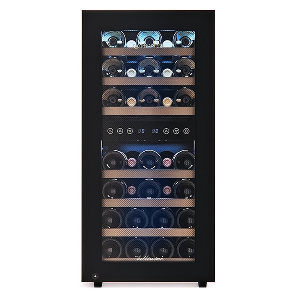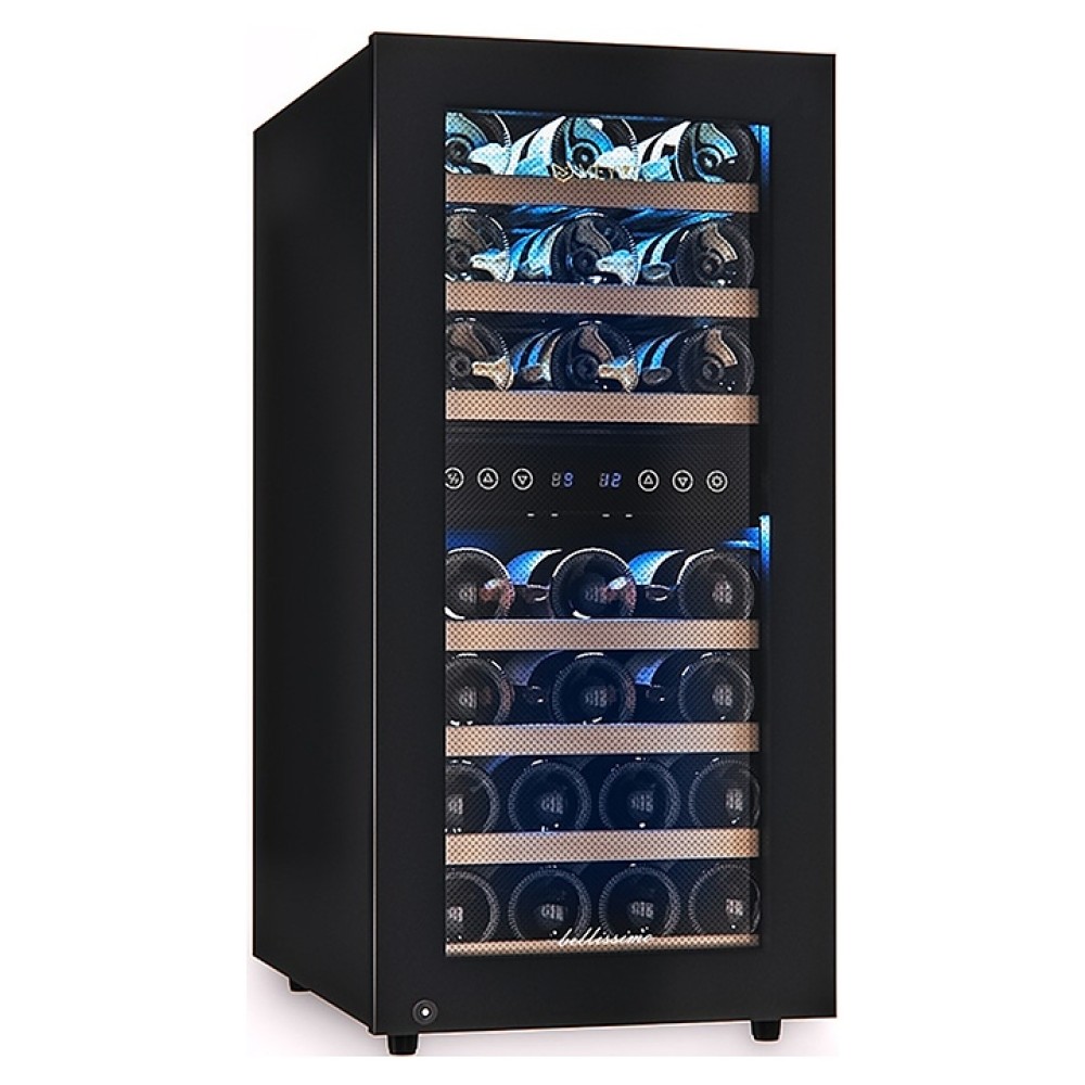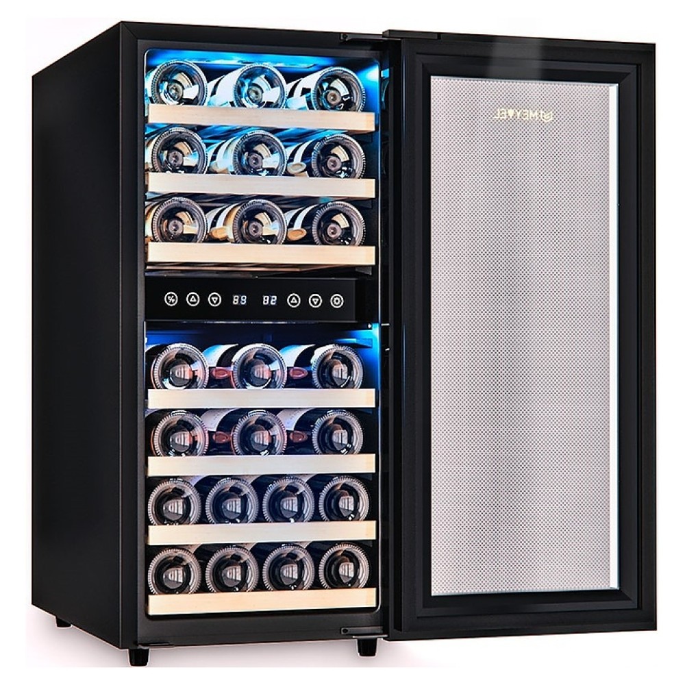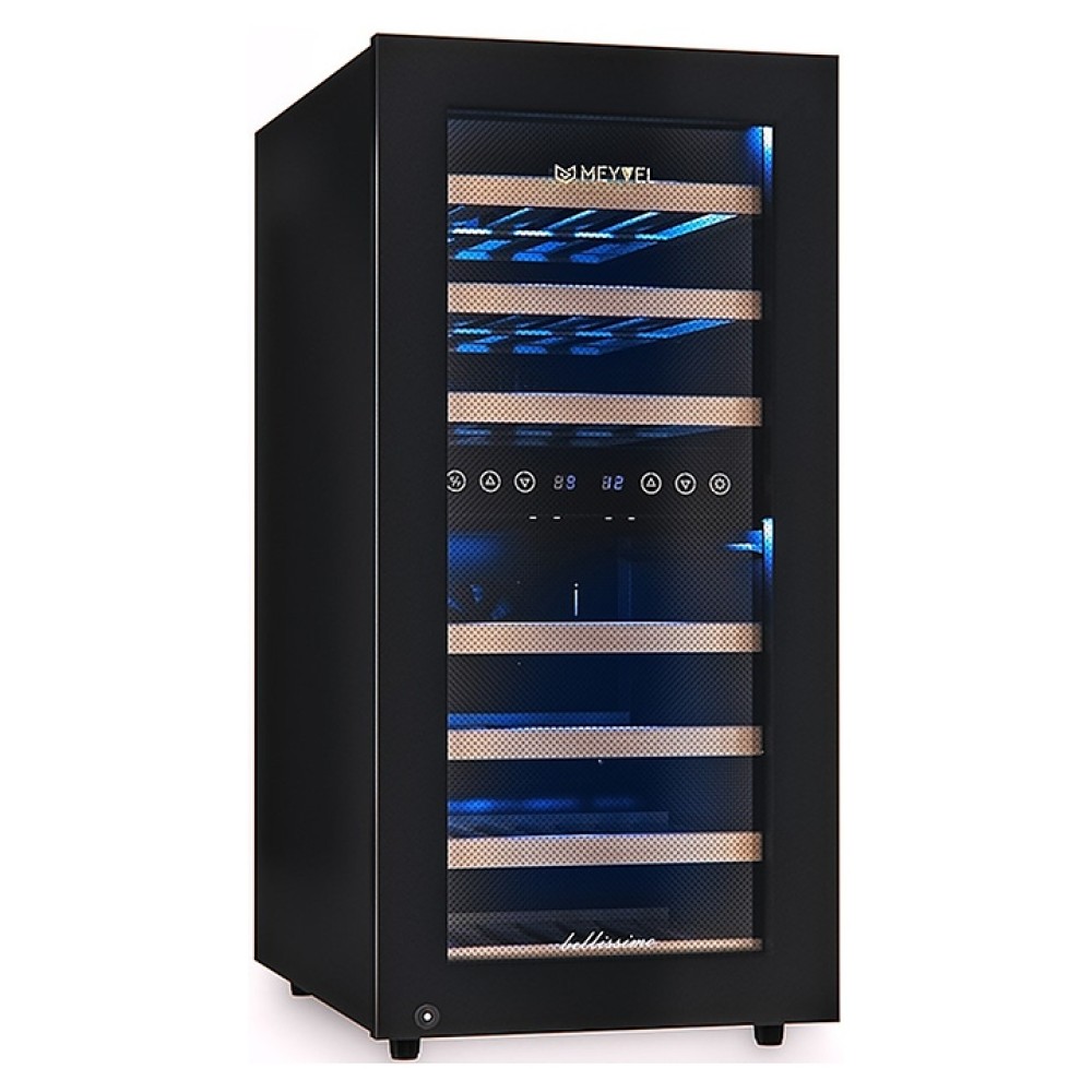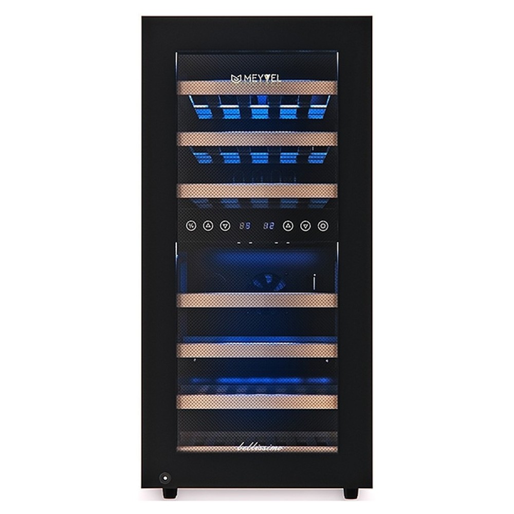 Винный шкаф MEYVEL MV33-KBF2 предназначен для демонстрации, хранения и создания оптимальных условий для сохранения всех вкусовых свойств вина в бутылках на предприятиях общественного питания, торговли, в барах, ресторанах, специализированных магазинах, частных домах или квартирах. Модель оснащена сенсорной панелью управления, электронным термостатом и светодиодной подсветкой синего цвета в каждой зоне. Корпус выполнен из окрашенной в черный цвет стали, дверь - из пластиковой рамы и тонированного стекла с защитой от ультрафиолетовых лучей, полки - из массива бука.