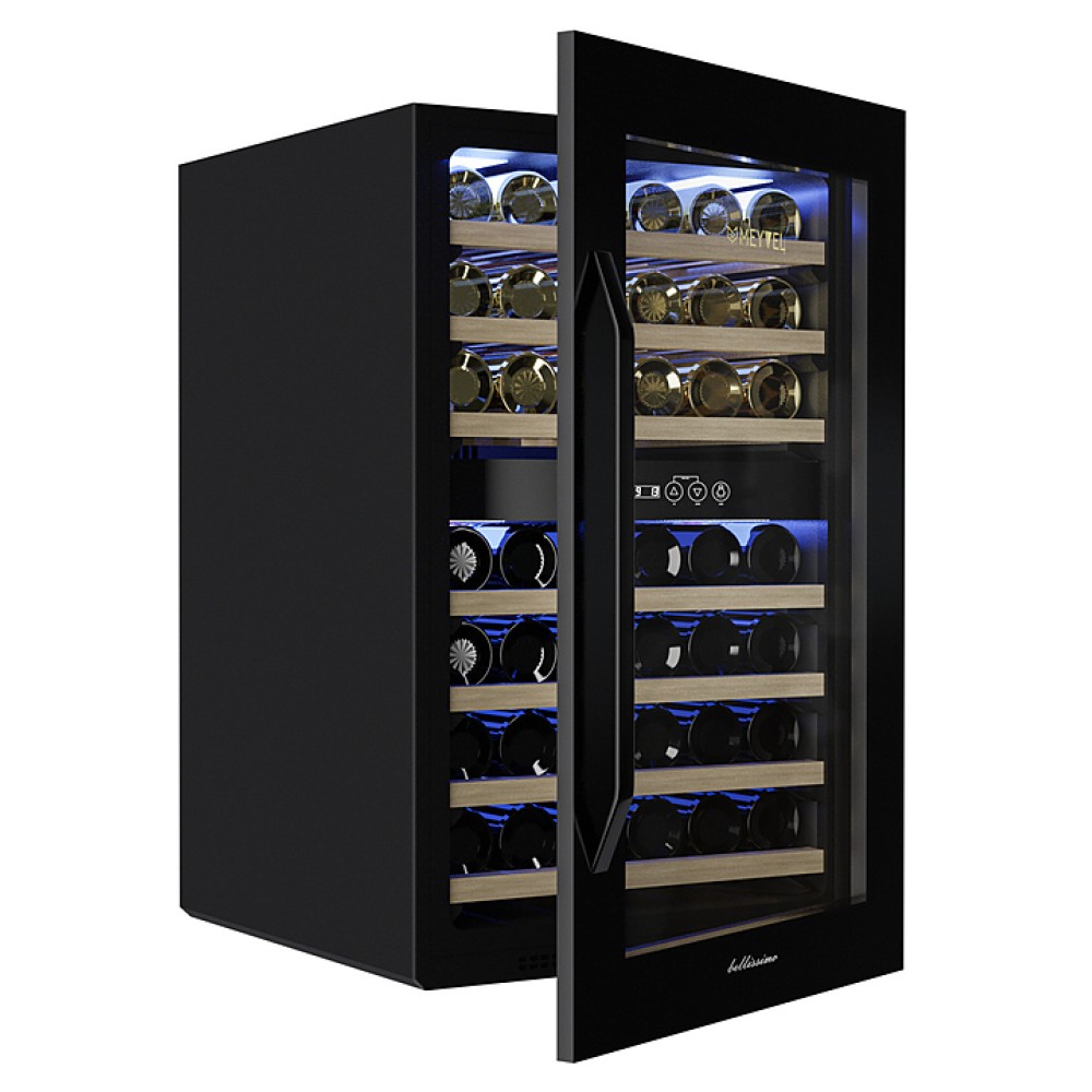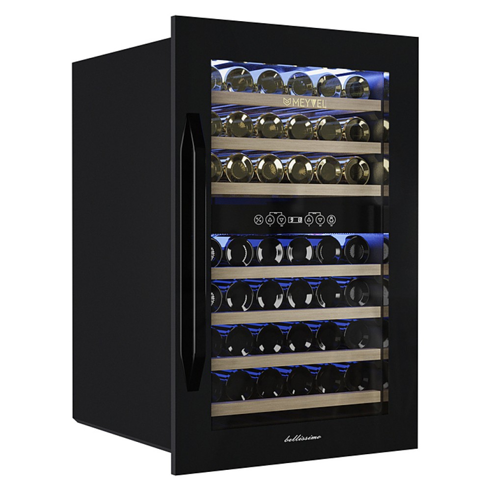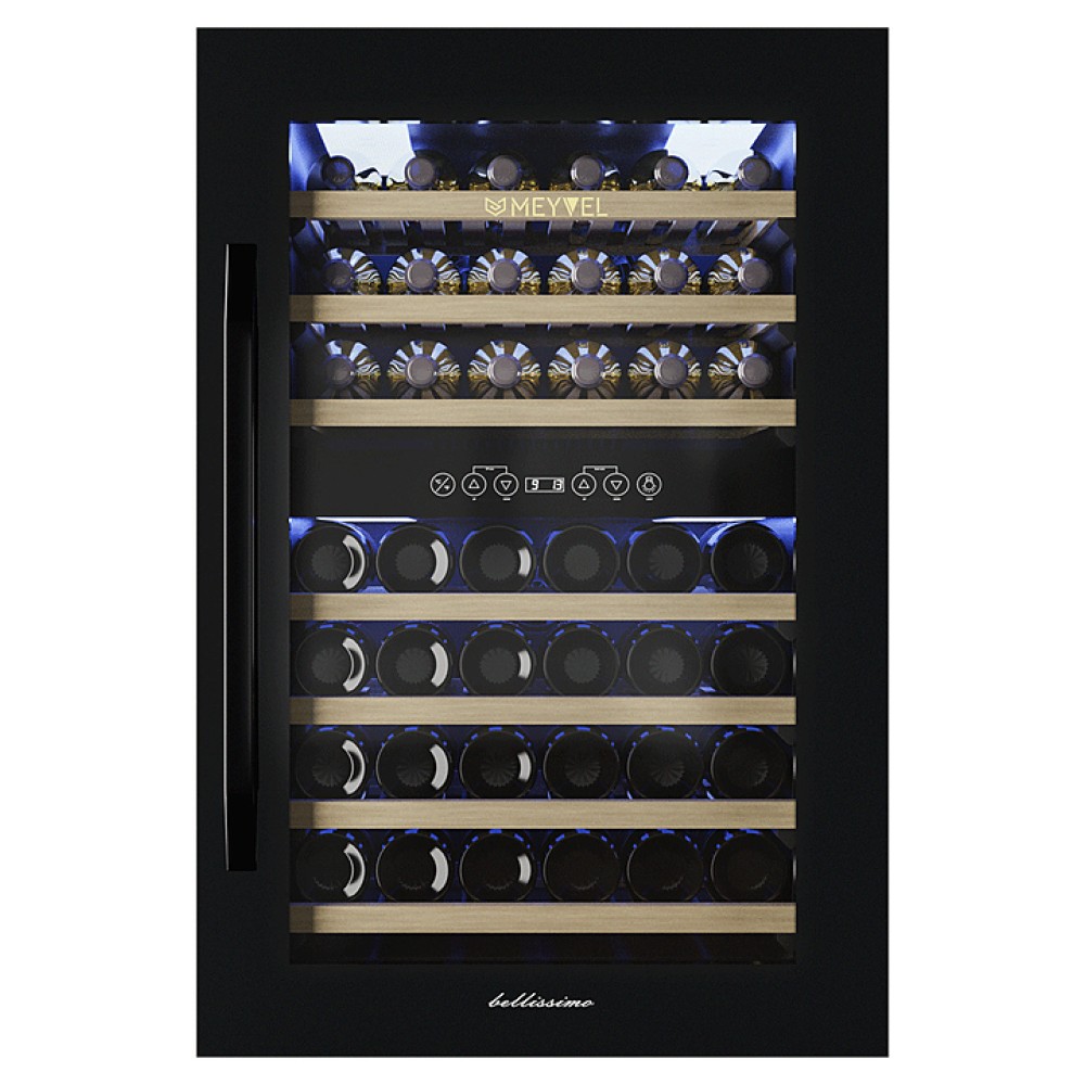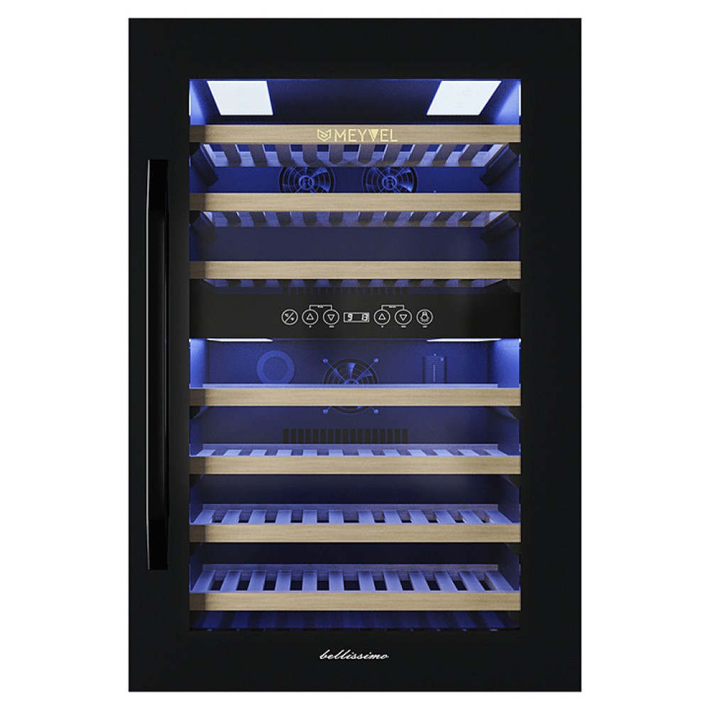 Винный шкаф MEYVEL MV42-KBB2 предназначен для демонстрации, хранения и создания оптимальных условий для сохранения всех вкусовых свойств вина в бутылках на предприятиях общественного питания, торговли, в барах, ресторанах, специализированных магазинах, частных домах или квартирах. Модель оснащена сенсорной панелью управления, 2 электронными термостатами и внутренней светодиодной подсветкой. Корпус и дверная ручка выполнены из окрашенной в черный цвет стали, дверь - из двойного стекла с УФ защитой с черной рамкой, полки - из массива бука.