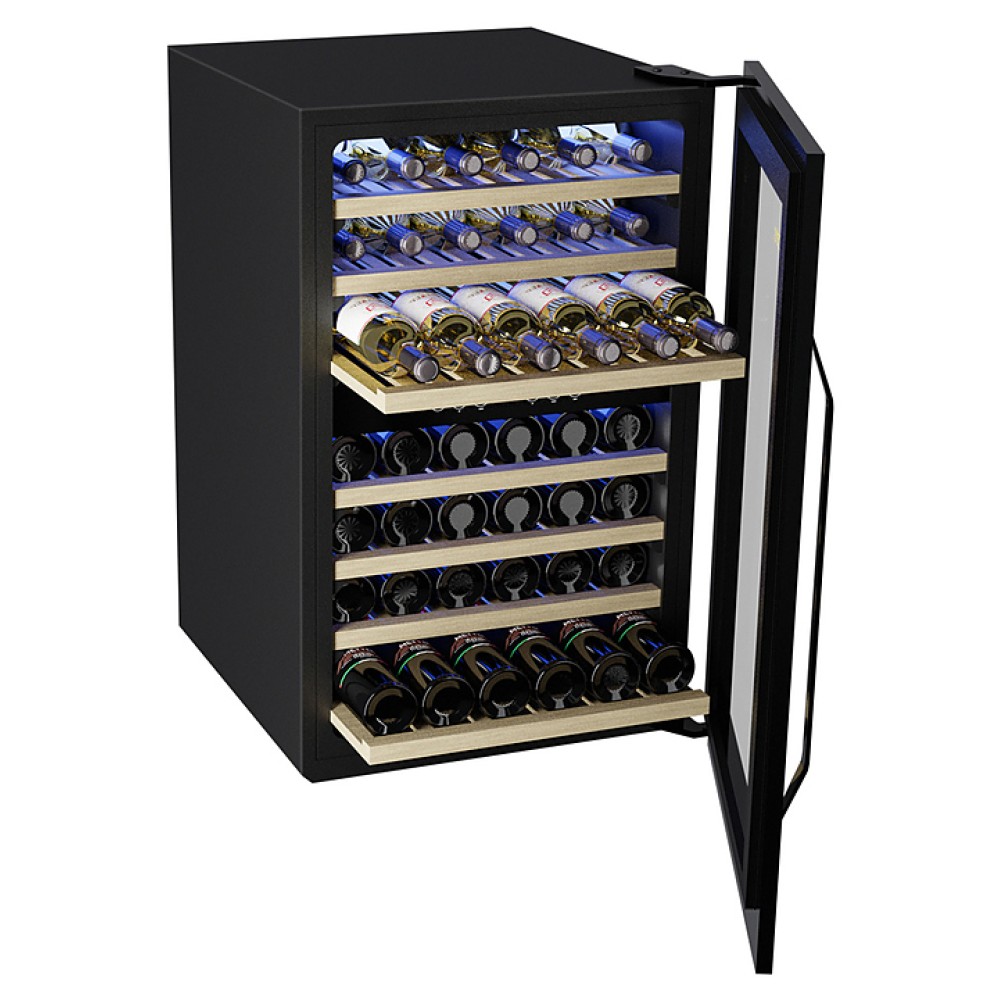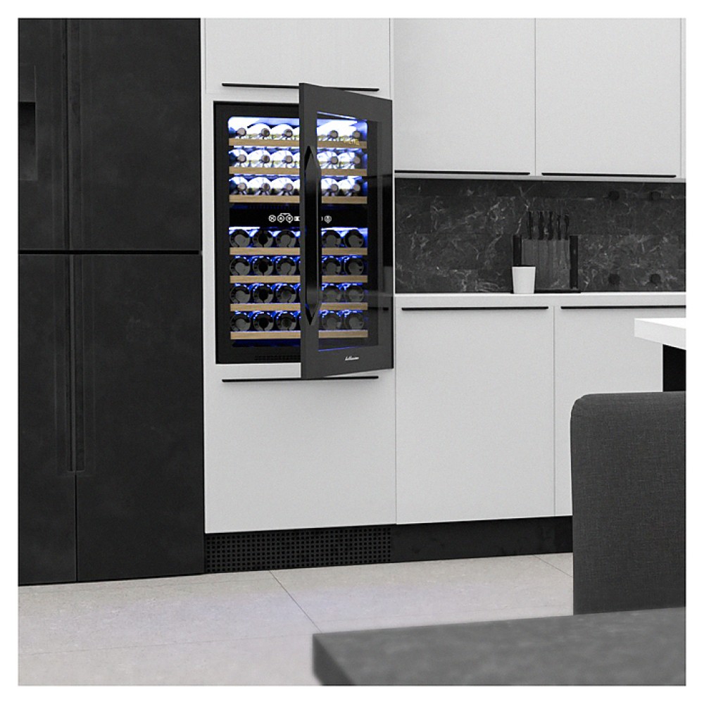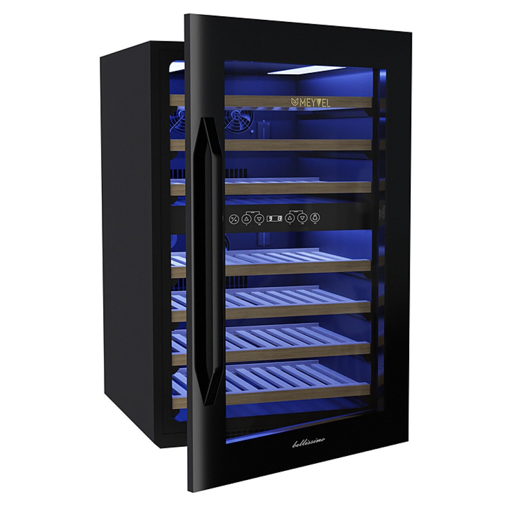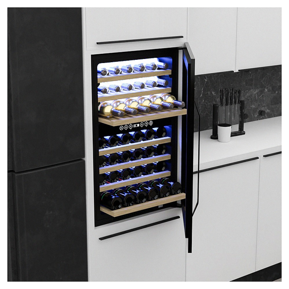 Винный шкаф MEYVEL MV42-KBB2 предназначен для демонстрации, хранения и создания оптимальных условий для сохранения всех вкусовых свойств вина в бутылках на предприятиях общественного питания, торговли, в барах, ресторанах, специализированных магазинах, частных домах или квартирах. Модель оснащена сенсорной панелью управления, 2 электронными термостатами и внутренней светодиодной подсветкой. Корпус и дверная ручка выполнены из окрашенной в черный цвет стали, дверь - из двойного стекла с УФ защитой с черной рамкой, полки - из массива бука.