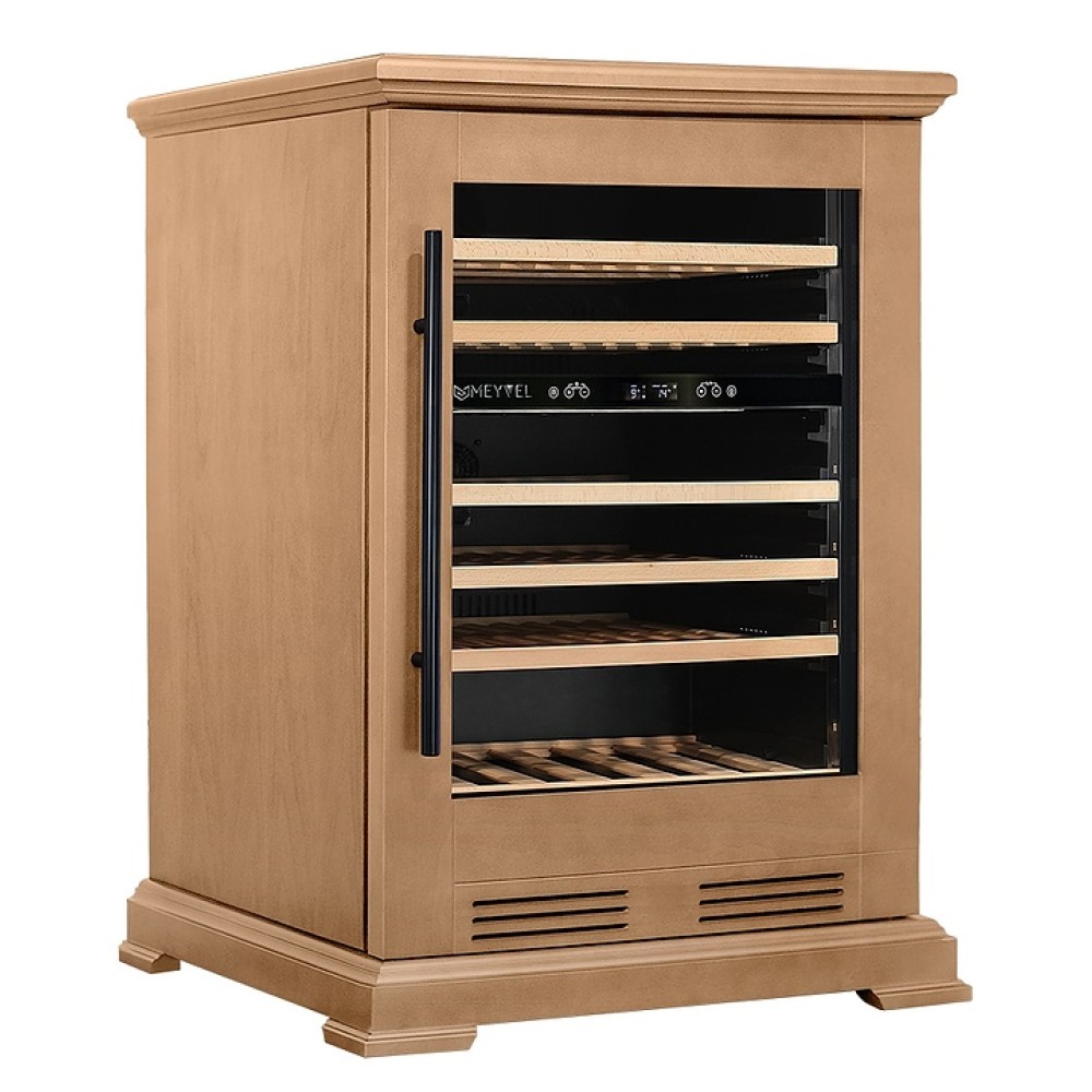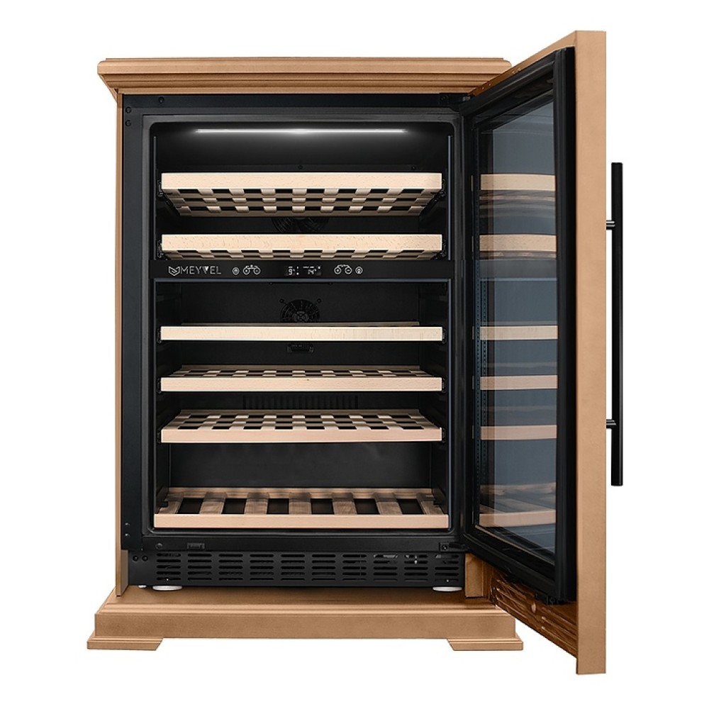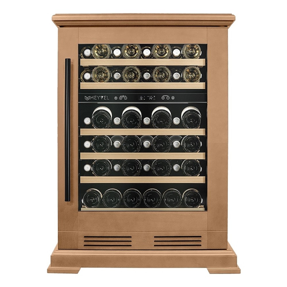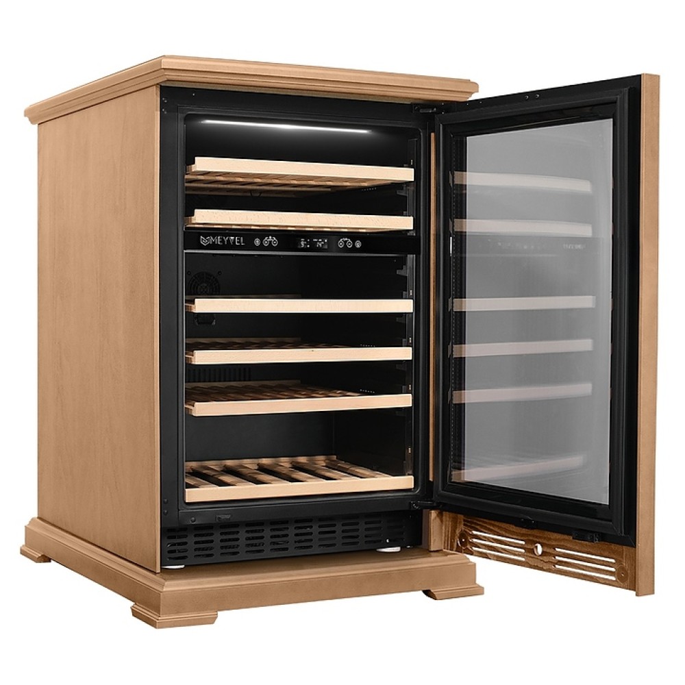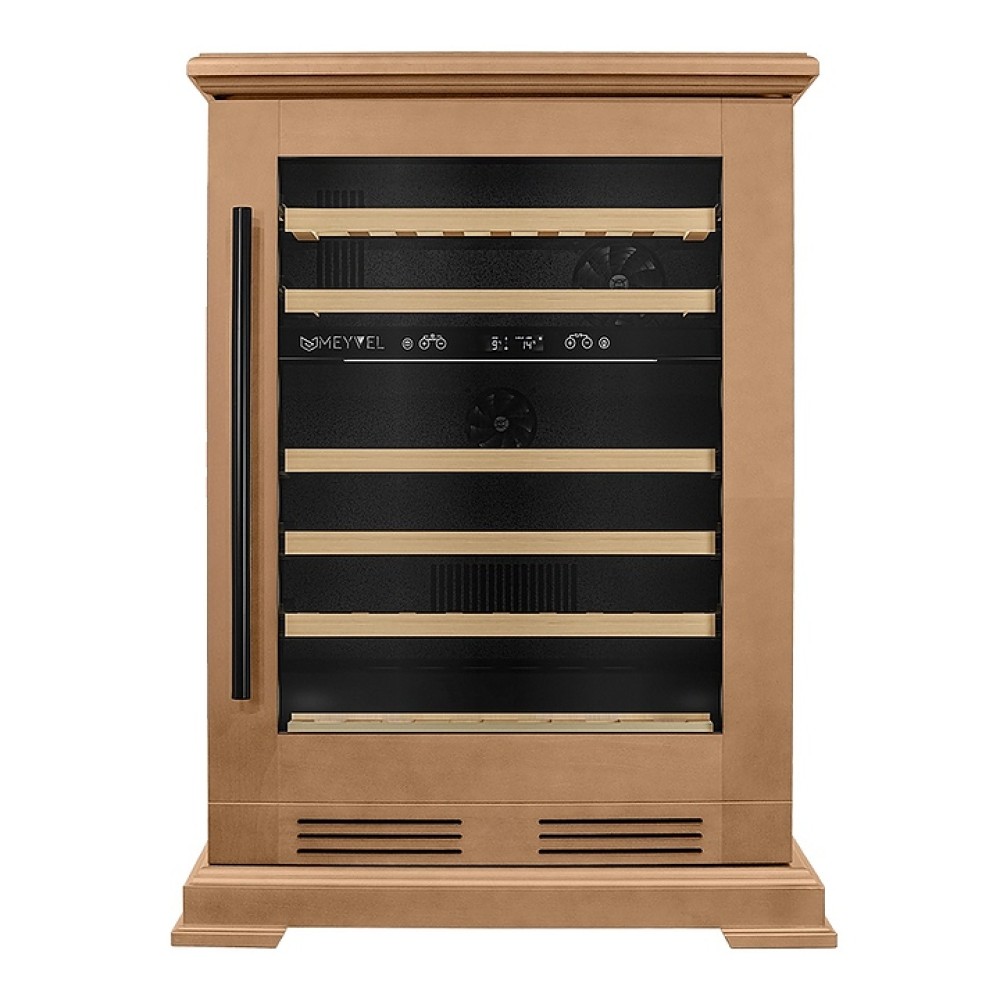 Винный шкаф MEYVEL MV46PRO-KBT2 предназначен для демонстрации, хранения и создания оптимальных условий для сохранения всех вкусовых свойств вина в бутылках на предприятиях общественного питания, торговли, в барах, ресторанах, специализированных магазинах, частных домах или квартирах. Модель оснащена сенсорной панелью управления и внутренней светодиодной подсветкой. Корпус выполнен из стали с обшивкой из дерева, дверь - из тройного стекла с УФ защитой, полки - из массива бука.