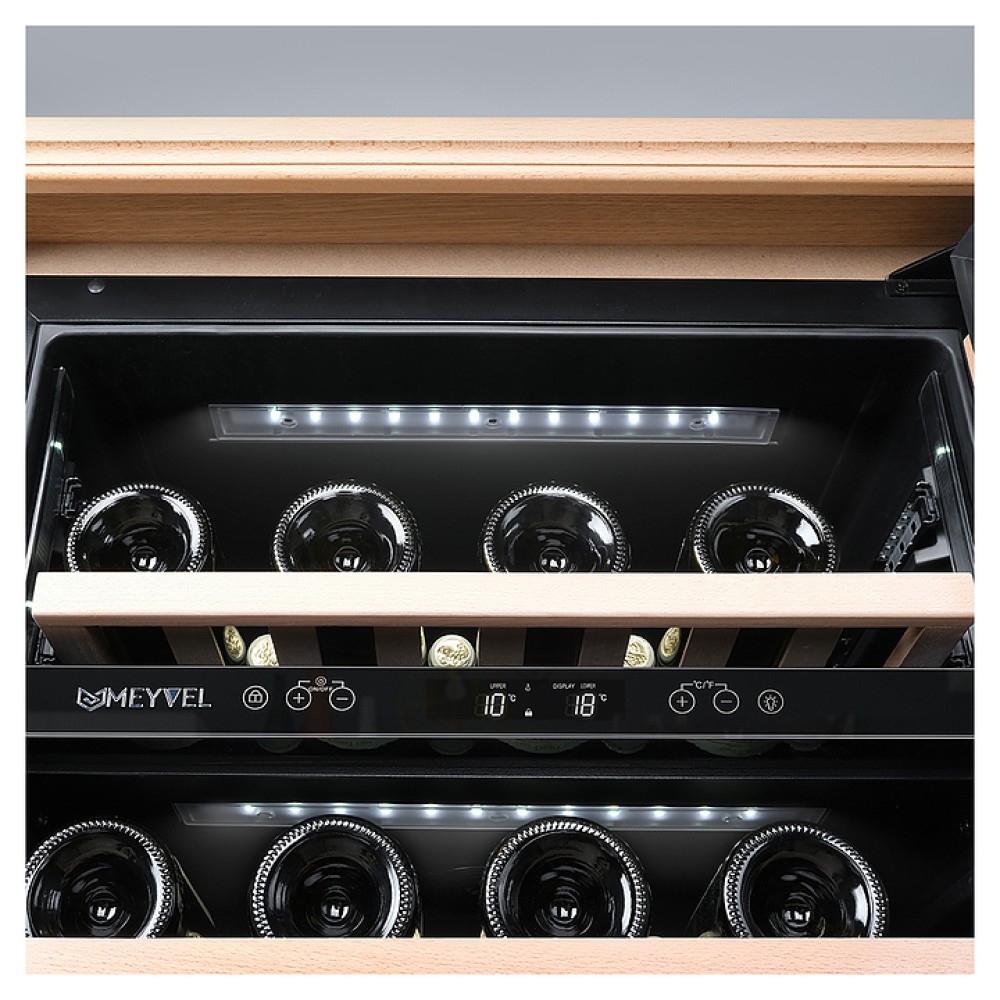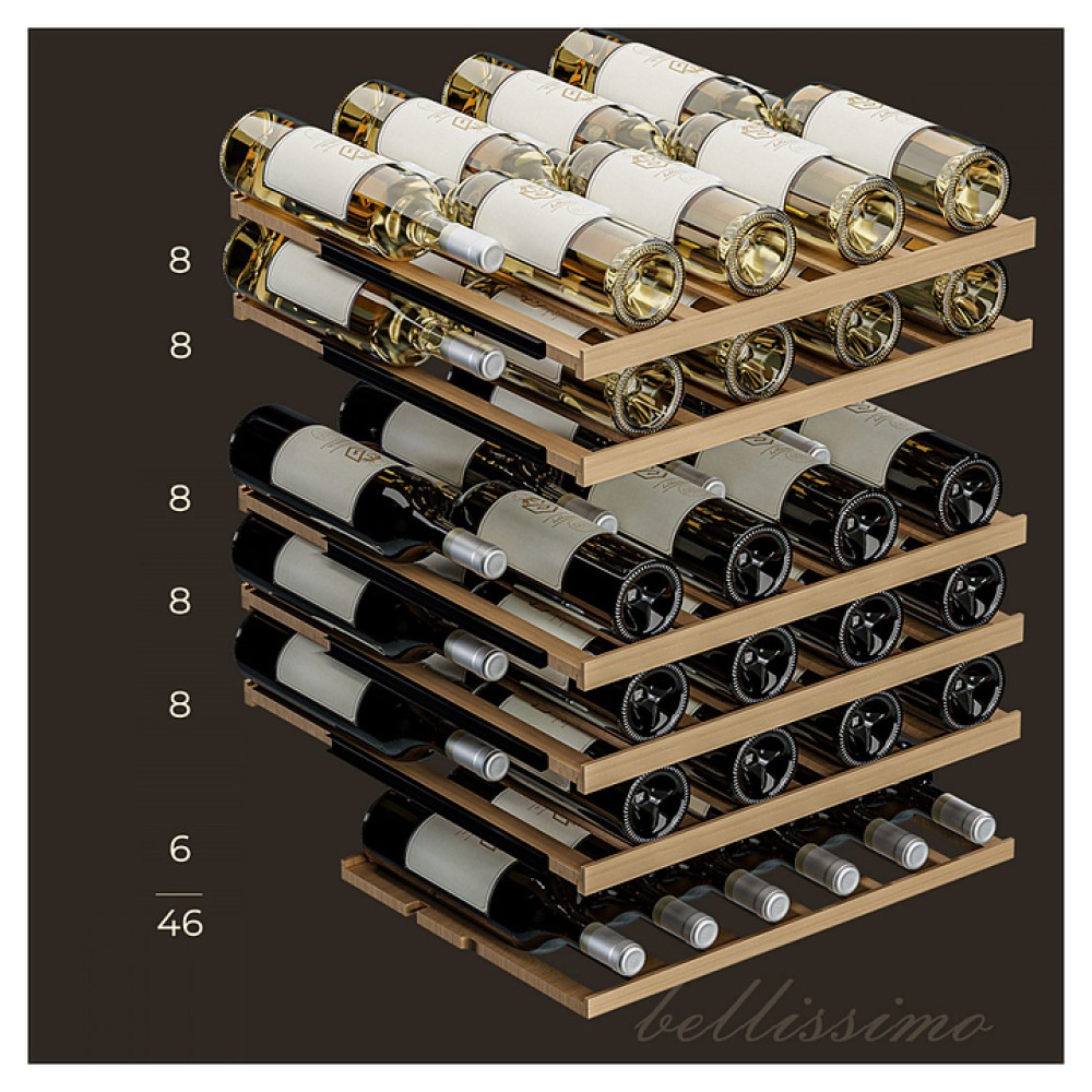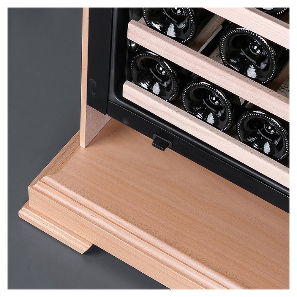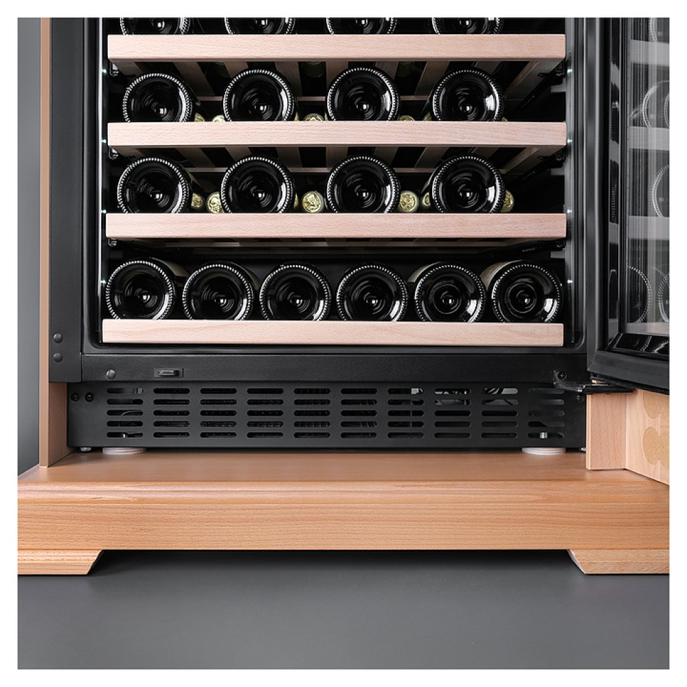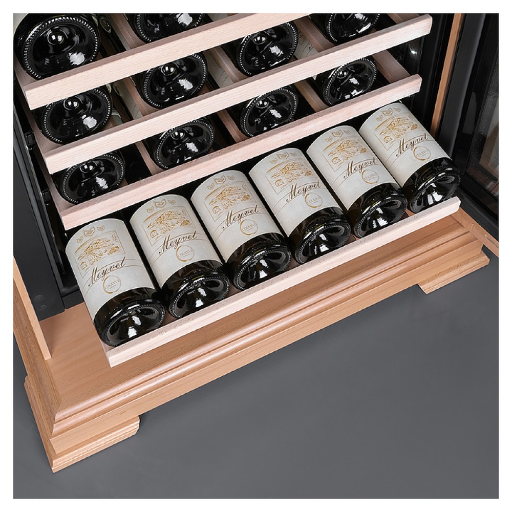 Винный шкаф MEYVEL MV46PRO-KBT2 предназначен для демонстрации, хранения и создания оптимальных условий для сохранения всех вкусовых свойств вина в бутылках на предприятиях общественного питания, торговли, в барах, ресторанах, специализированных магазинах, частных домах или квартирах. Модель оснащена сенсорной панелью управления и внутренней светодиодной подсветкой. Корпус выполнен из стали с обшивкой из дерева, дверь - из тройного стекла с УФ защитой, полки - из массива бука.