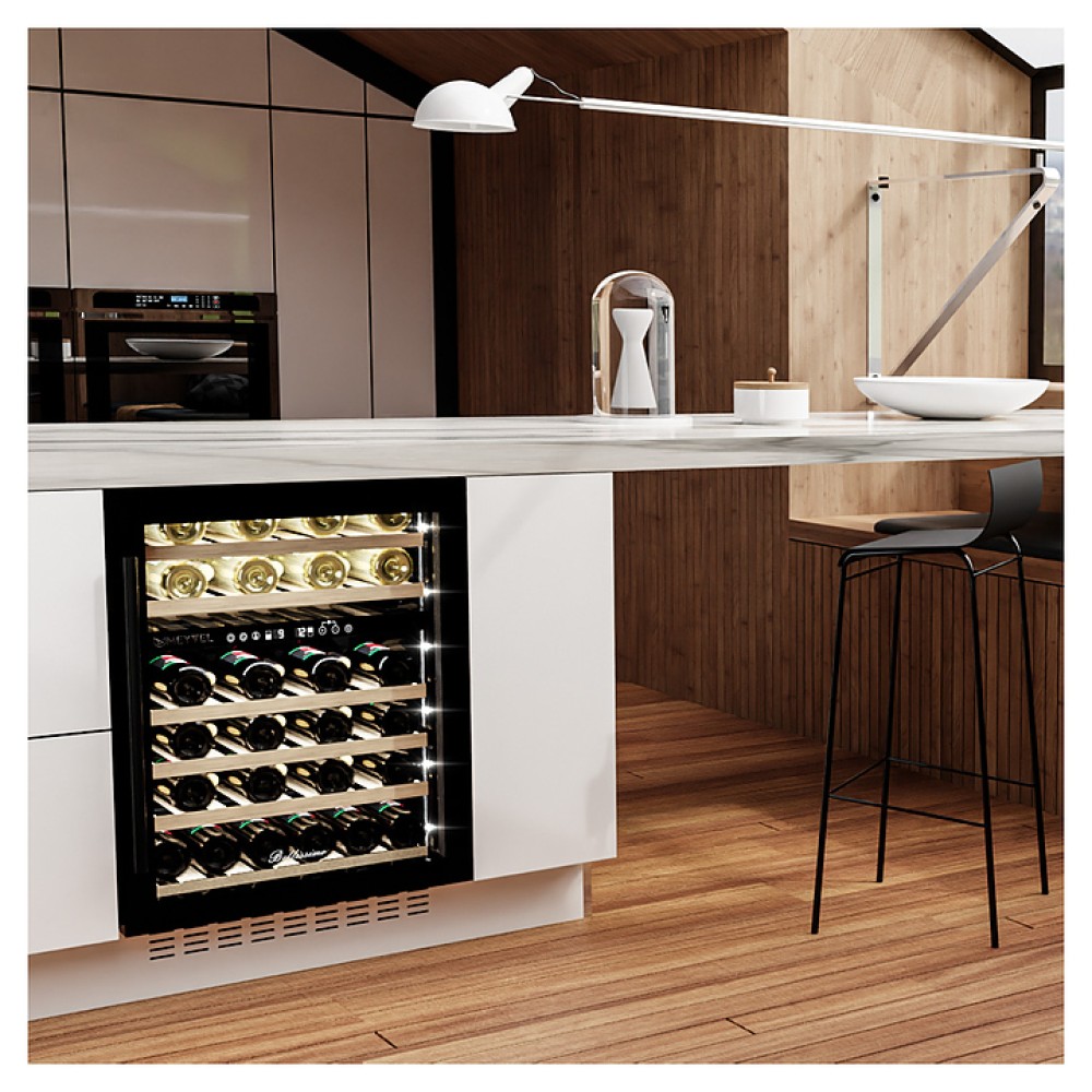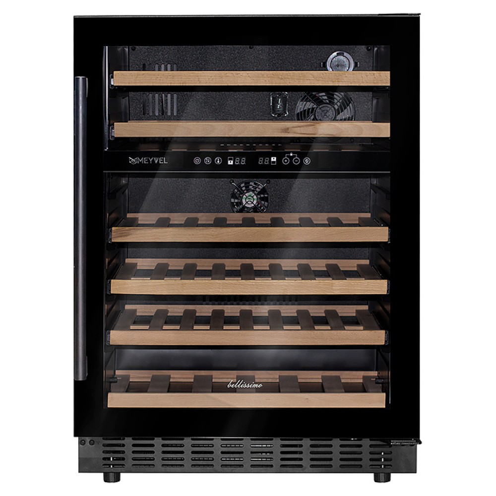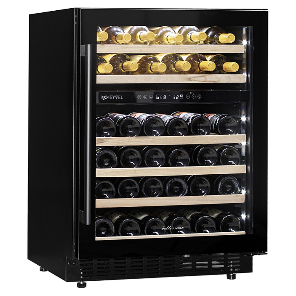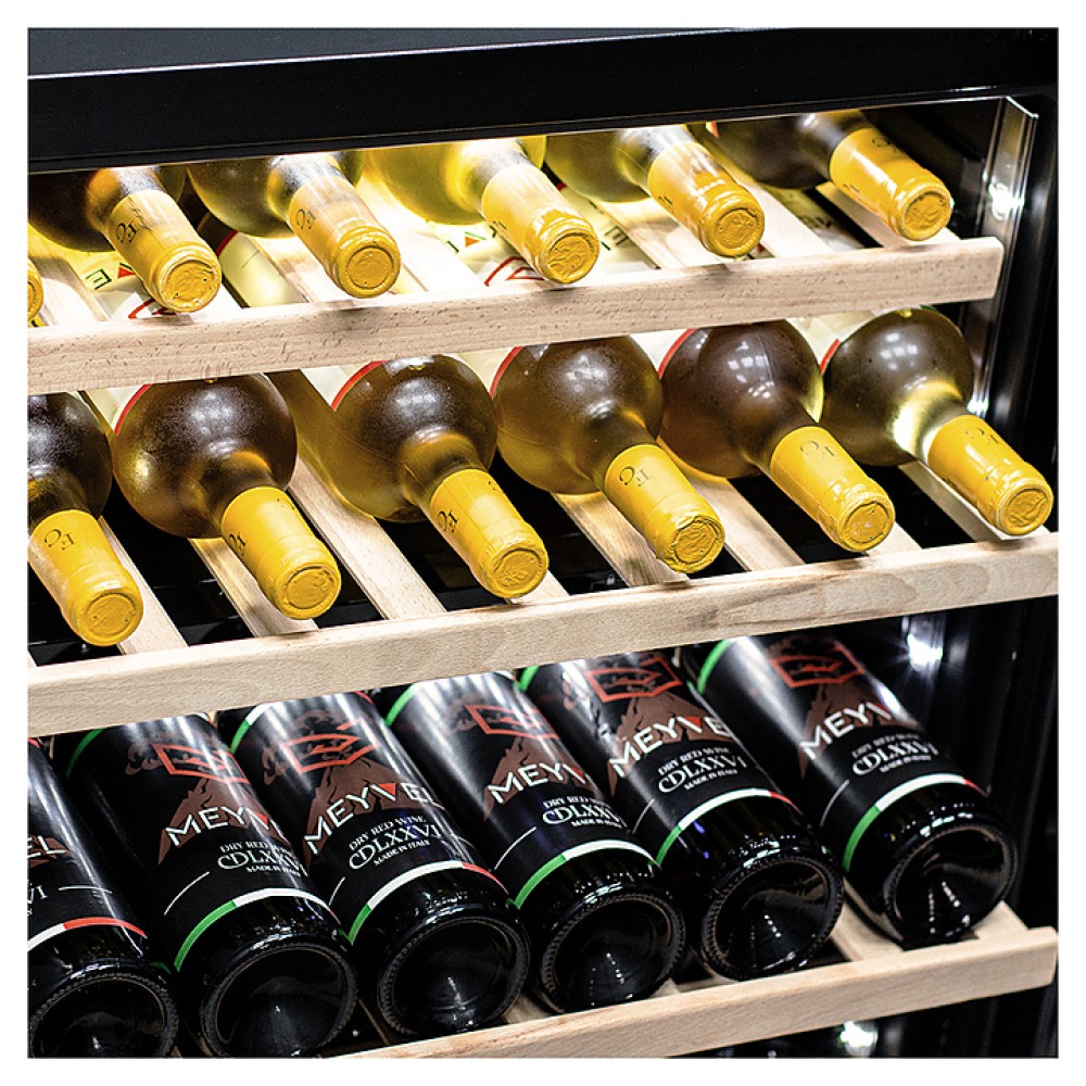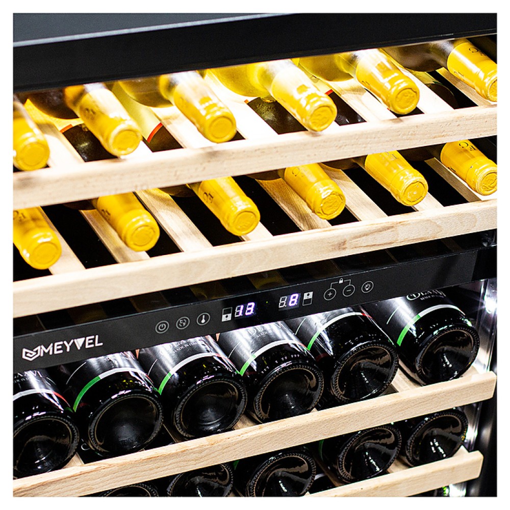 Винный шкаф MEYVEL MV46PRO-KBT2 предназначен для демонстрации, хранения и создания оптимальных условий для сохранения всех вкусовых свойств вина в бутылках на предприятиях общественного питания, торговли, в барах, ресторанах, специализированных магазинах, частных домах или квартирах. Модель оснащена сенсорной панелью управления, 2 электронными термостатами и внутренней белой светодиодной подсветкой. Корпус и дверная ручка выполнены из окрашенной в черный цвет стали, дверь - из тройного стекла с УФ защитой с черной рамкой, полки - из массива бука.
