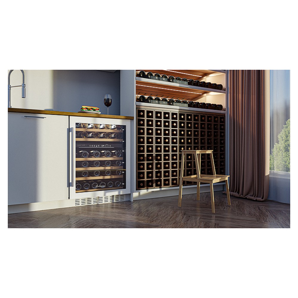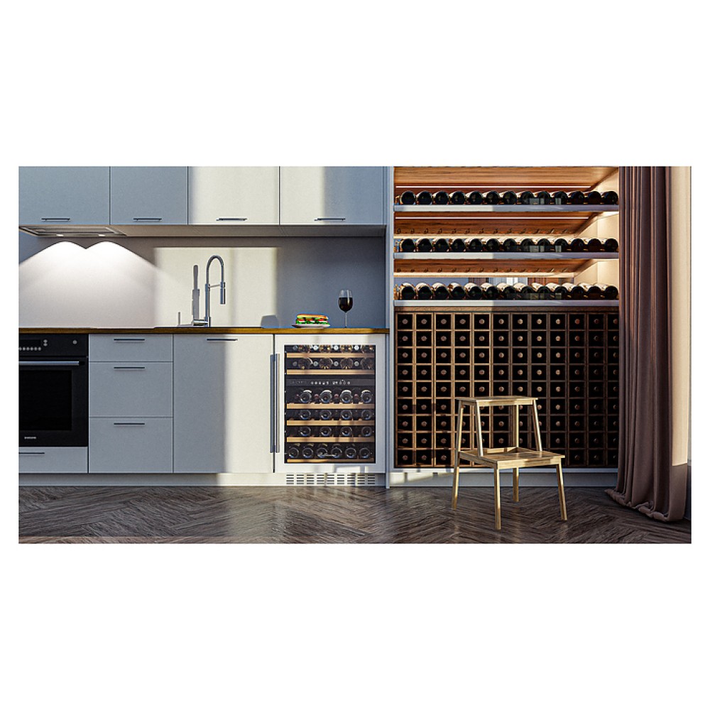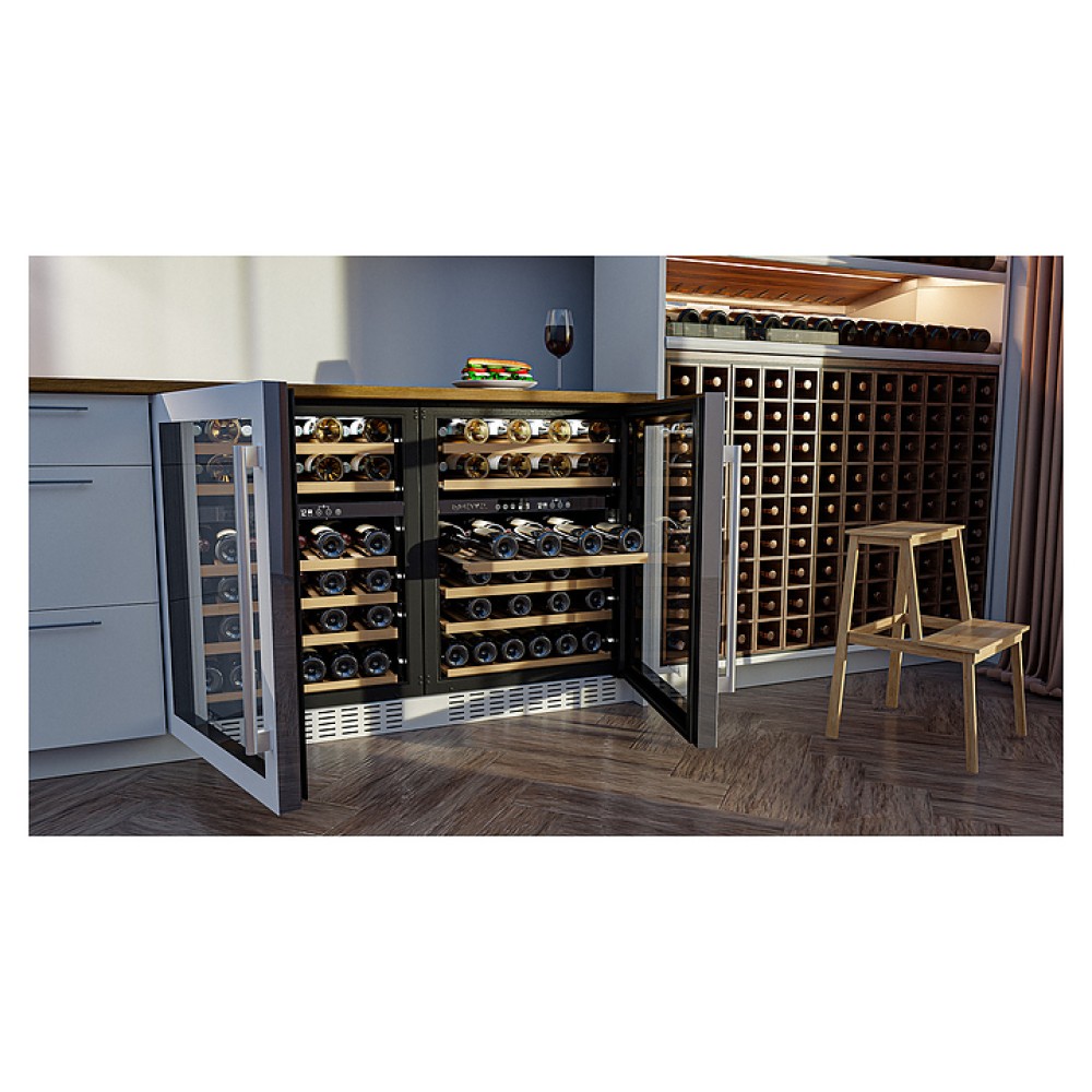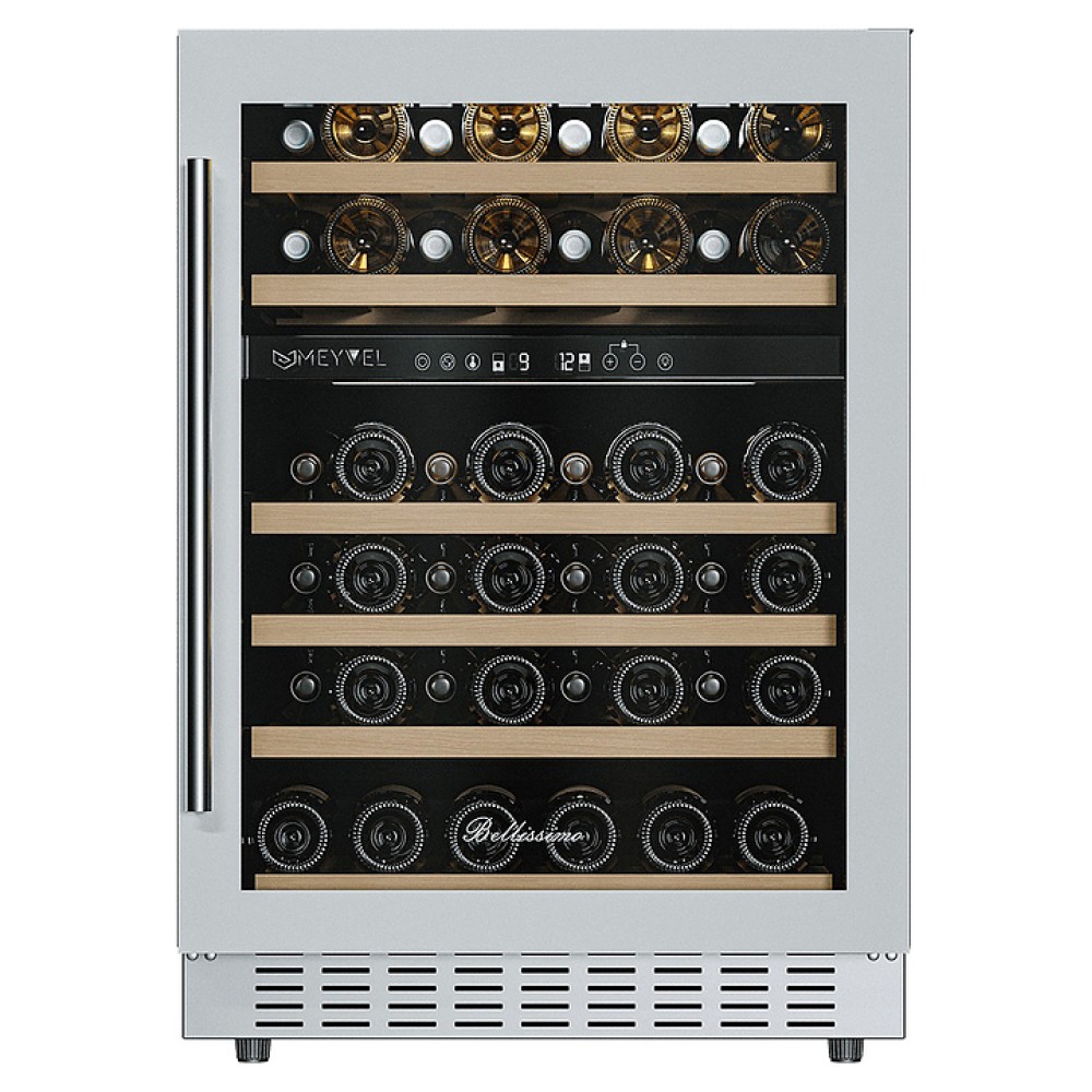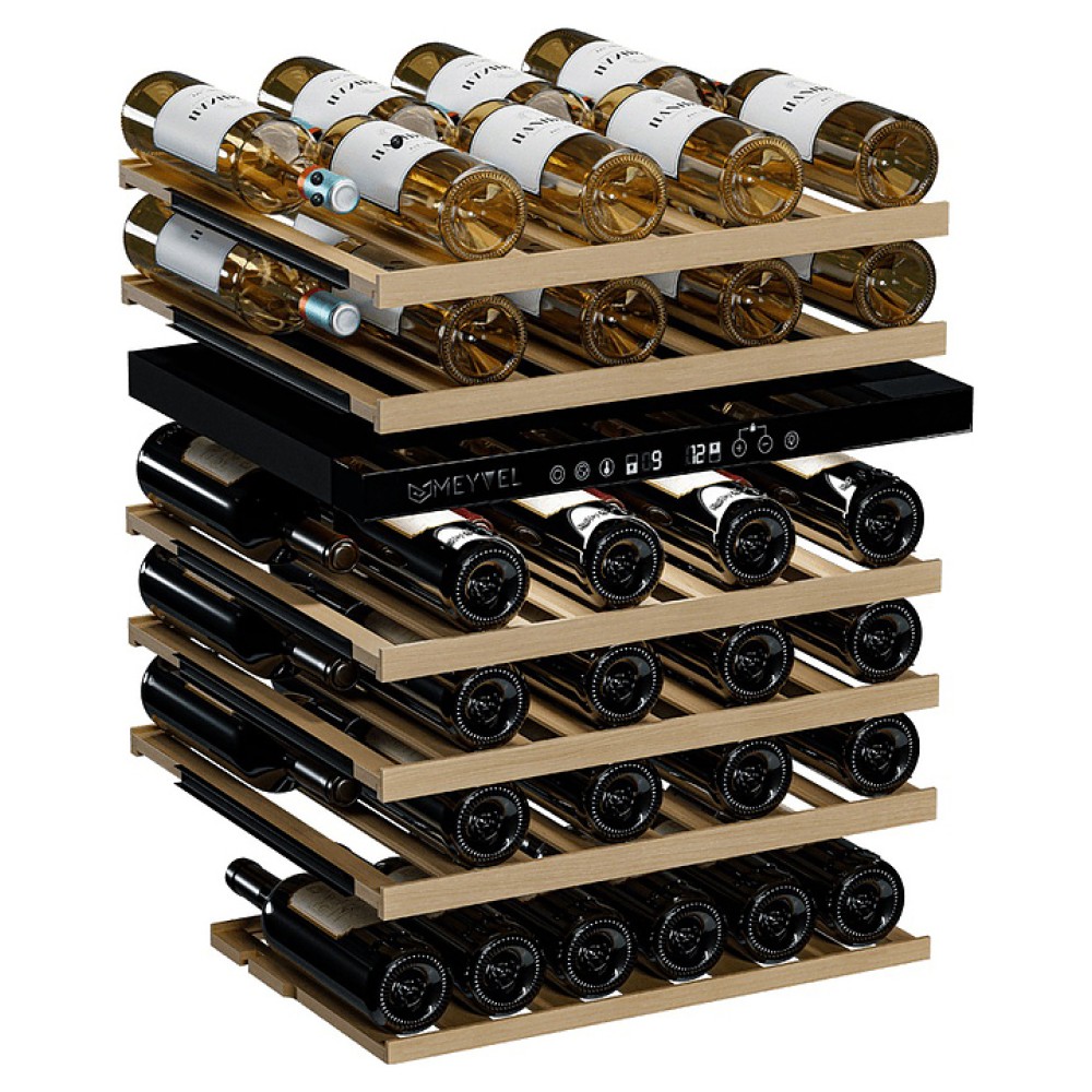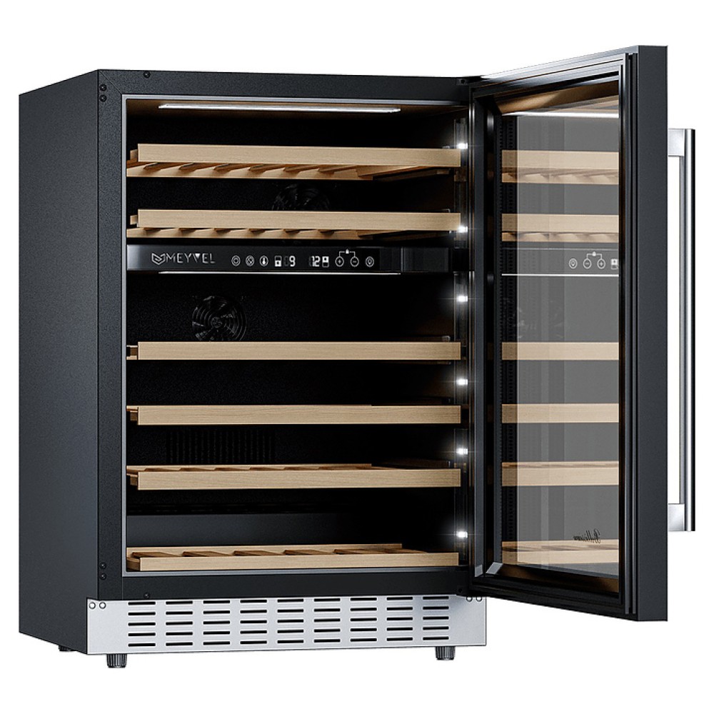Винный шкаф MEYVEL MV46PRO-KWT2 предназначен для демонстрации, хранения и создания оптимальных условий для сохранения всех вкусовых свойств вина в бутылках на предприятиях общественного питания, торговли, в барах, ресторанах, специализированных магазинах, частных домах или квартирах. Модель оснащена сенсорной панелью управления, 2 электронными термостатами и внутренней белой светодиодной подсветкой. Корпус выполнен из окрашенной в черный цвет стали, дверь - из тройного стекла с УФ защитой с белой рамкой, полки - из массива бука.