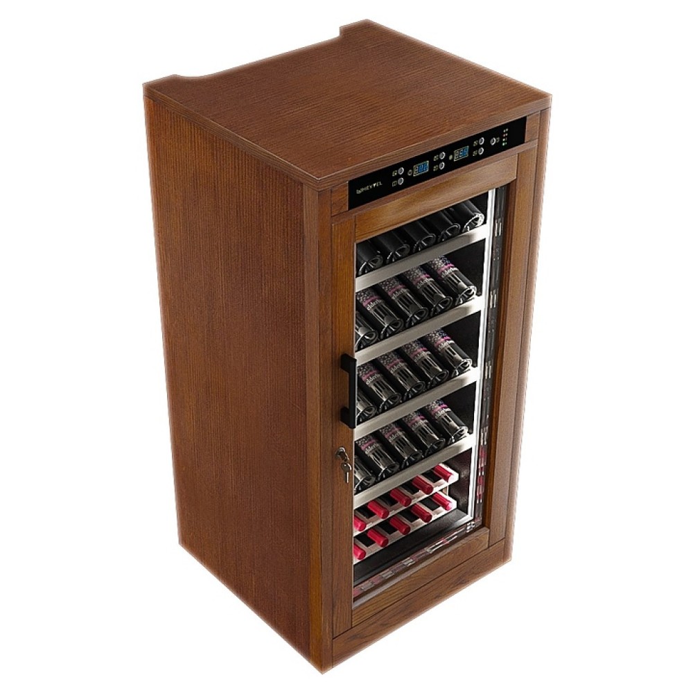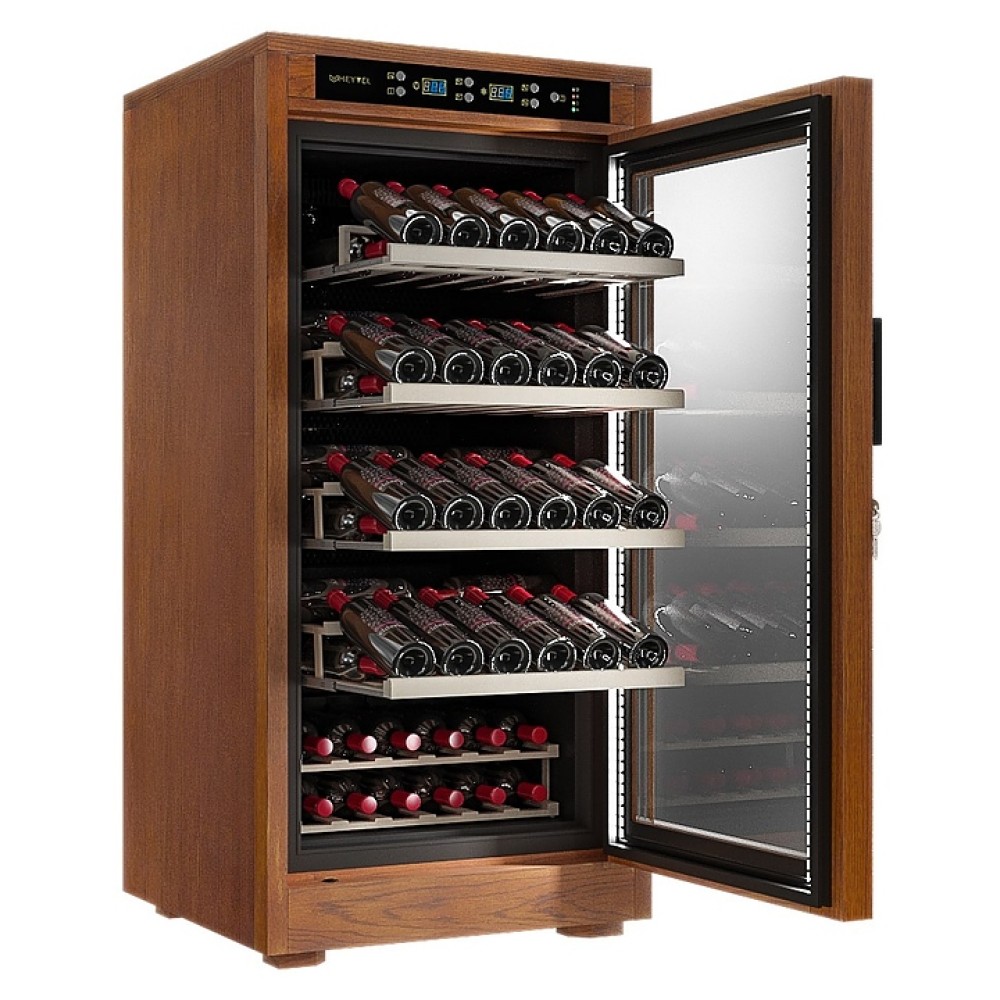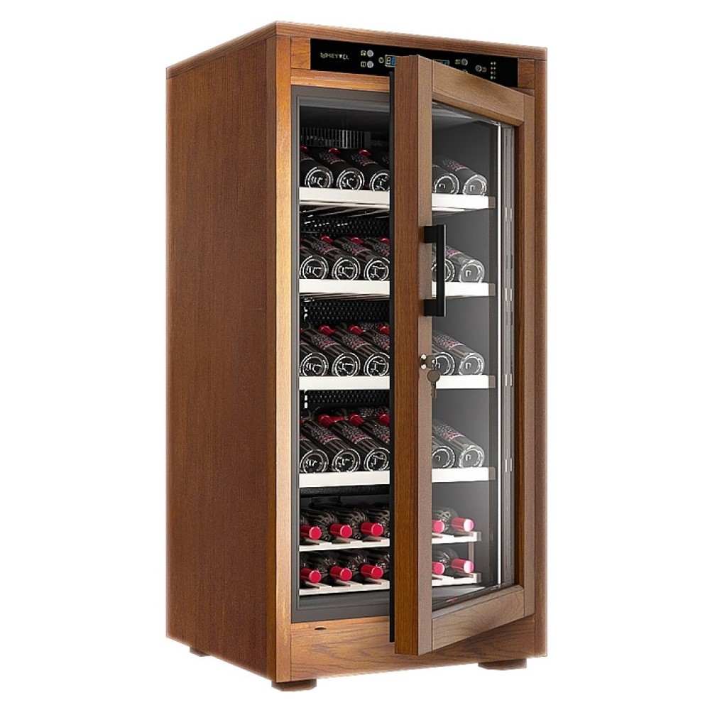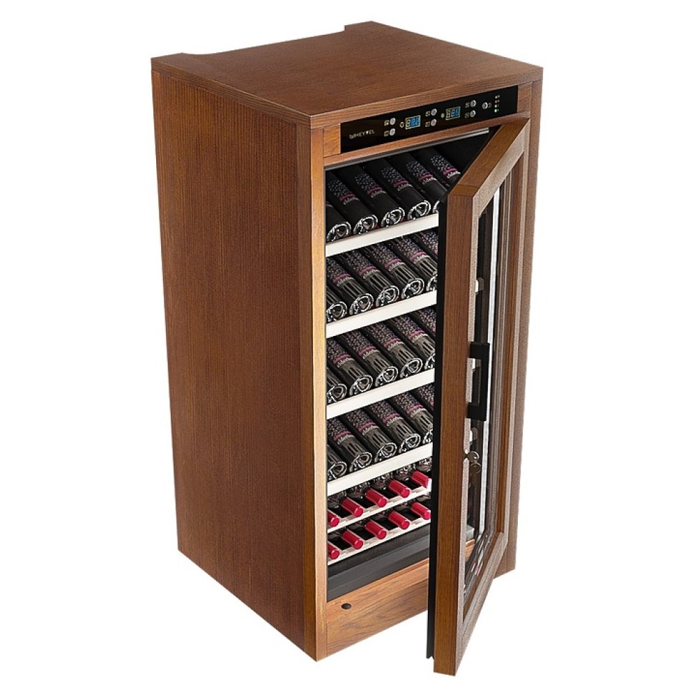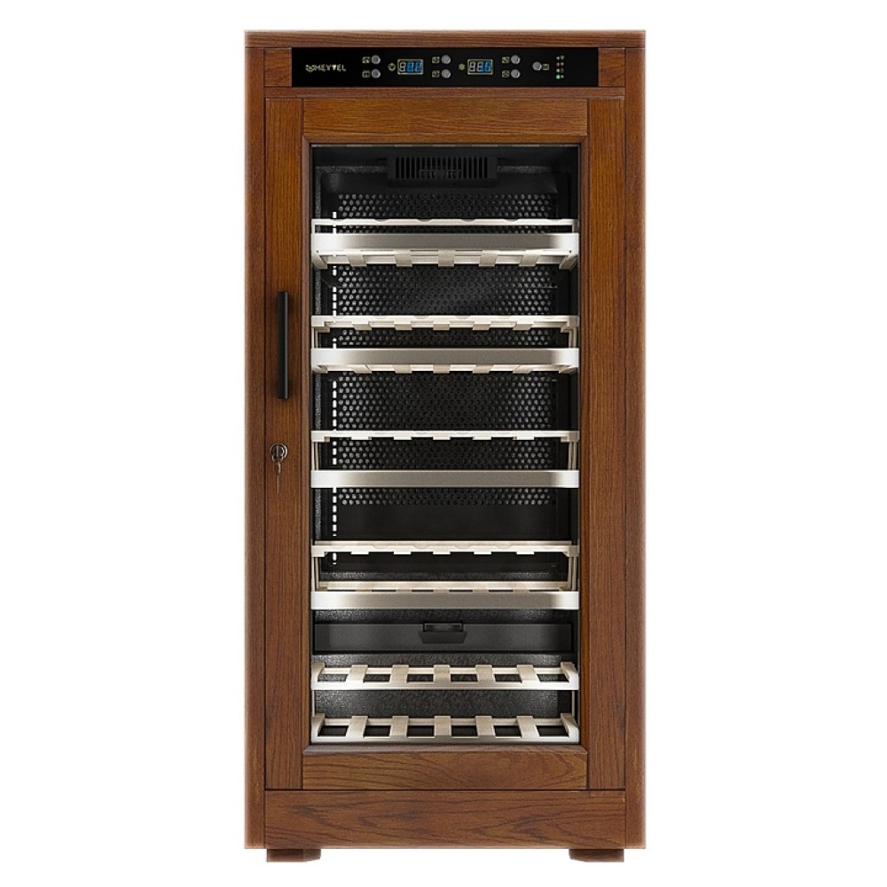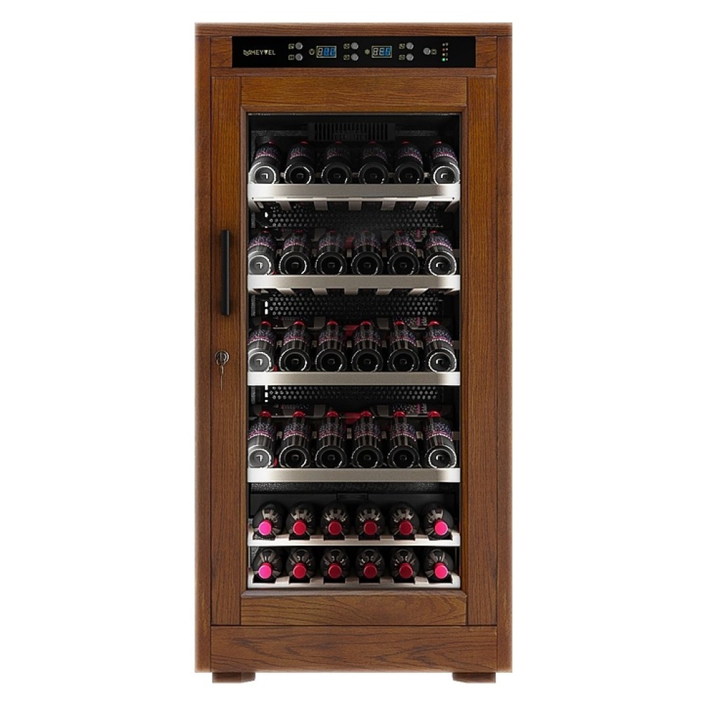 Винный шкаф MEYVEL MV66-WN1-C предназначен для демонстрации, хранения и создания оптимальных условий для сохранения всех вкусовых свойств вина в бутылках на предприятиях общественного питания, торговли, в барах, ресторанах, специализированных магазинах, частных домах или квартирах. Модель оснащена сенсорной панелью управления, электронным термостатом и светодиодной подсветкой. Корпус выполнен из обшитой деревом стали, дверь - из деревянной рамы и двойного стекла с защитой от ультрафиолетовых лучей, полки - из массива бука, ручка двери - черного цвета.
