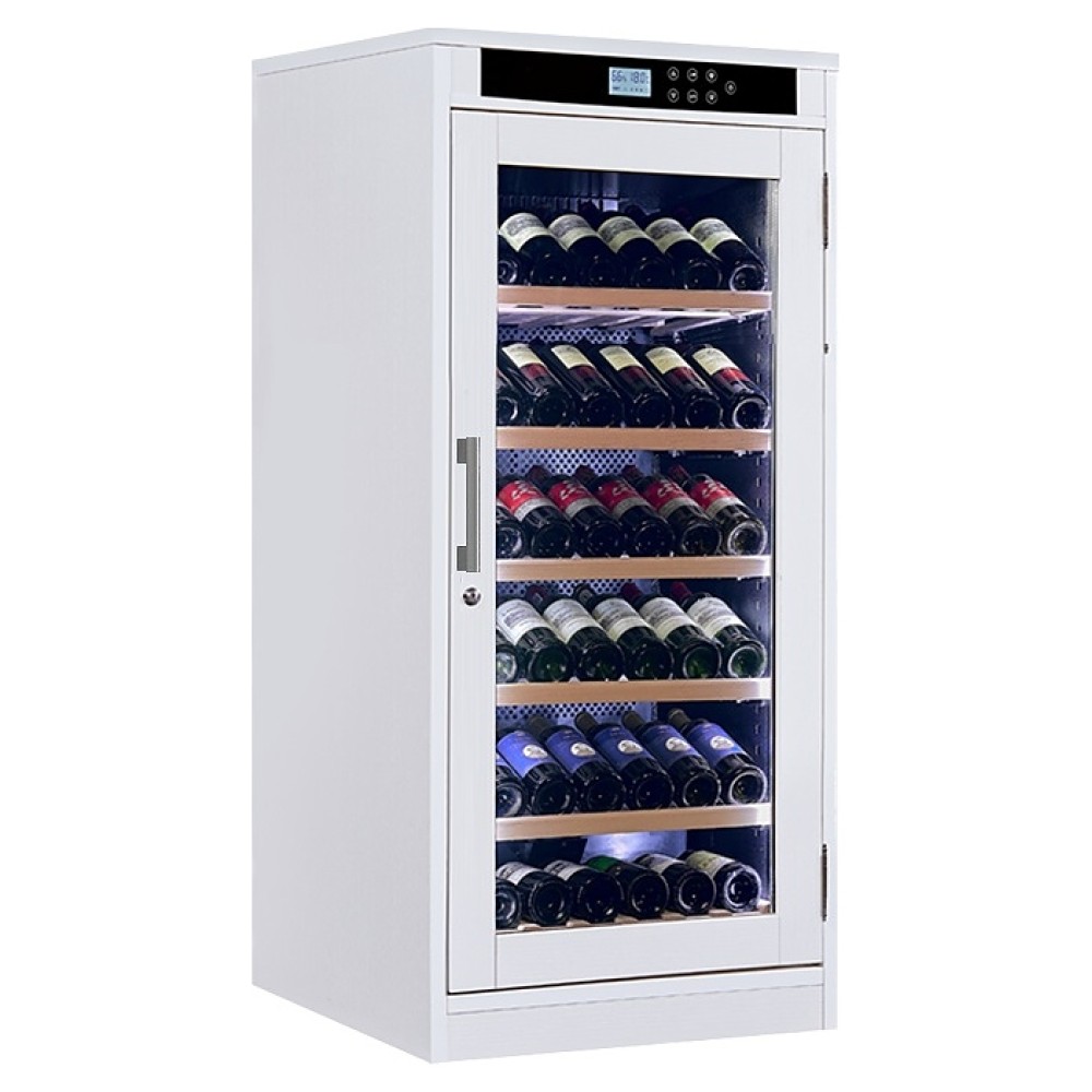 Винный шкаф MEYVEL MV69-WM1-M (White Snow) серии Modern предназначен для хранения при оптимальных условиях бутилированного вина различных сортов в барах, ресторанах, специализированных магазинах, подсобных складских помещениях, гостиницах, а также домашних условиях. Модель оснащена монотемпературной холодильной камерой, распашной дверью на внешних петлях, прозрачным обзорным остеклением, кабелем питания с вилкой, внешней сенсорной панелью управления и жидкокристаллическим дисплеем индикации с подсветкой. Корпус имеет покрытие под дерево с поверхностью оттенка белый снег, фурнитура – из металла, полки – из массива древесины.