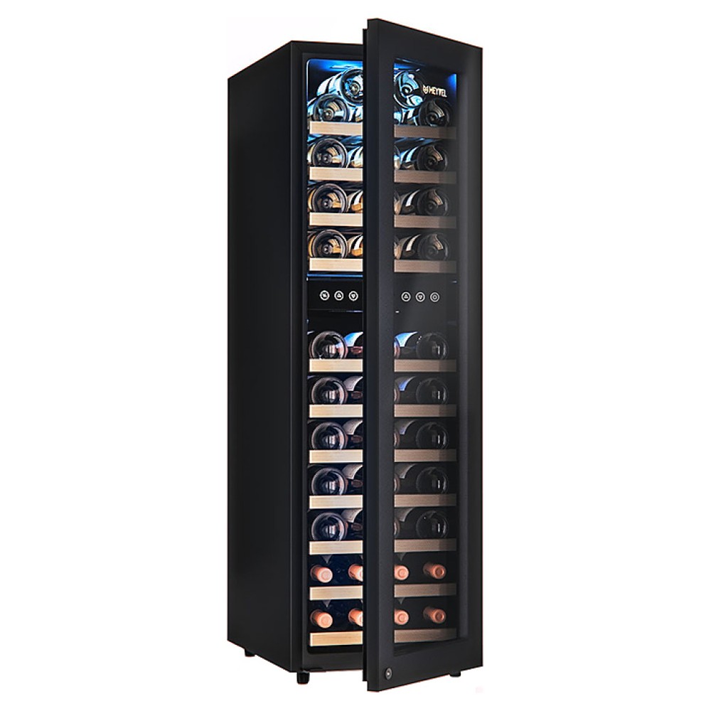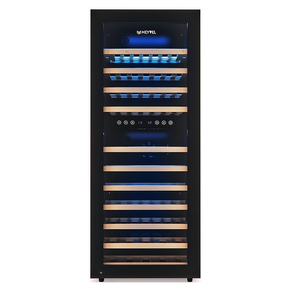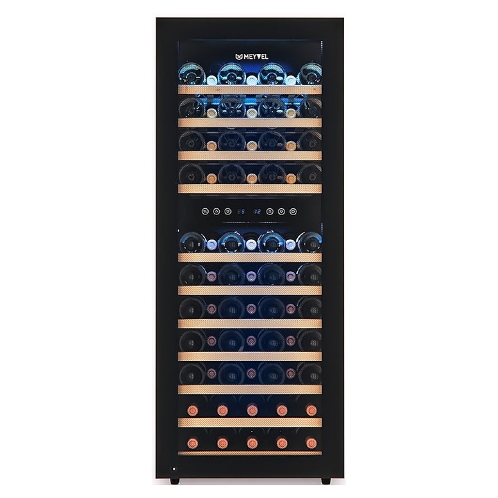 Винный шкаф MEYVEL MV73-KBF2 предназначен для демонстрации, хранения и создания оптимальных условий для сохранения всех вкусовых свойств вина в бутылках на предприятиях общественного питания, торговли, в барах, ресторанах, специализированных магазинах, частных домах или квартирах. Модель оснащена сенсорной панелью управления, электронным термостатом и светодиодной подсветкой синего цвета в каждой зоне. Корпус выполнен из окрашенной в черный цвет стали, дверь - из черной рамы и тонированного стекла с защитой от ультрафиолетовых лучей, полки - из массива бука.