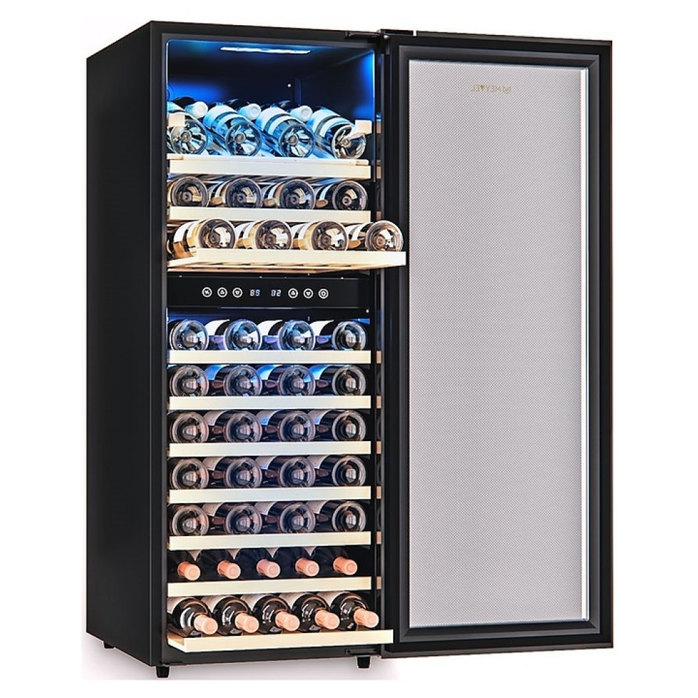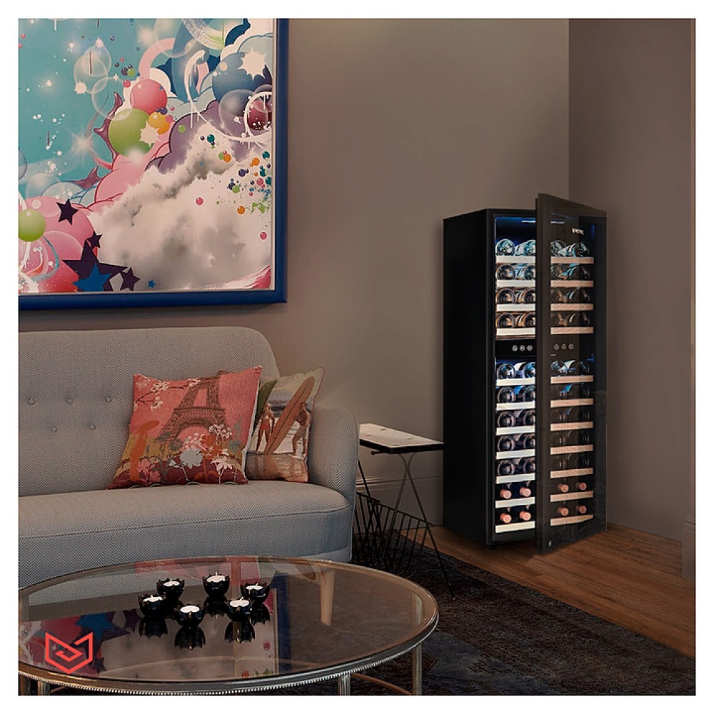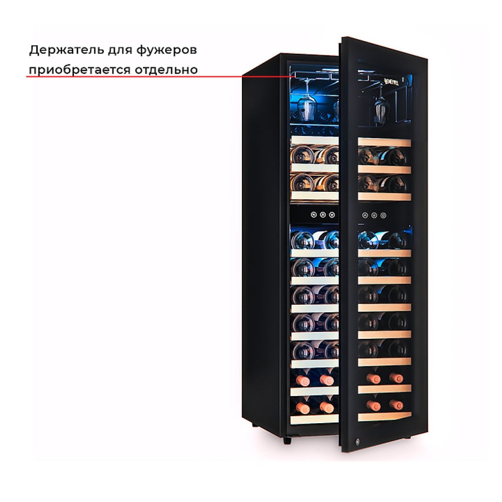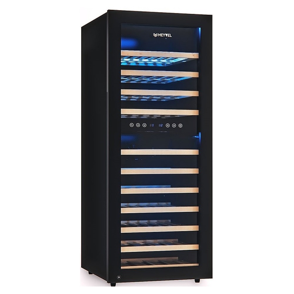 Винный шкаф MEYVEL MV73-KBF2 предназначен для демонстрации, хранения и создания оптимальных условий для сохранения всех вкусовых свойств вина в бутылках на предприятиях общественного питания, торговли, в барах, ресторанах, специализированных магазинах, частных домах или квартирах. Модель оснащена сенсорной панелью управления, электронным термостатом и светодиодной подсветкой синего цвета в каждой зоне. Корпус выполнен из окрашенной в черный цвет стали, дверь - из черной рамы и тонированного стекла с защитой от ультрафиолетовых лучей, полки - из массива бука.