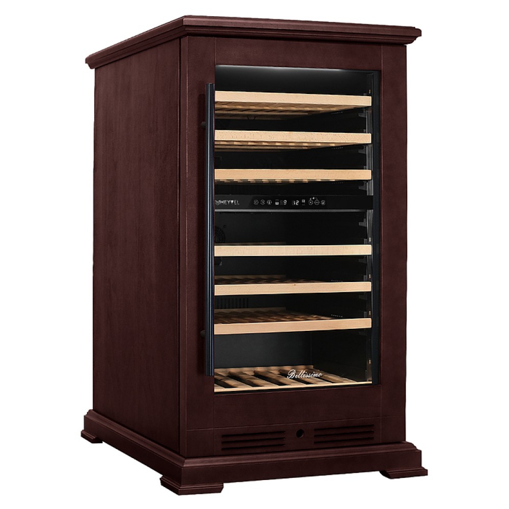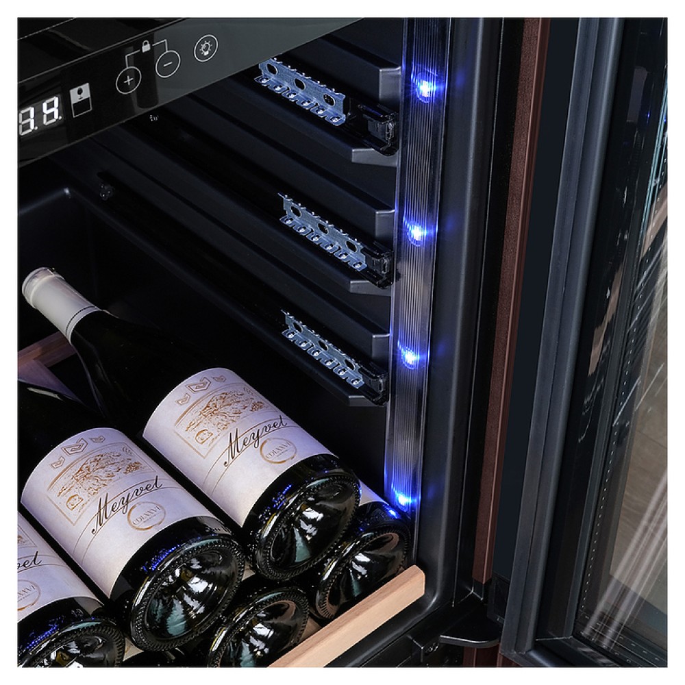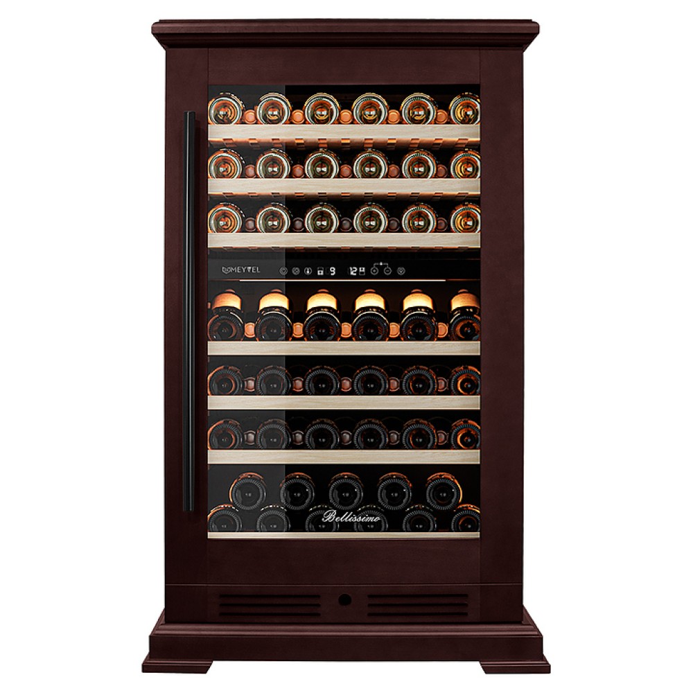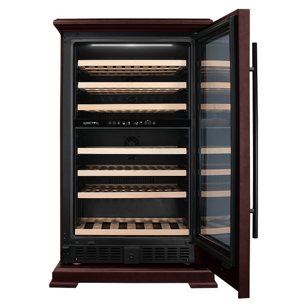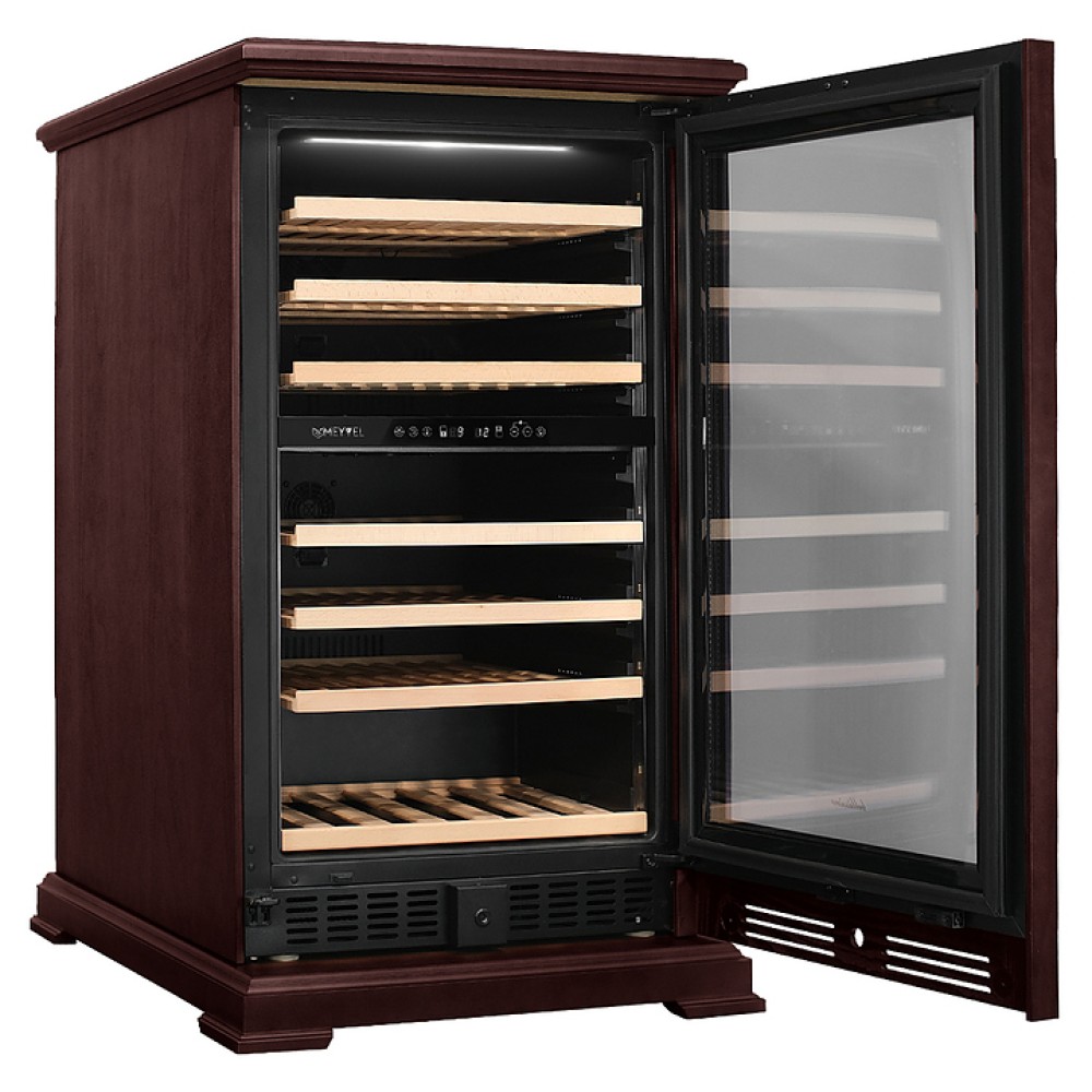 Винный шкаф MEYVEL MV77PRO-KBT2 предназначен для демонстрации, хранения и создания оптимальных условий для сохранения всех вкусовых свойств вина в бутылках на предприятиях общественного питания, торговли, в барах, ресторанах, специализированных магазинах, частных домах или квартирах. Модель оснащена интуитивно-понятной сенсорной панелью управления, электронным термостатом и внутренней светодиодной подсветкой. Корпус выполнен из стали с обшивкой из натурального шпона бука, дверь - из тройного стекла с УФ защитой, полки - из массива бука.