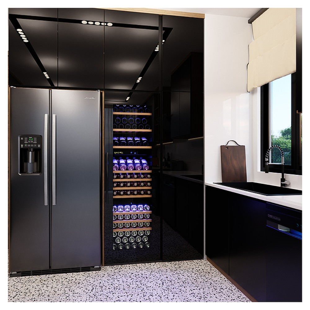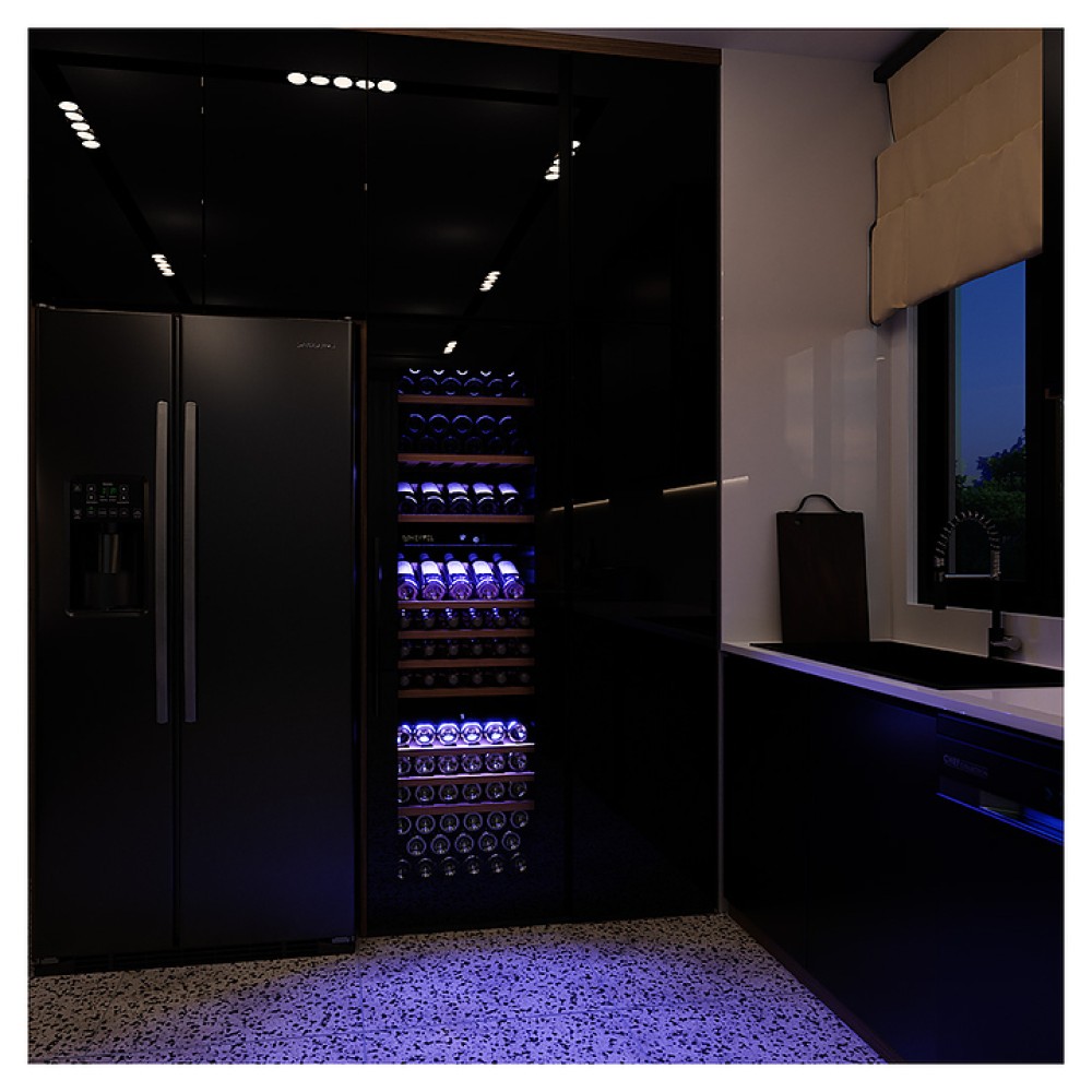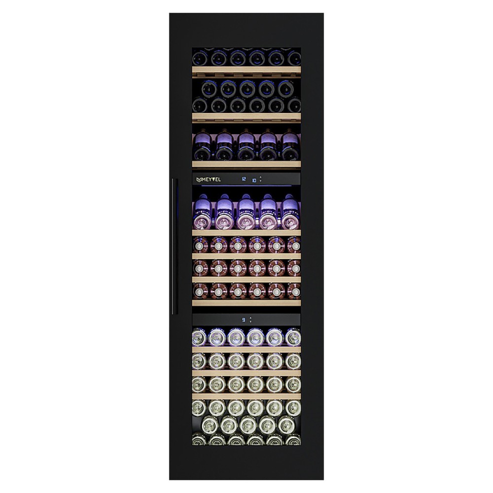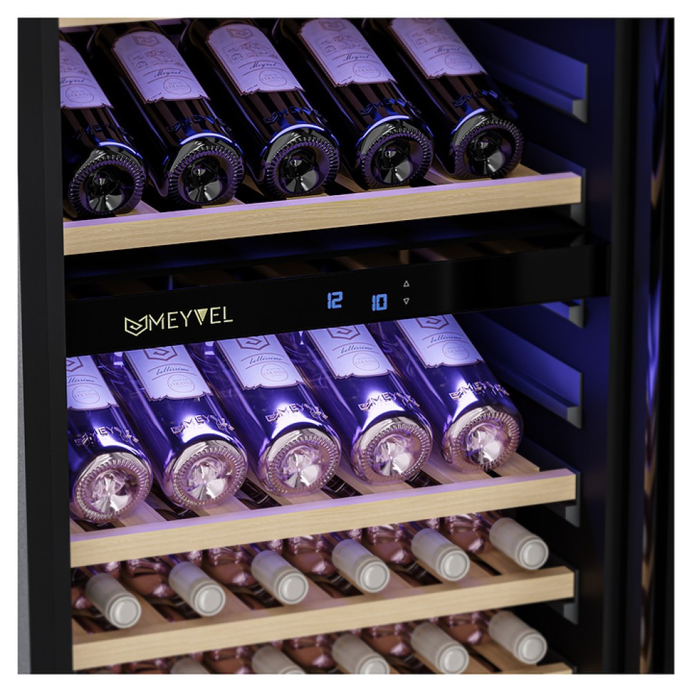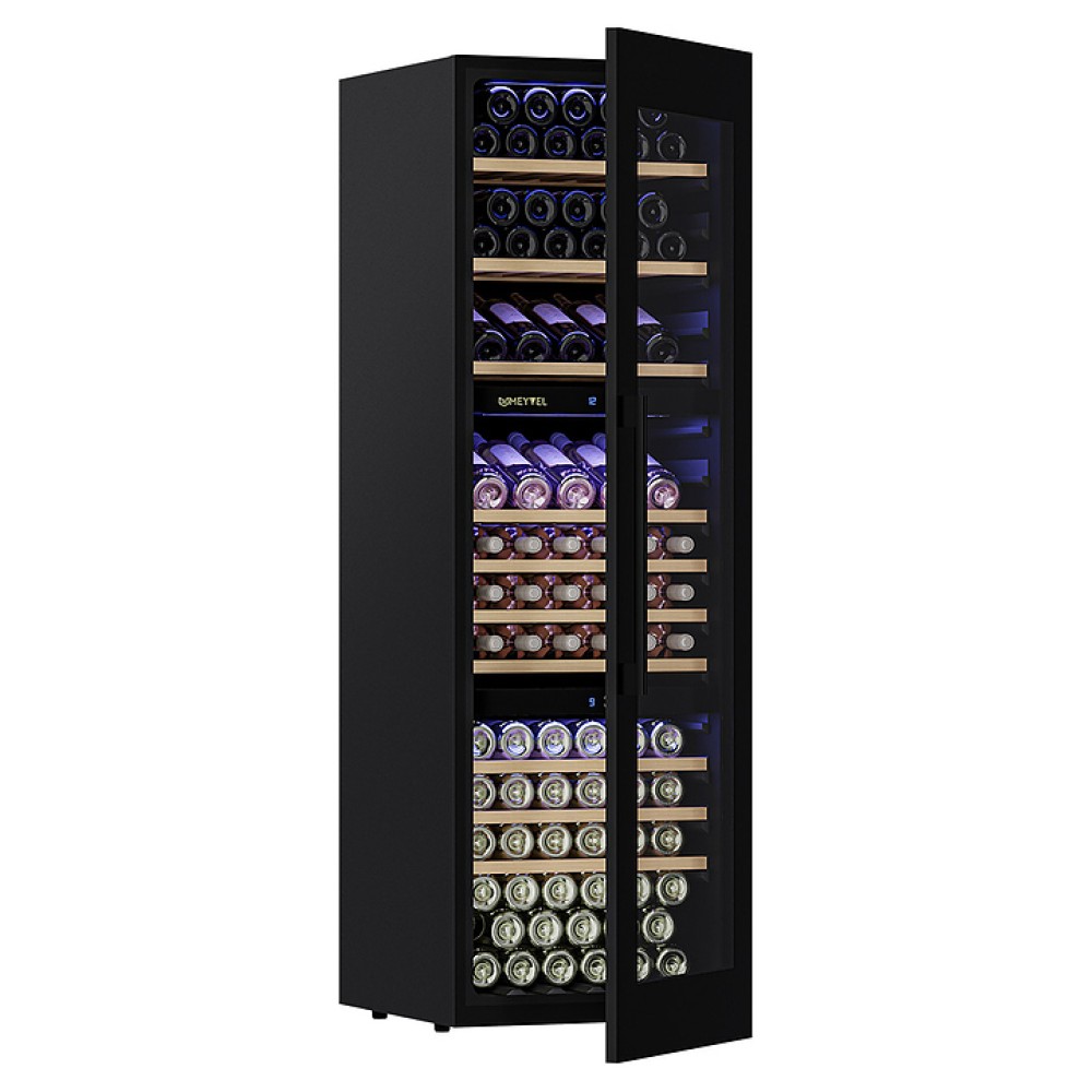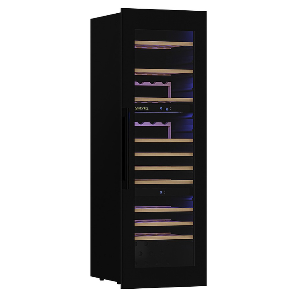 Винный шкаф MEYVEL MV89-KBВ3 предназначен для демонстрации, хранения и создания оптимальных условий для сохранения всех вкусовых свойств вина в бутылках на предприятиях общественного питания, торговли, в барах, ресторанах, специализированных магазинах, частных домах или квартирах. Модель оснащена сенсорной панелью управления, электронным термостатом и внутренней синей светодиодной подсветкой. Корпус и дверная ручка выполнены из окрашенной в черный цвет стали, дверь - из двойного стекла с УФ защитой с черной рамкой, полки - из массива бука.