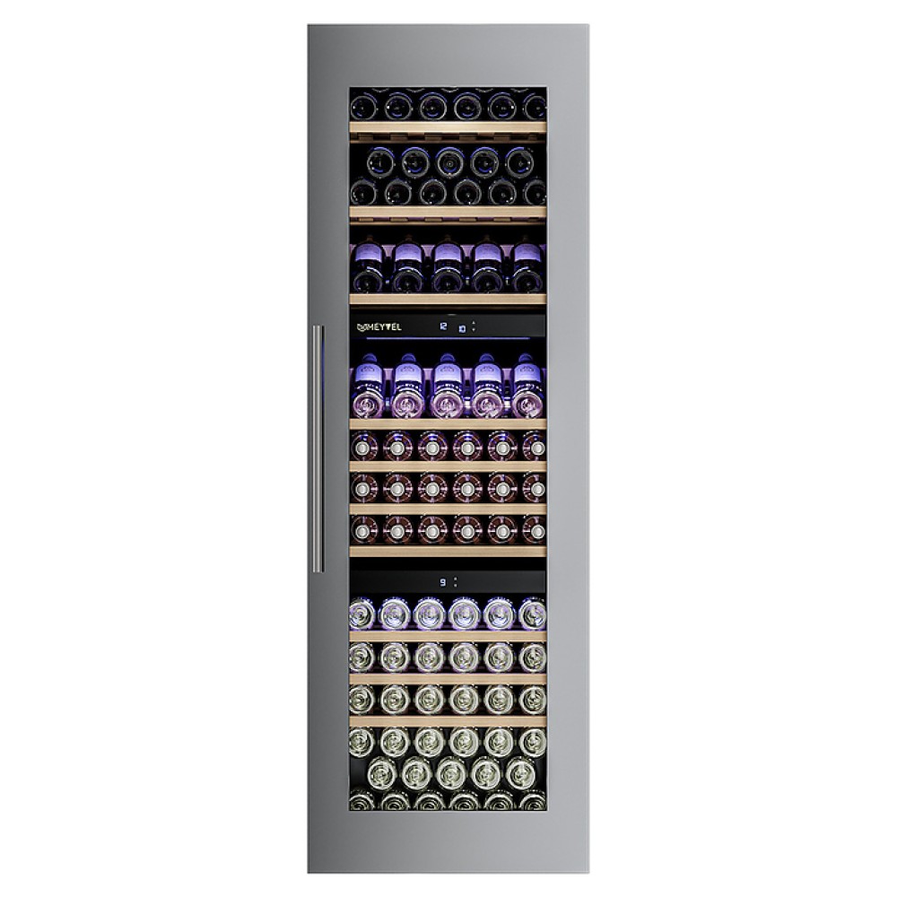 Винный шкаф MEYVEL MV89-KSB3 предназначен для демонстрации, хранения и создания оптимальных условий для сохранения всех вкусовых свойств вина в бутылках на предприятиях общественного питания, торговли, в барах, ресторанах, специализированных магазинах, частных домах или квартирах. Модель оснащена сенсорной панелью управления, электронным термостатом и внутренней синей светодиодной подсветкой. Корпус выполнен из окрашенной в черный цвет стали, дверь - из двойного стекла с УФ защитой, полки - из массива бука, дверная рама и ручка - из нержавеющей стали.