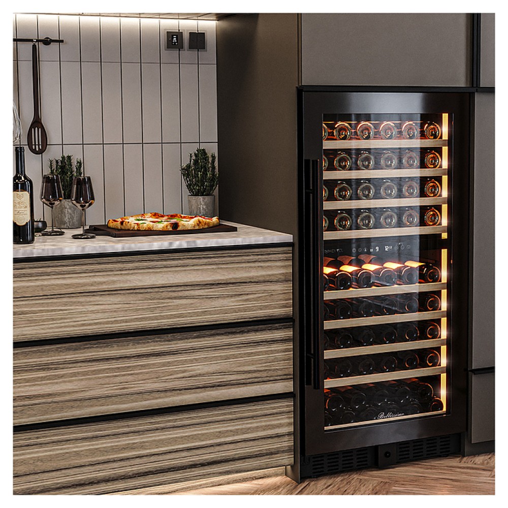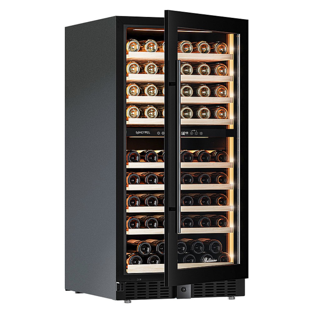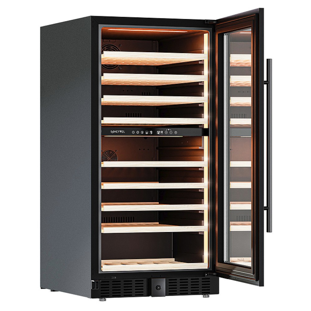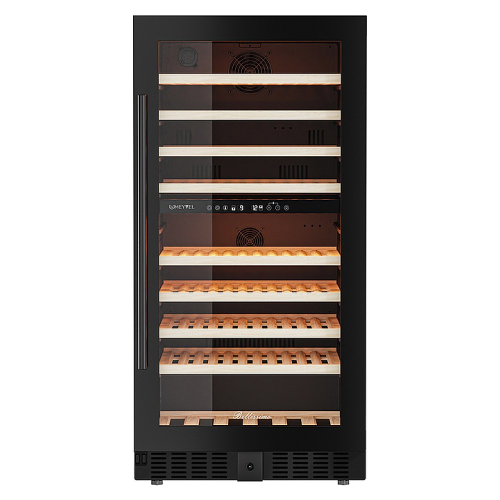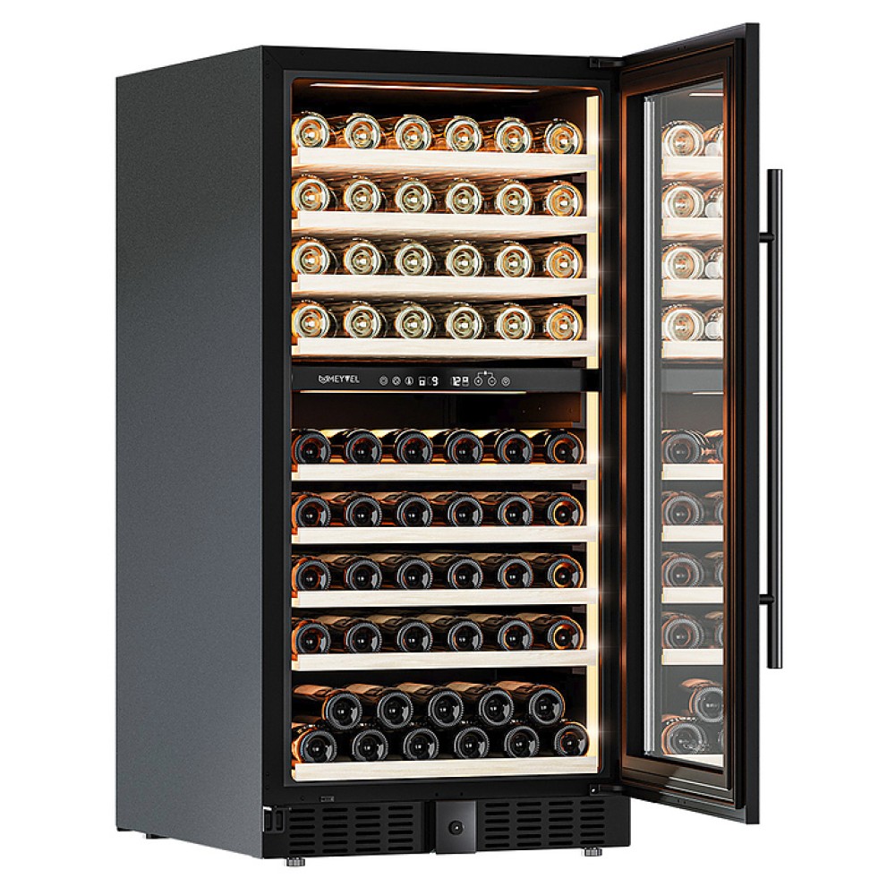 Винный шкаф MEYVEL MV99PRO-KBT2 предназначен для демонстрации, хранения и создания оптимальных условий для сохранения всех вкусовых свойств вина в бутылках на предприятиях общественного питания, торговли, в барах, ресторанах, специализированных магазинах, частных домах или квартирах. Модель оснащена сенсорной панелью управления, 2 электронными термостатами и внутренней светодиодной подсветкой. Корпус и дверная ручка выполнены из окрашенной в черный цвет стали, дверь - из тройного стекла с УФ защитой с черной рамкой, полки - из массива бука.