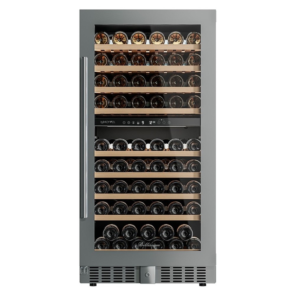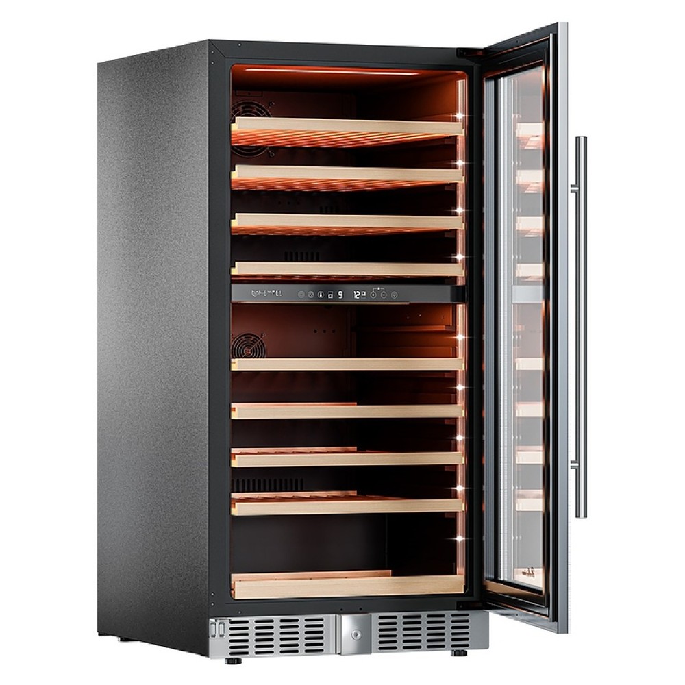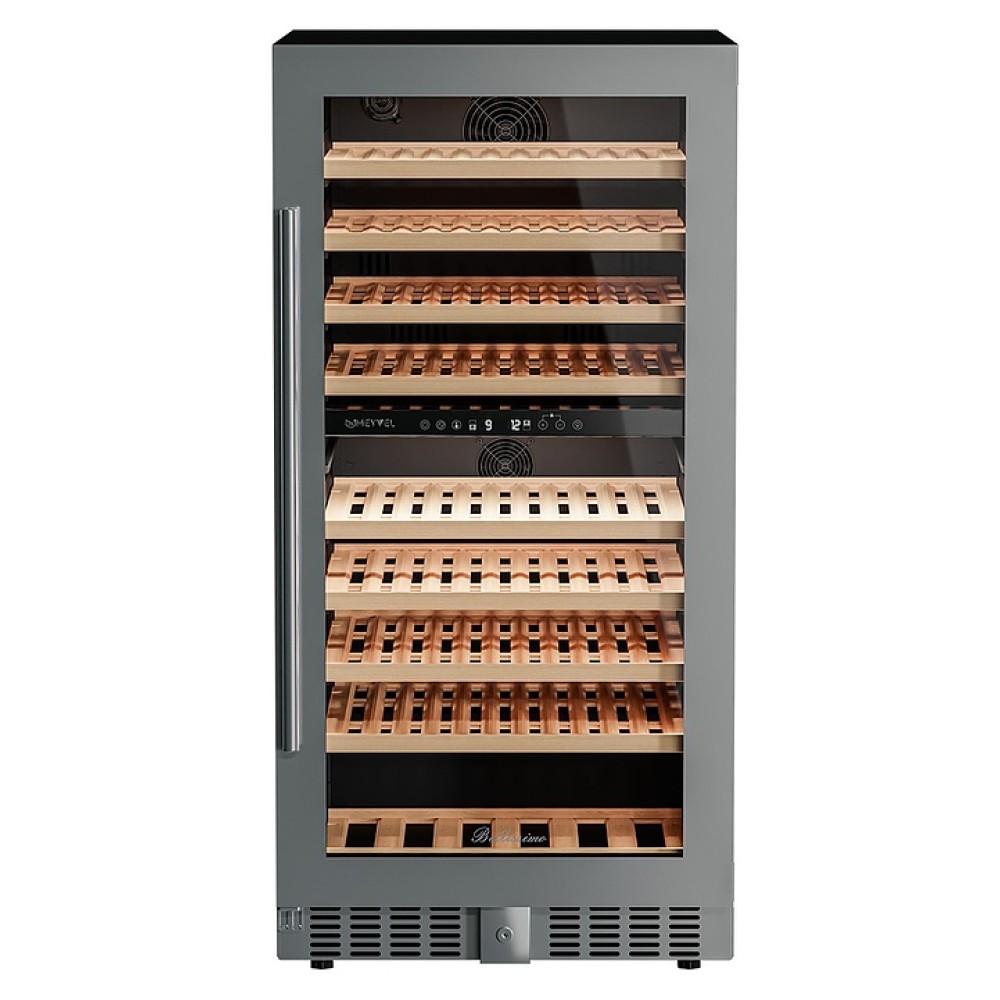 Винный шкаф MEYVEL MV99PRO-KST2 предназначен для демонстрации, хранения и создания оптимальных условий для сохранения всех вкусовых свойств вина в бутылках на предприятиях общественного питания, торговли, в барах, ресторанах, специализированных магазинах, частных домах или квартирах. Модель оснащена сенсорной панелью управления, электронным термостатом, понорамной светодиодной подсветкой, замком, угольным фильтром, 9 выкатными полками и регулируемыми по высоте ножками. Корпус выполнен из окрашенной в черный цвет стали, дверь - из тройного стеклопакета с УФ защитой, полки - из массива бука.