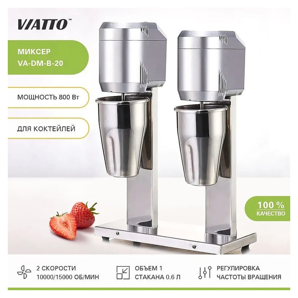 Миксер для молочных коктейлей VIATTO VA-DM-B-20 используется на предприятиях общественного питания и торговли для приготовления шейков, муссов, коктейлей на основе молока, йогуртов или мороженого. Модель оснащена устойчивыми опорами, 2 стойками с независимыми взбивателями и кнопками регулировки частоты вращения. Корпус и стаканы выполнены из нержавеющей стали, моторный блок – из алюминия.